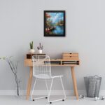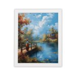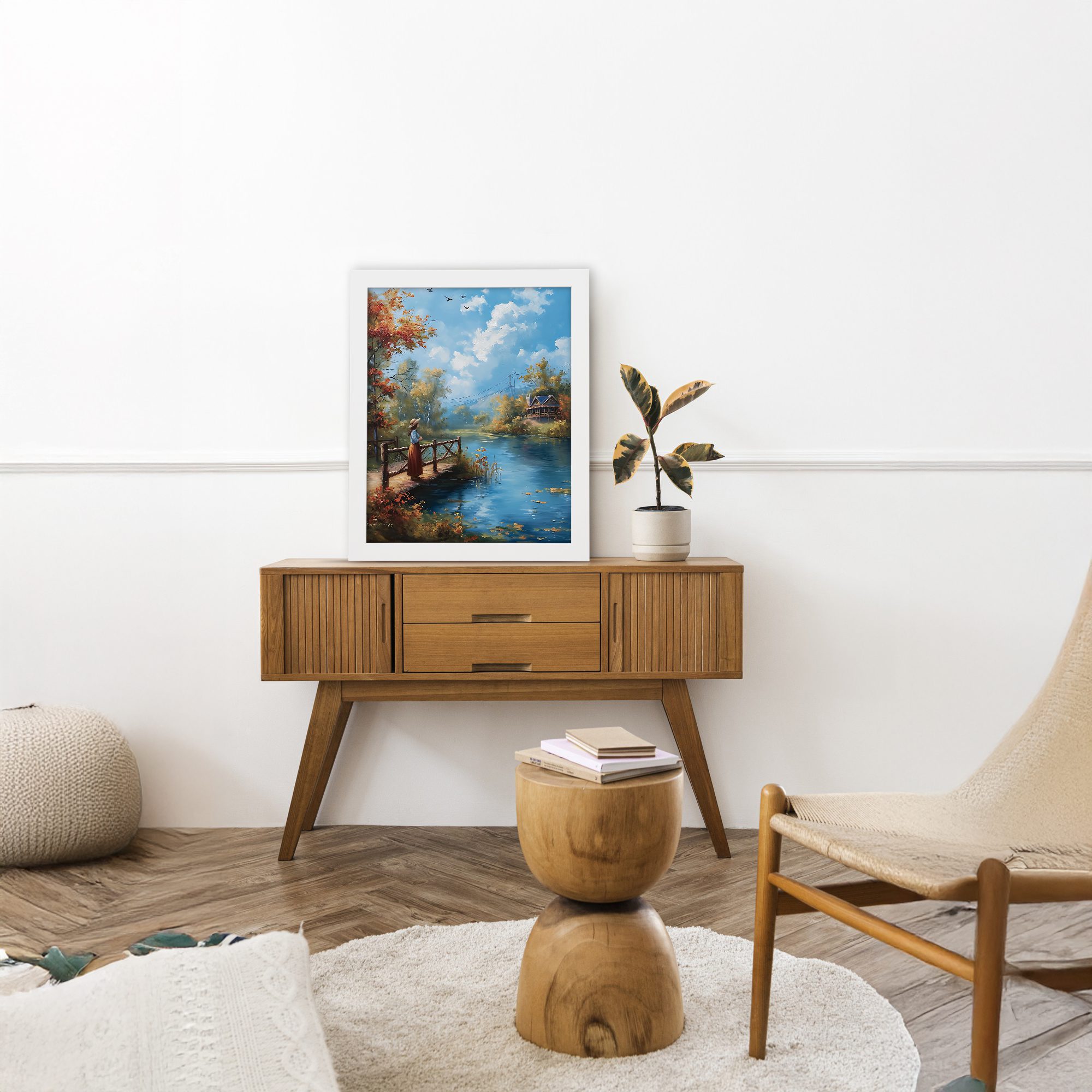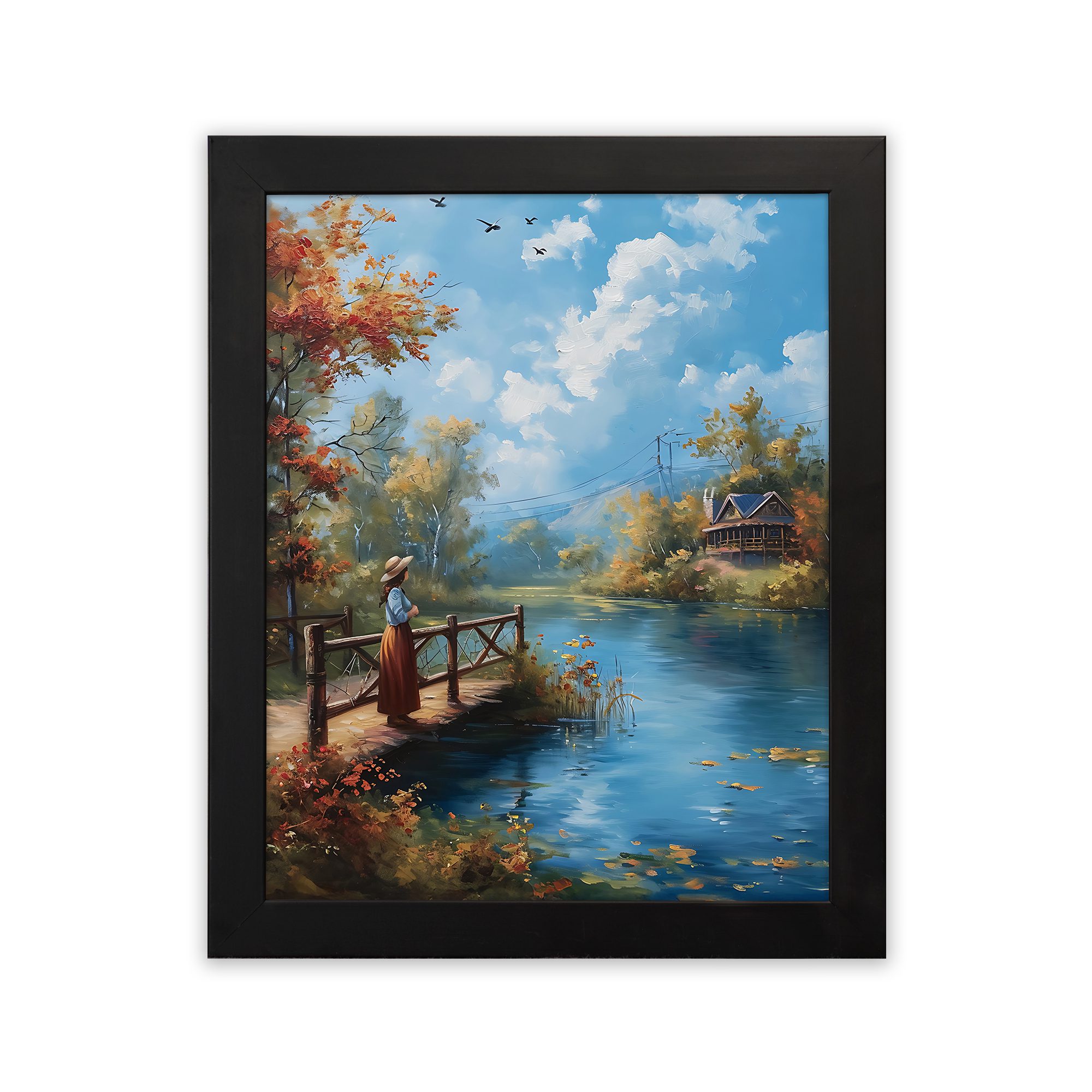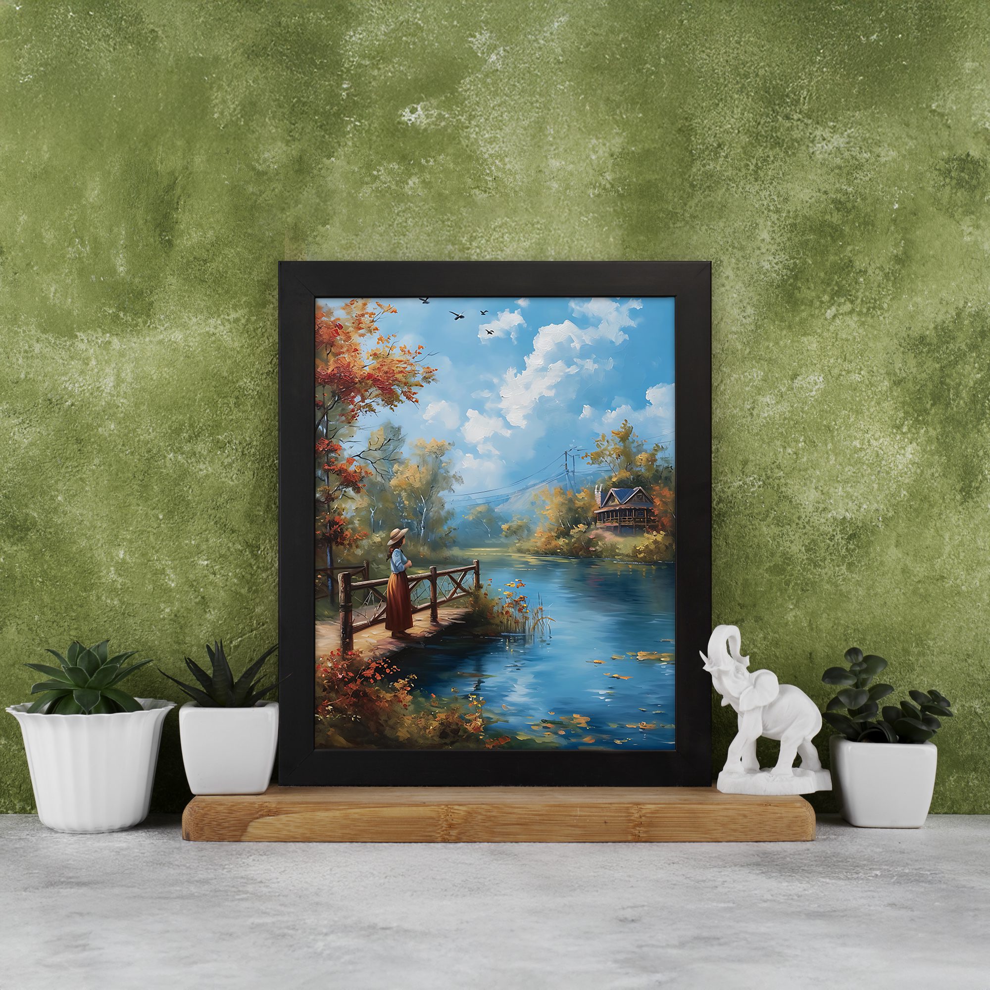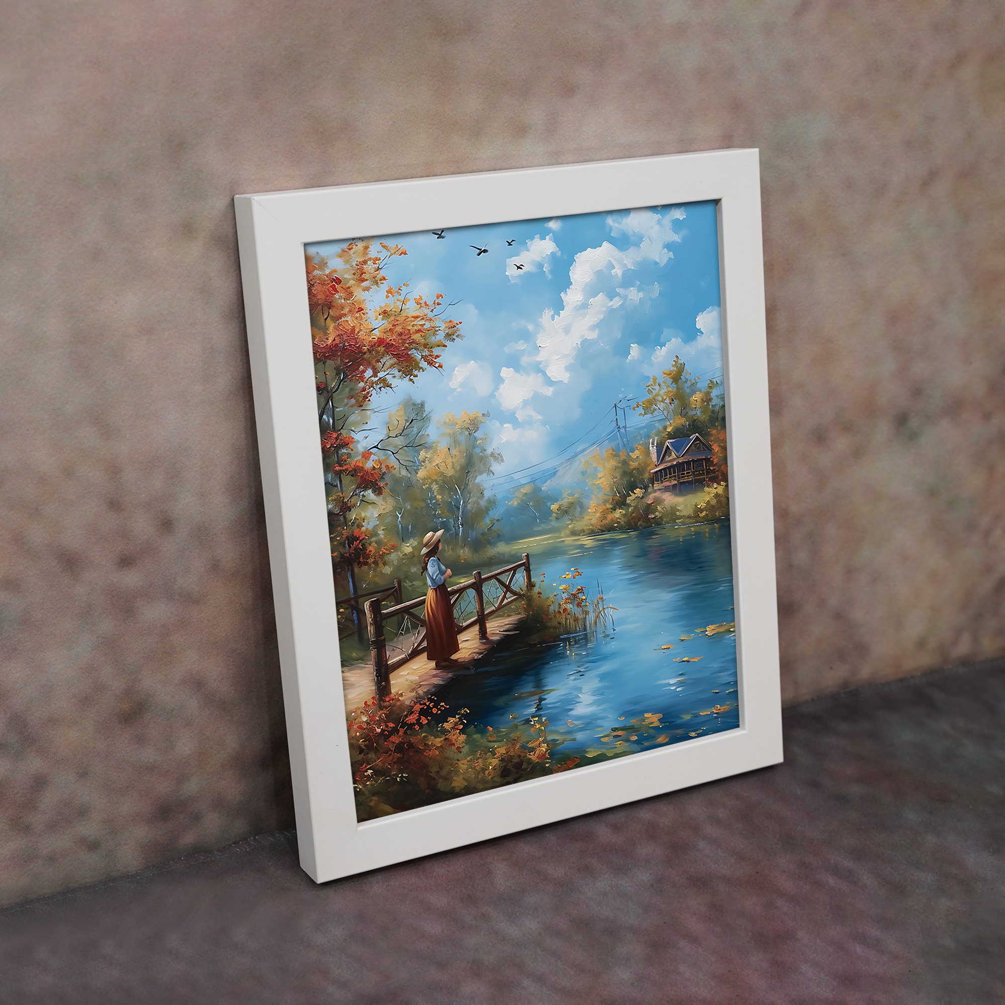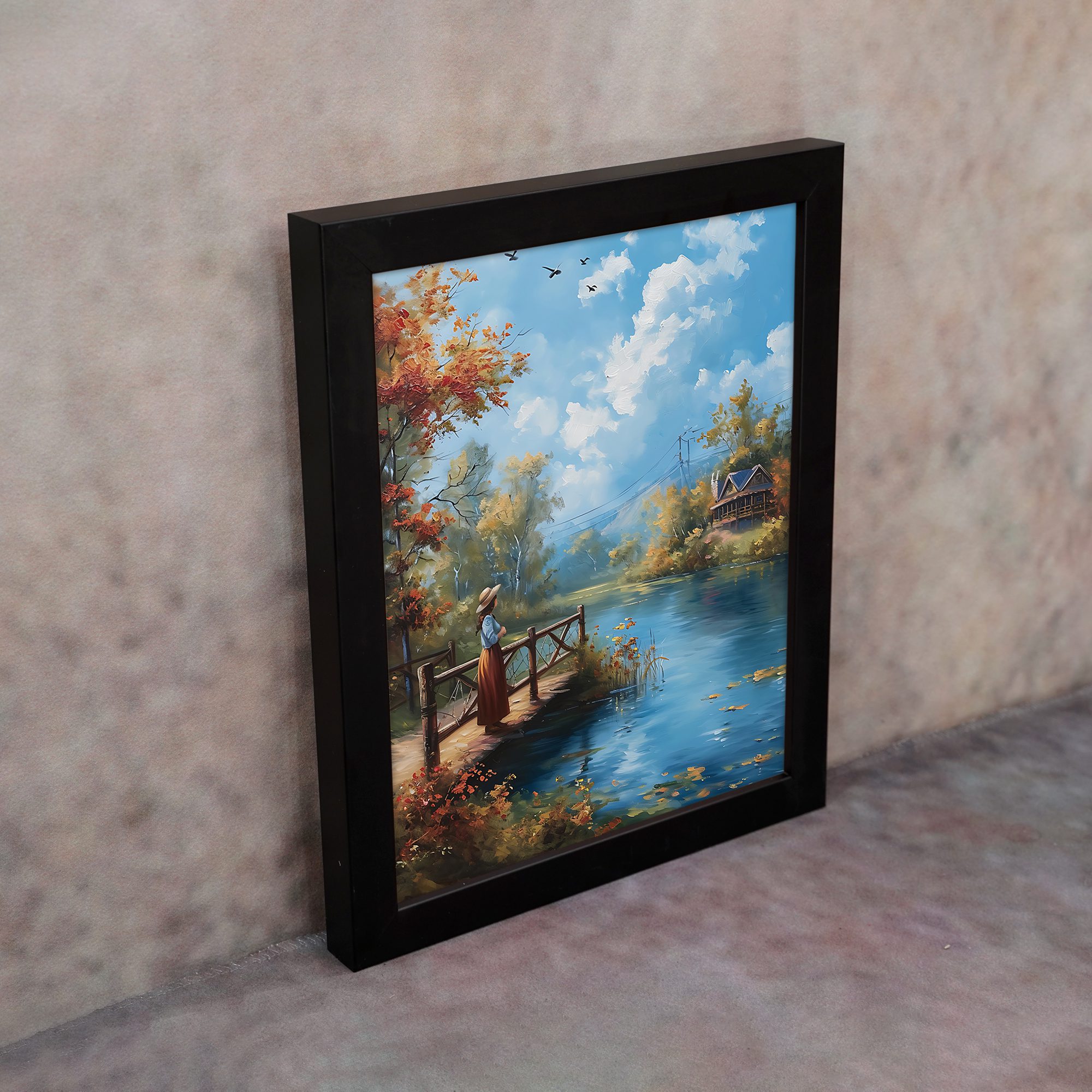 Add a peaceful and elegant touch to your space with this Lake Side Woman View Wall Art. This artwork shows a calm riverside scene where a woman stands on a small wooden deck, looking over the clear blue water. Surrounded by trees, soft clouds, and a distant house, the scene feels quiet and refreshing.