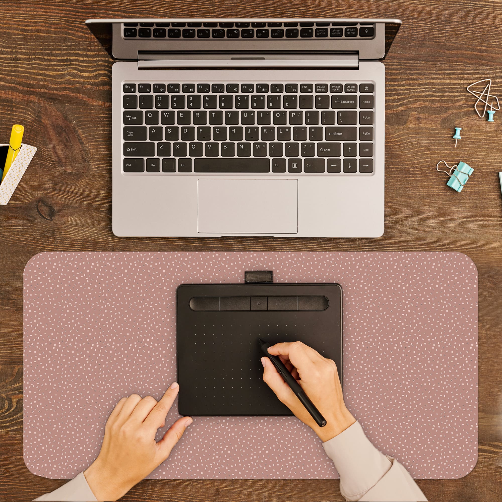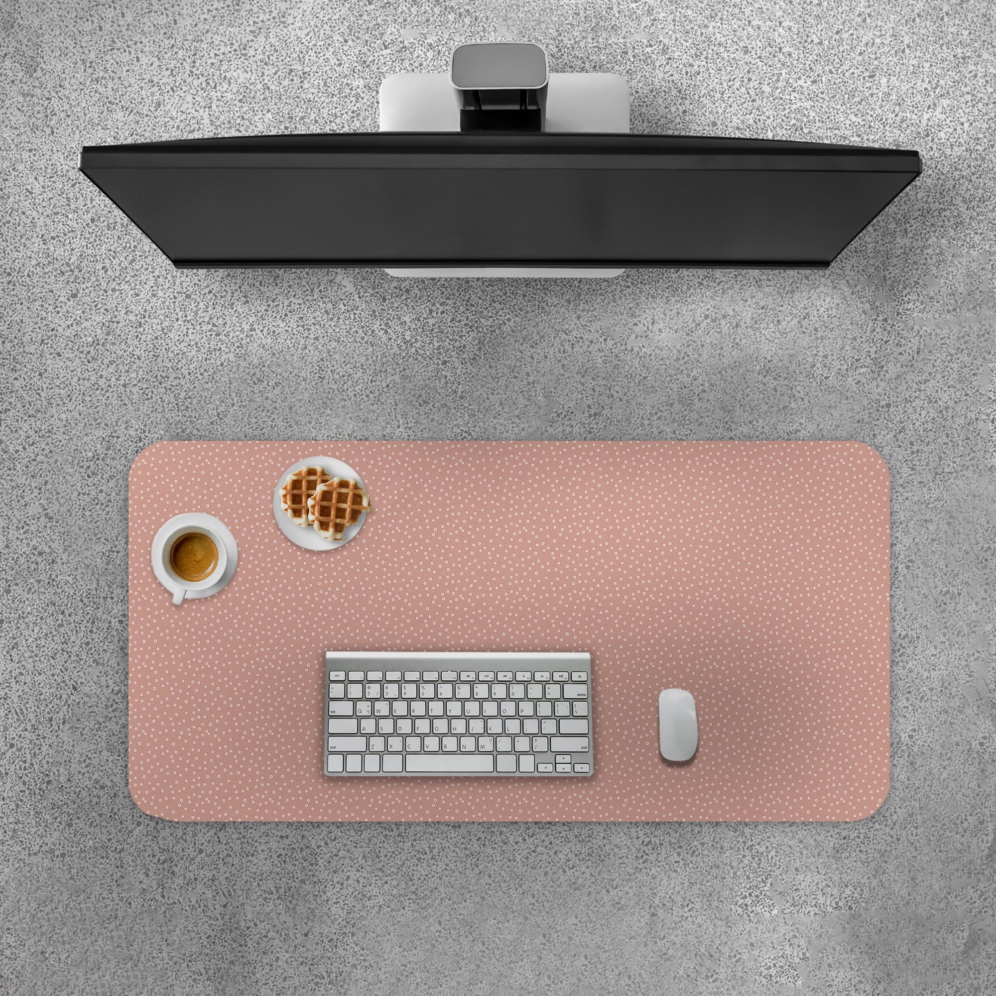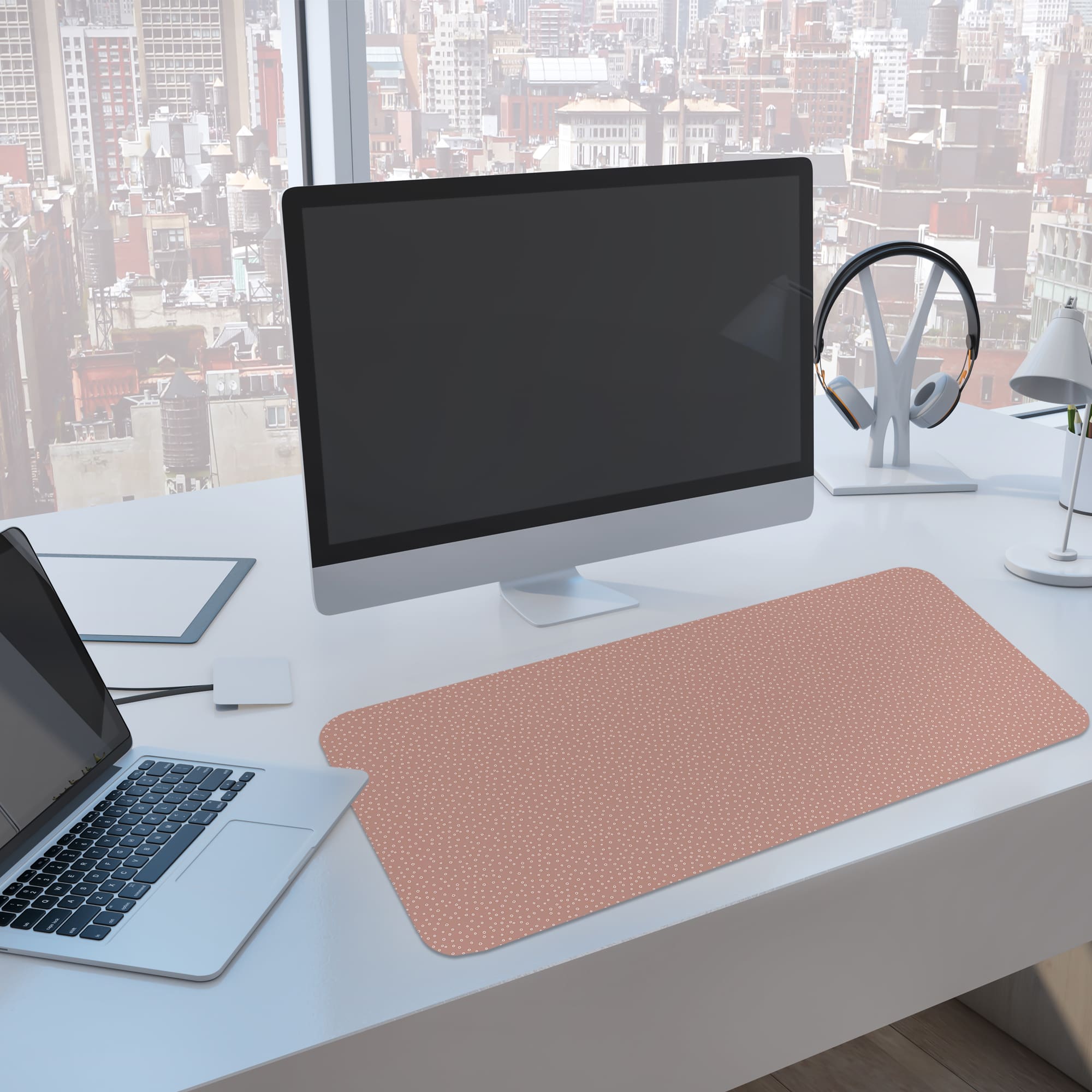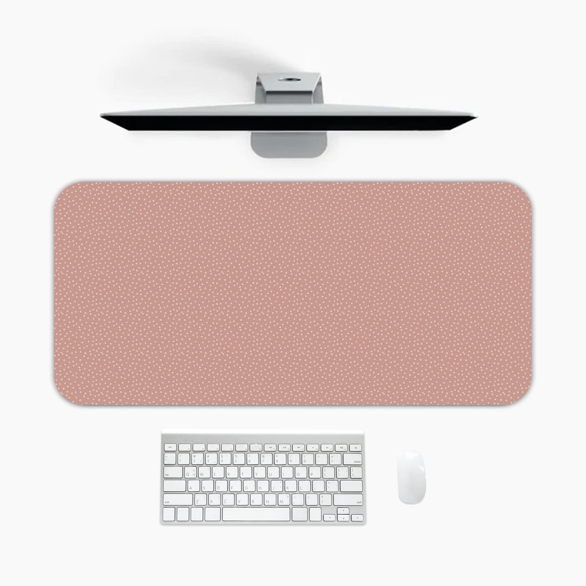 Add a soft and modern touch to your workspace with this Micro Dot Pattern Desk Mat. The design features tiny white dots evenly spread across a muted rose background, creating a smooth and refined visual texture.