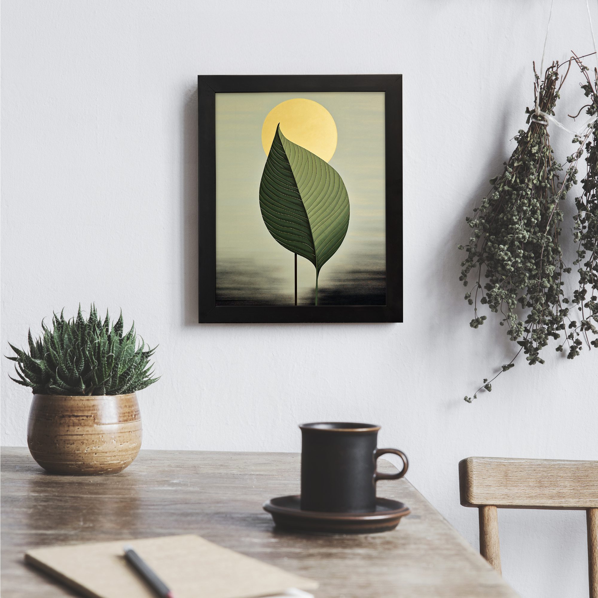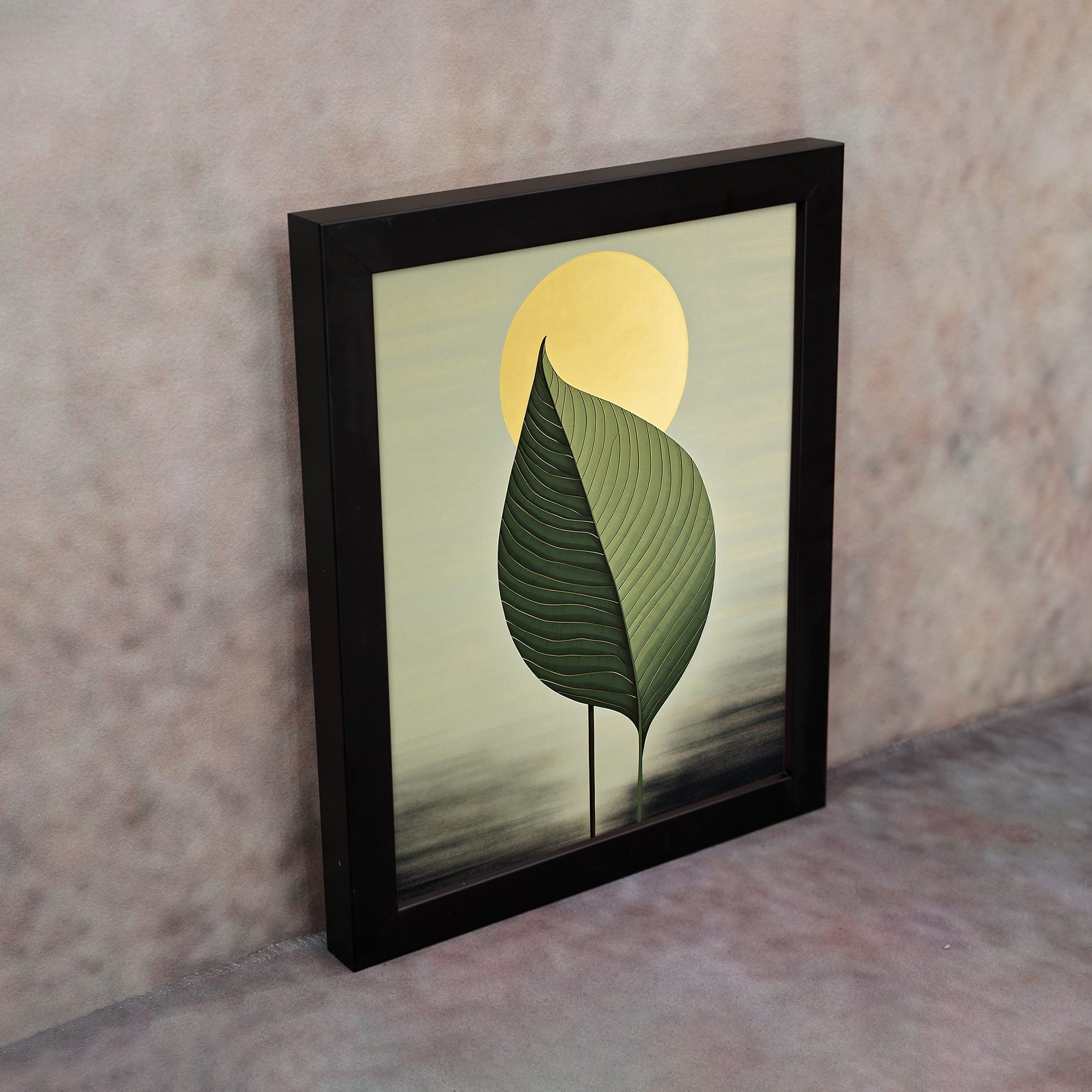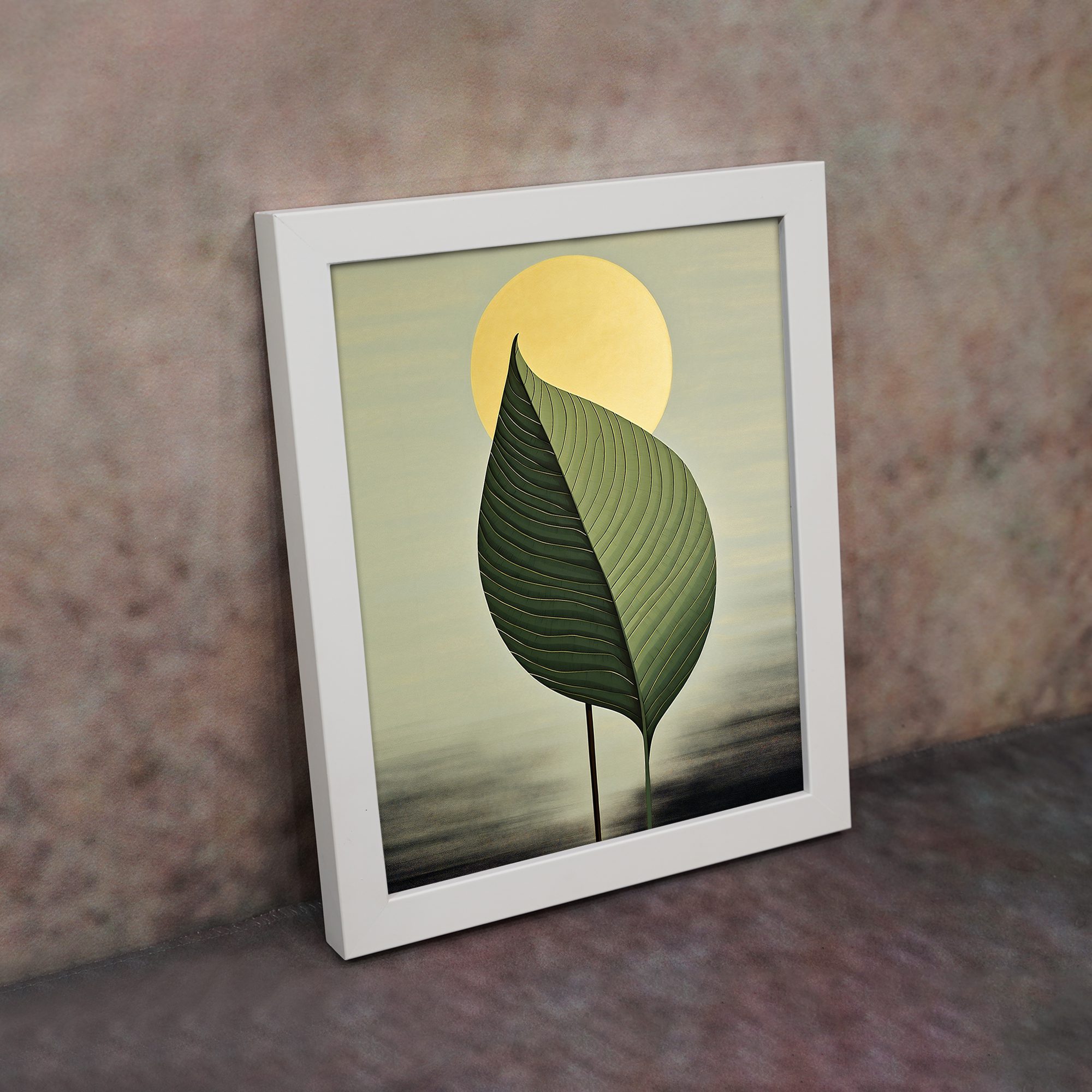 Create a calm and modern atmosphere in your home with this Kotart framed wall art. This design features a large detailed green leaf with a soft glowing sun in the background. The simple composition and smooth color tones give a peaceful and elegant look.