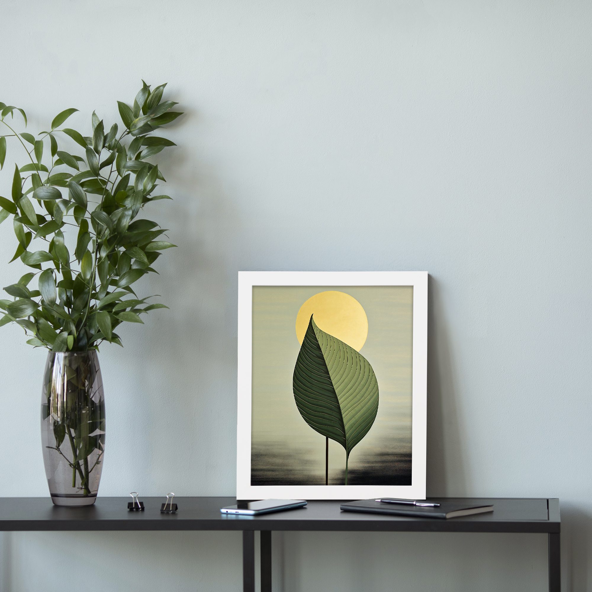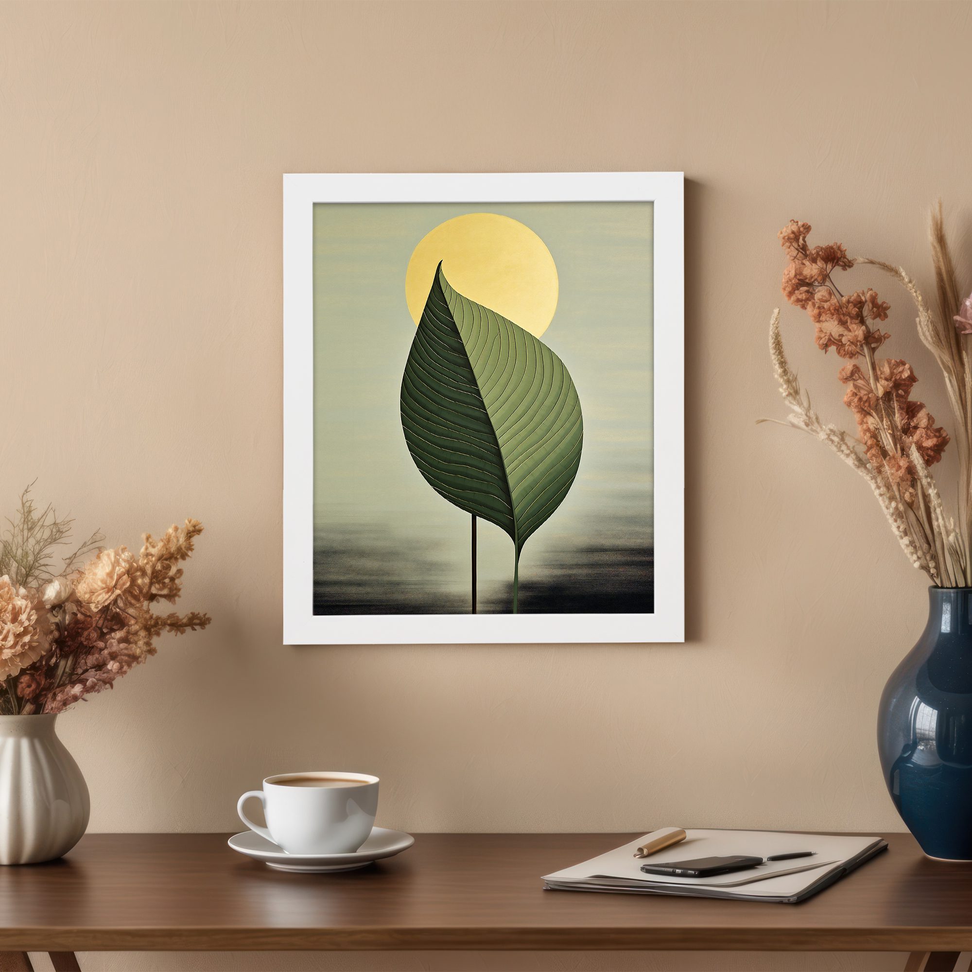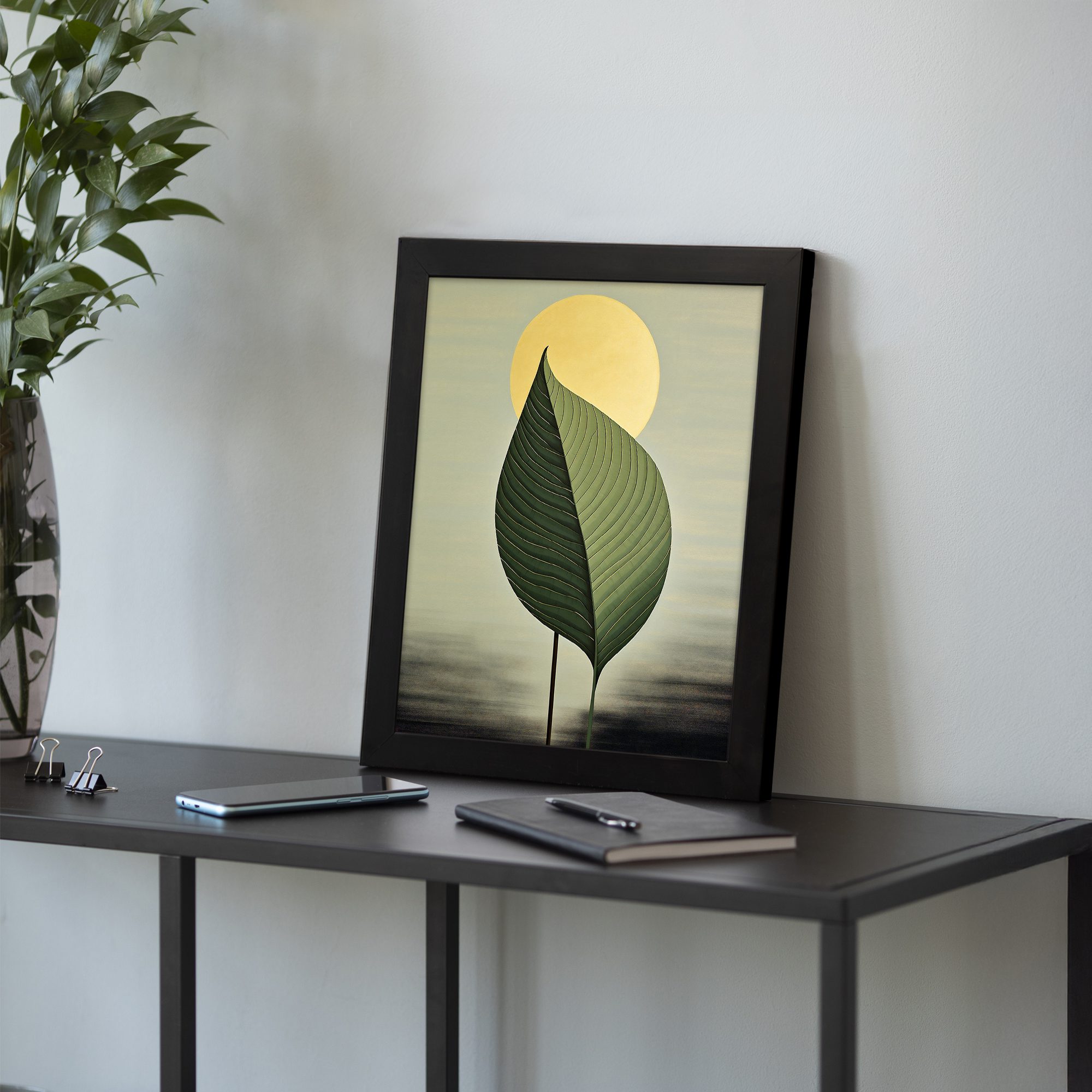 Create a calm and modern atmosphere in your home with this Kotart framed wall art. This design features a large detailed green leaf with a soft glowing sun in the background. The simple composition and smooth color tones give a peaceful and elegant look.