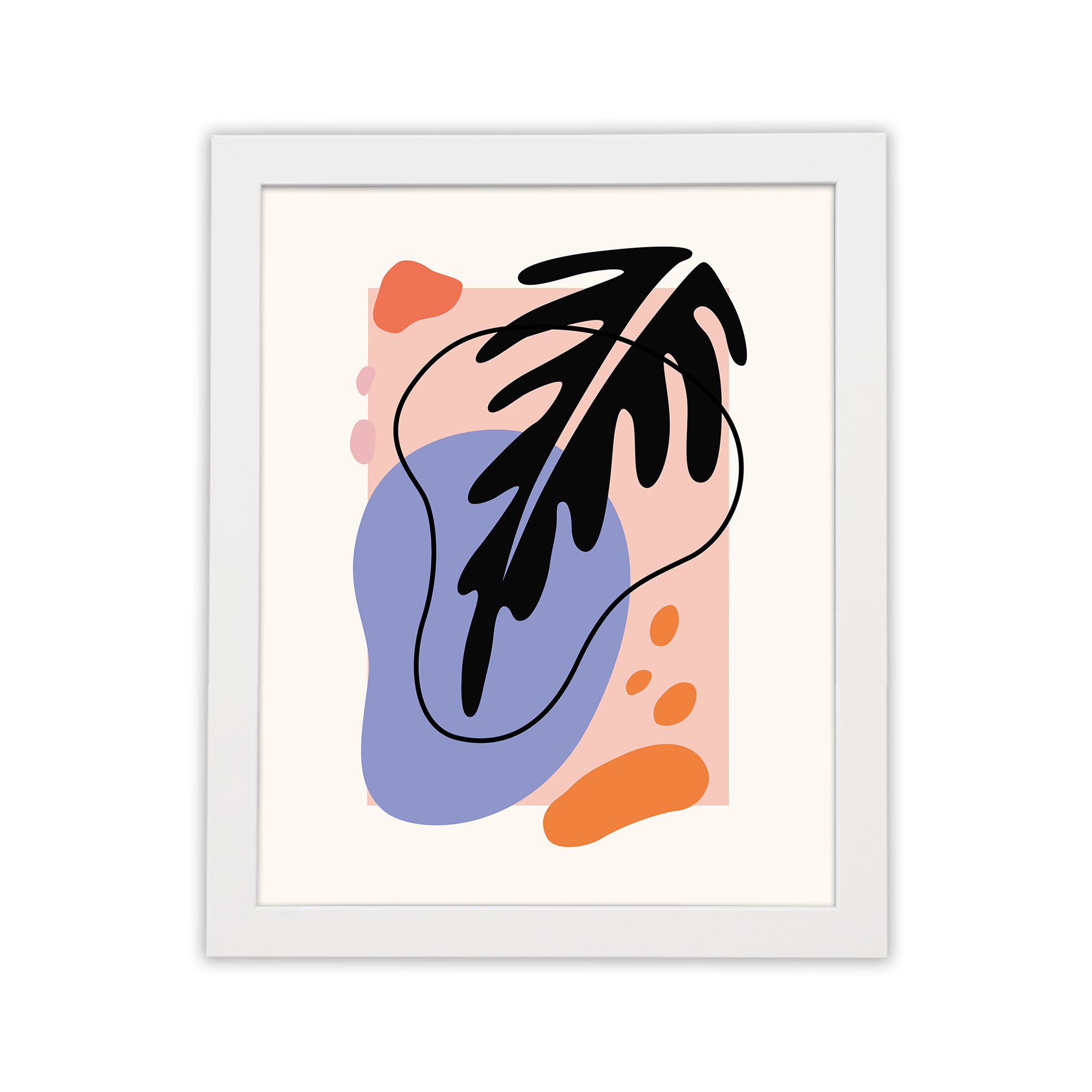 The color palette includes a light neutral background with a deep black leaf form, soft lavender-blue shape, peach rectangle, and bright orange accents, giving the artwork a lively yet balanced look. The contrast between bold and soft tones adds depth while keeping the design minimal.
