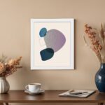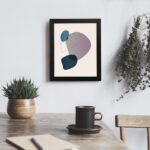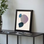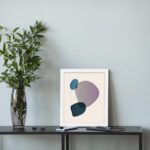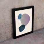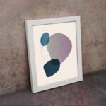 The color palette includes muted teal, deep navy, soft lavender-grey, and light neutral tones, offering a calm and balanced visual. The blend of soft shapes with minimal line detailing gives the artwork a clean and elegant aesthetic.