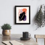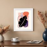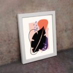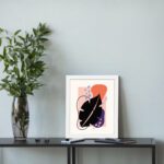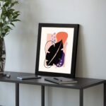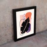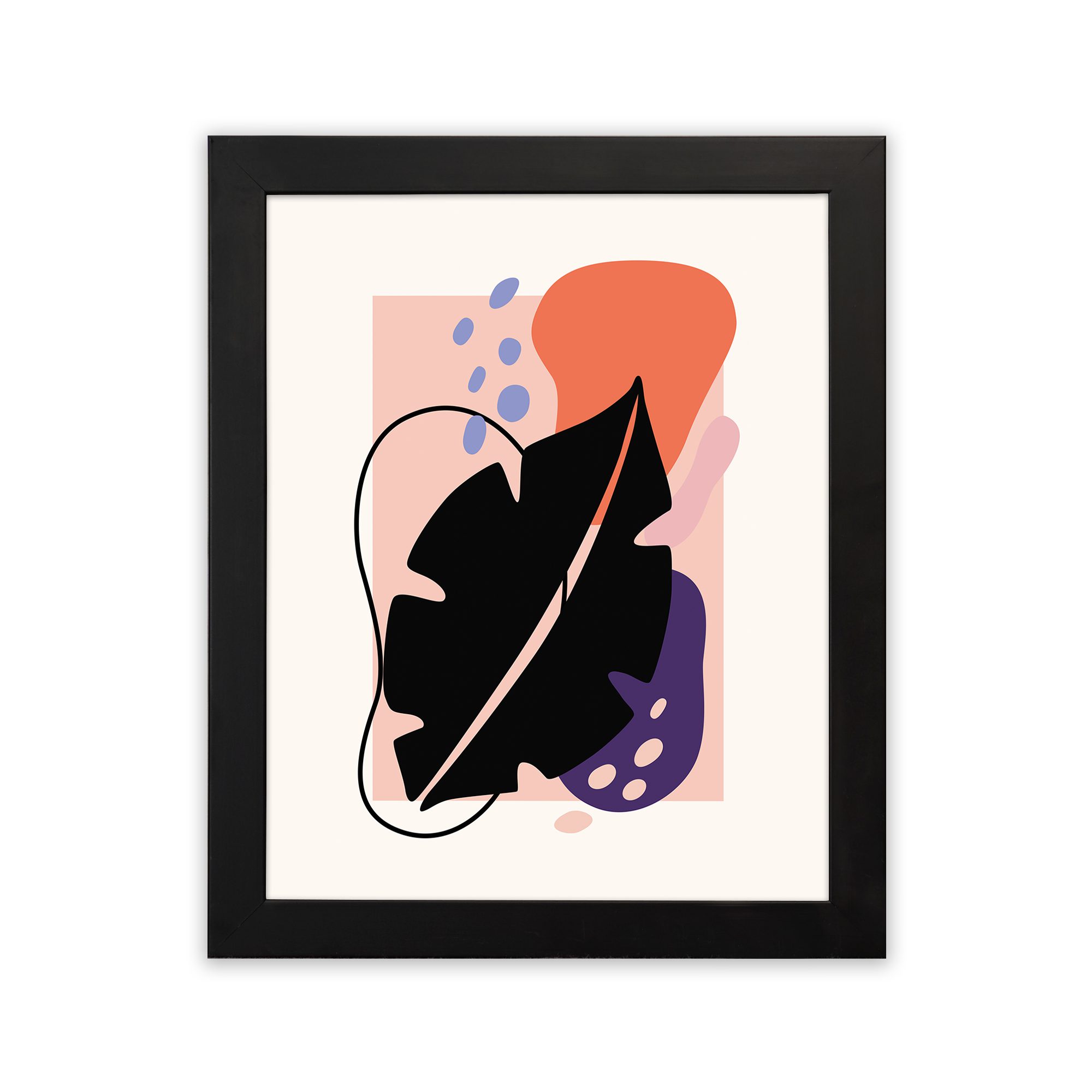The color palette includes a light neutral background with a bold black leaf form, vibrant orange shape, soft pink block, muted purple element, and subtle blue accents, giving the artwork a dynamic and balanced look. The mix of strong contrast and soft tones adds depth while maintaining a contemporary aesthetic.