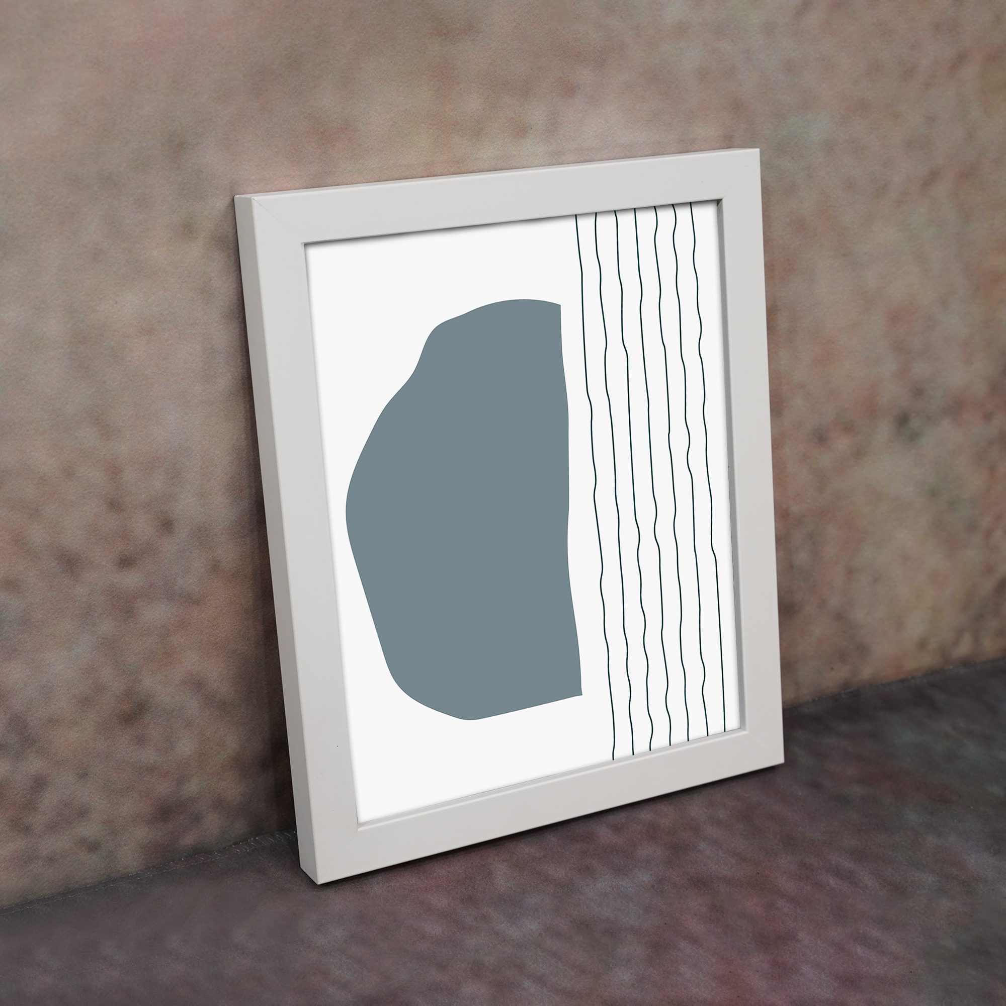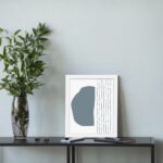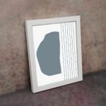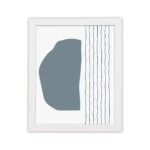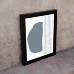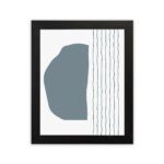 The color palette includes a soft grey-blue organic shape with thin black vertical lines on a light neutral background, giving the artwork a balanced and contemporary look. The contrast between solid form and linear detail adds visual interest while keeping the design minimal.
