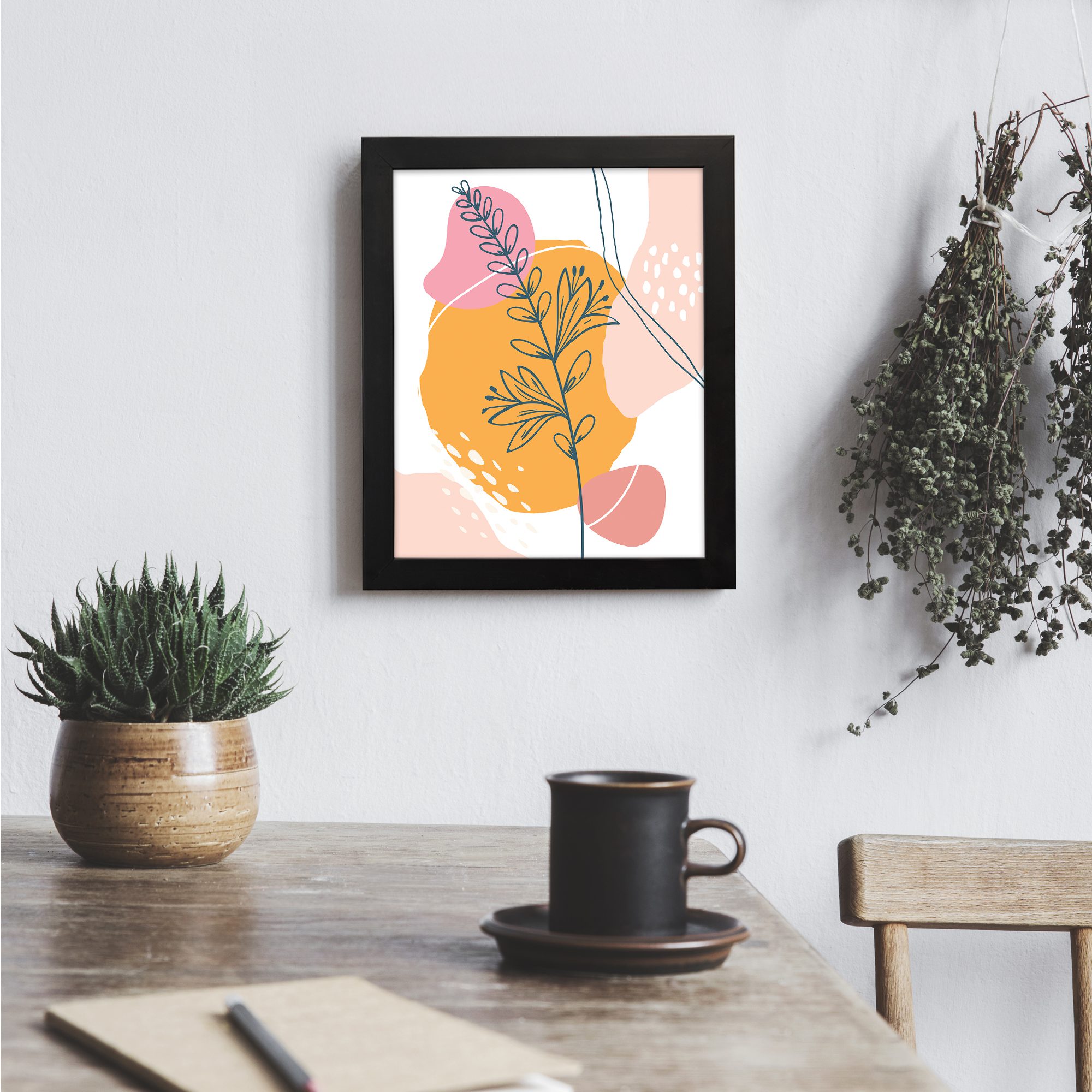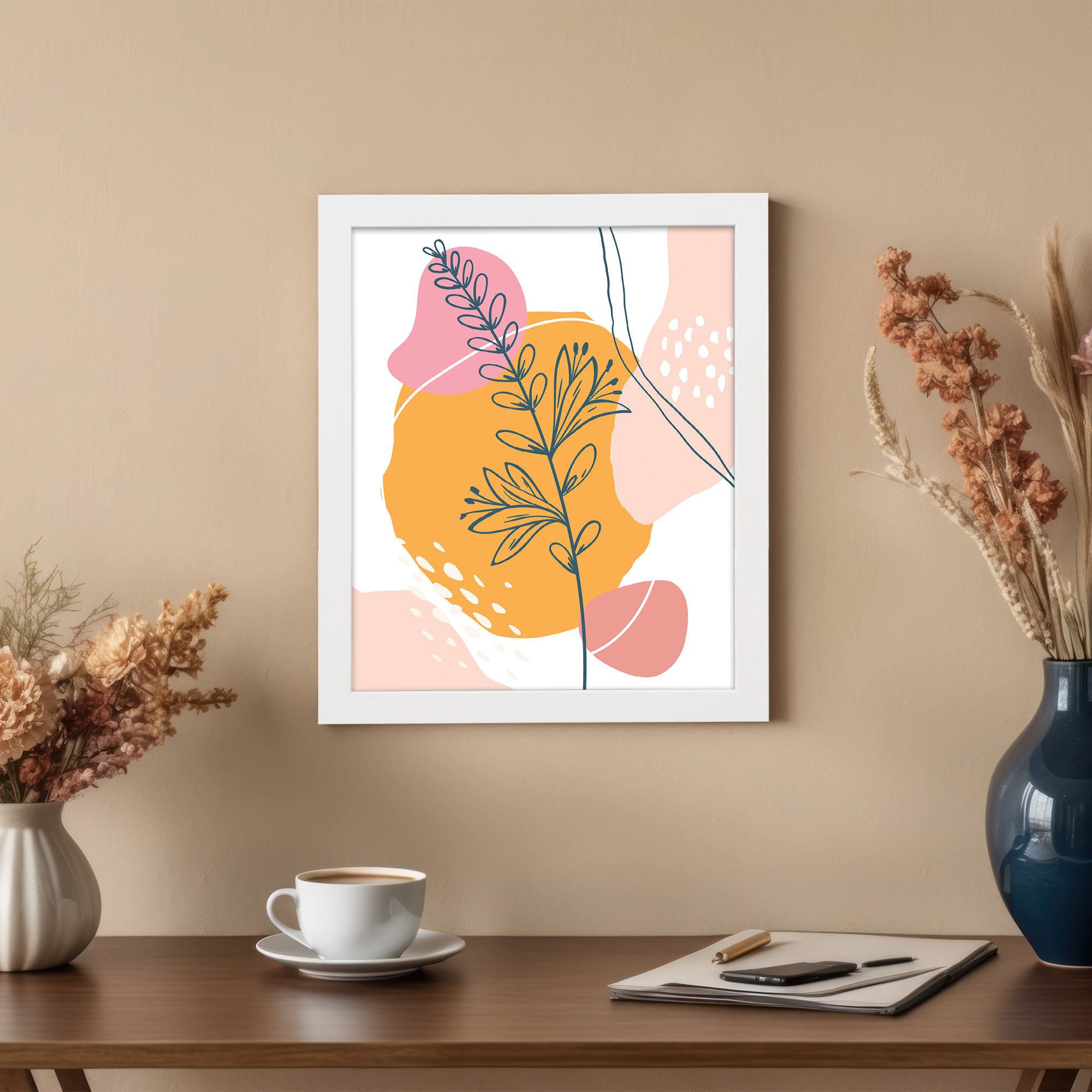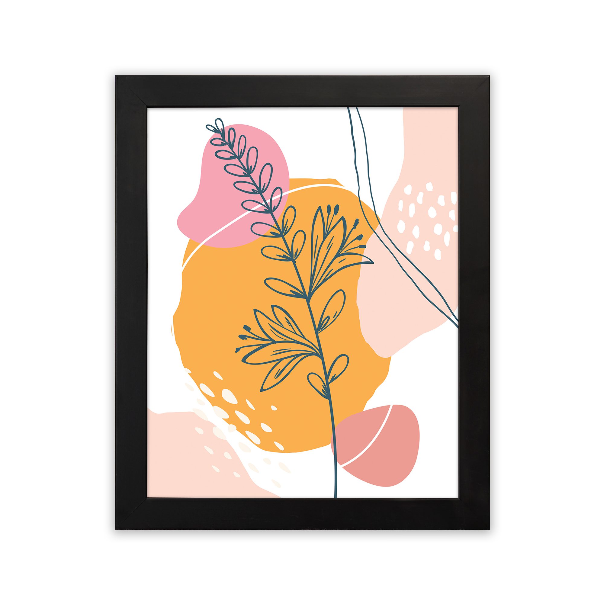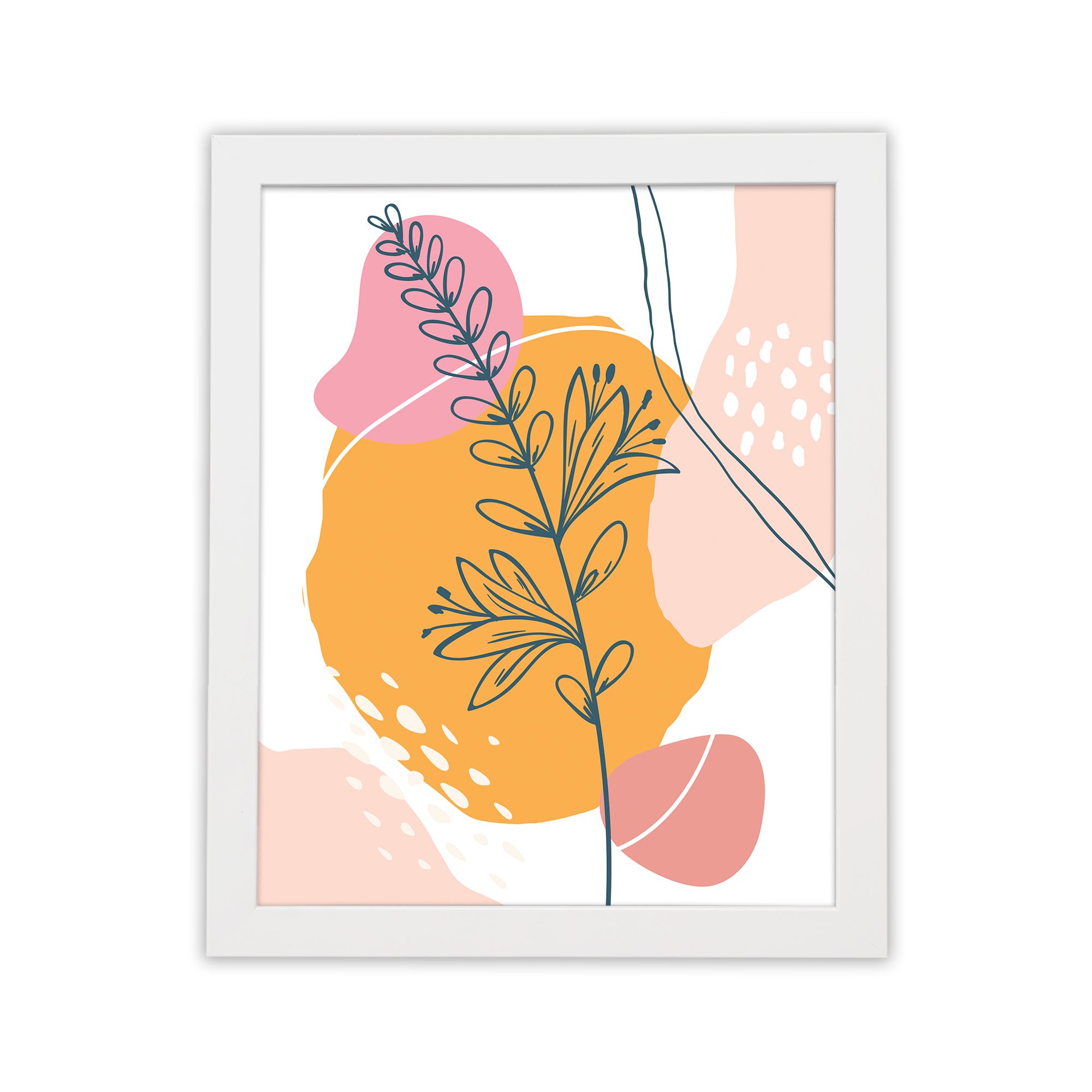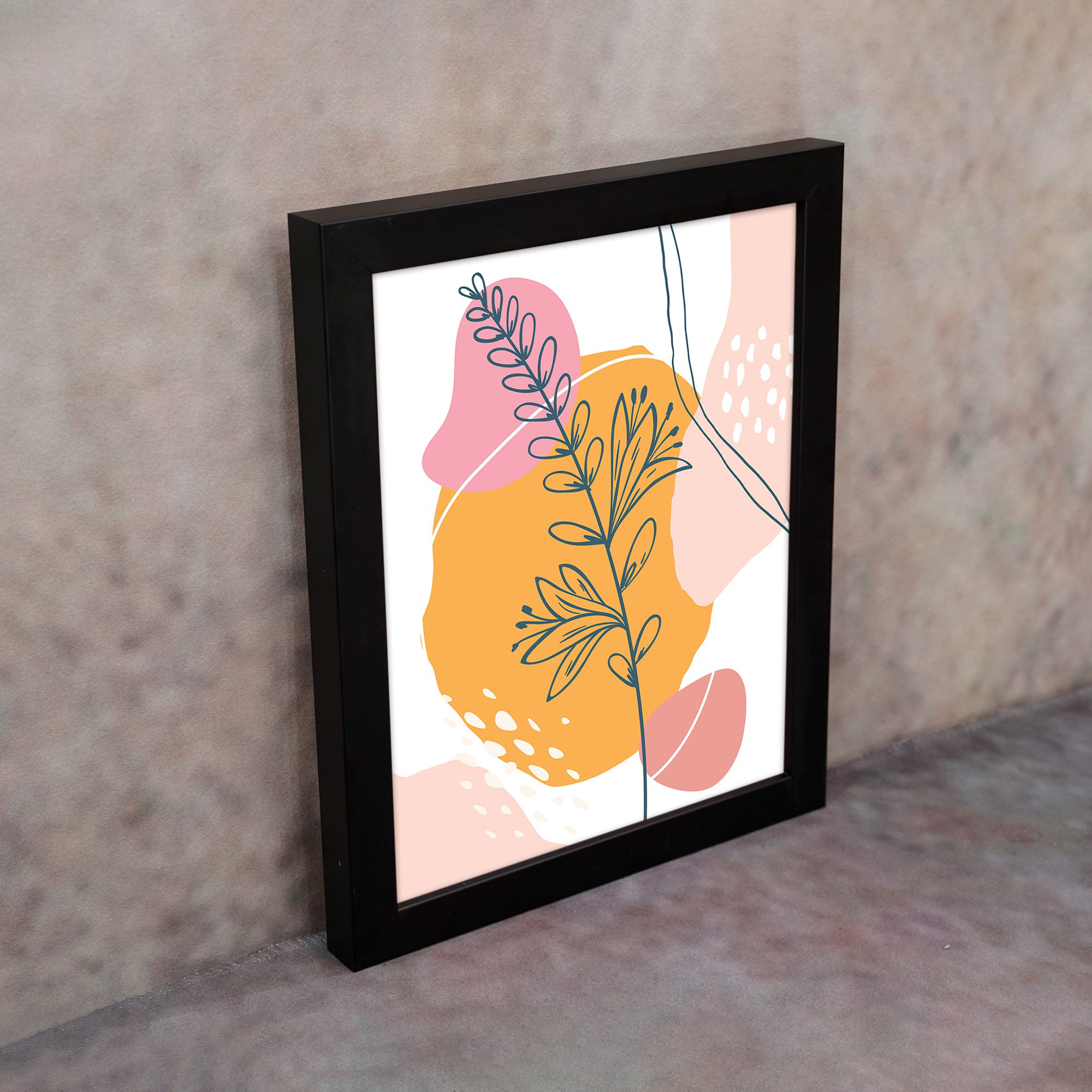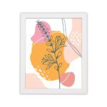The combination of soft pink, warm yellow, peach, and neutral tones adds a lively yet balanced feel. The simple line work with bold background shapes makes this artwork perfect for adding a stylish statement to your interior.