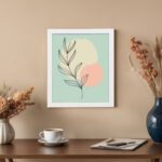 The use of muted green, soft peach, and light neutral tones adds a refreshing and soothing feel. The minimal lines and open space make this artwork perfect for creating a relaxed and stylish atmosphere.