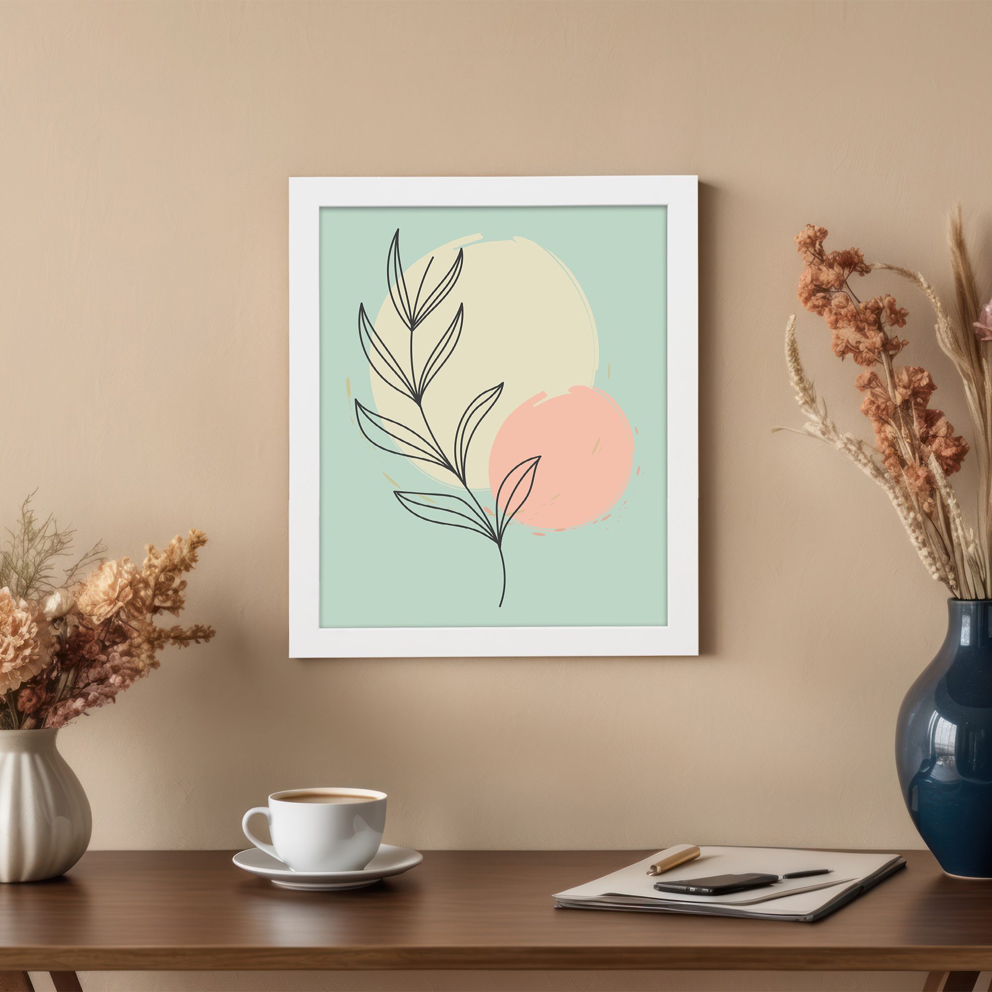 Bring a fresh and calming touch to your space with our Minimalist Wall Art. This design features a simple botanical line art illustration combined with soft pastel shapes in the background. The composition is clean and well-balanced, creating a modern and elegant look.