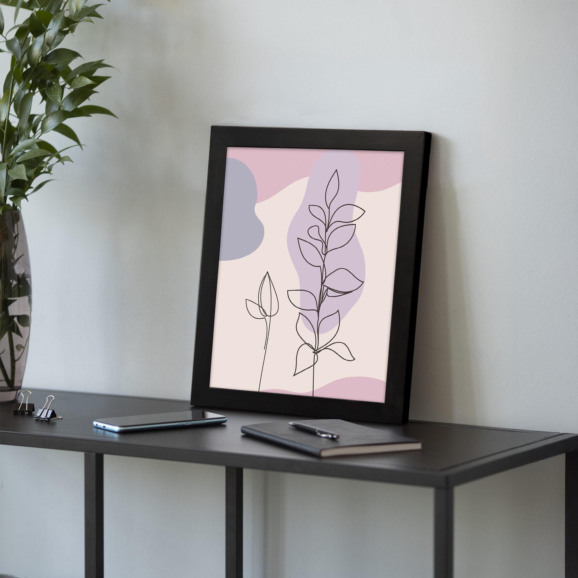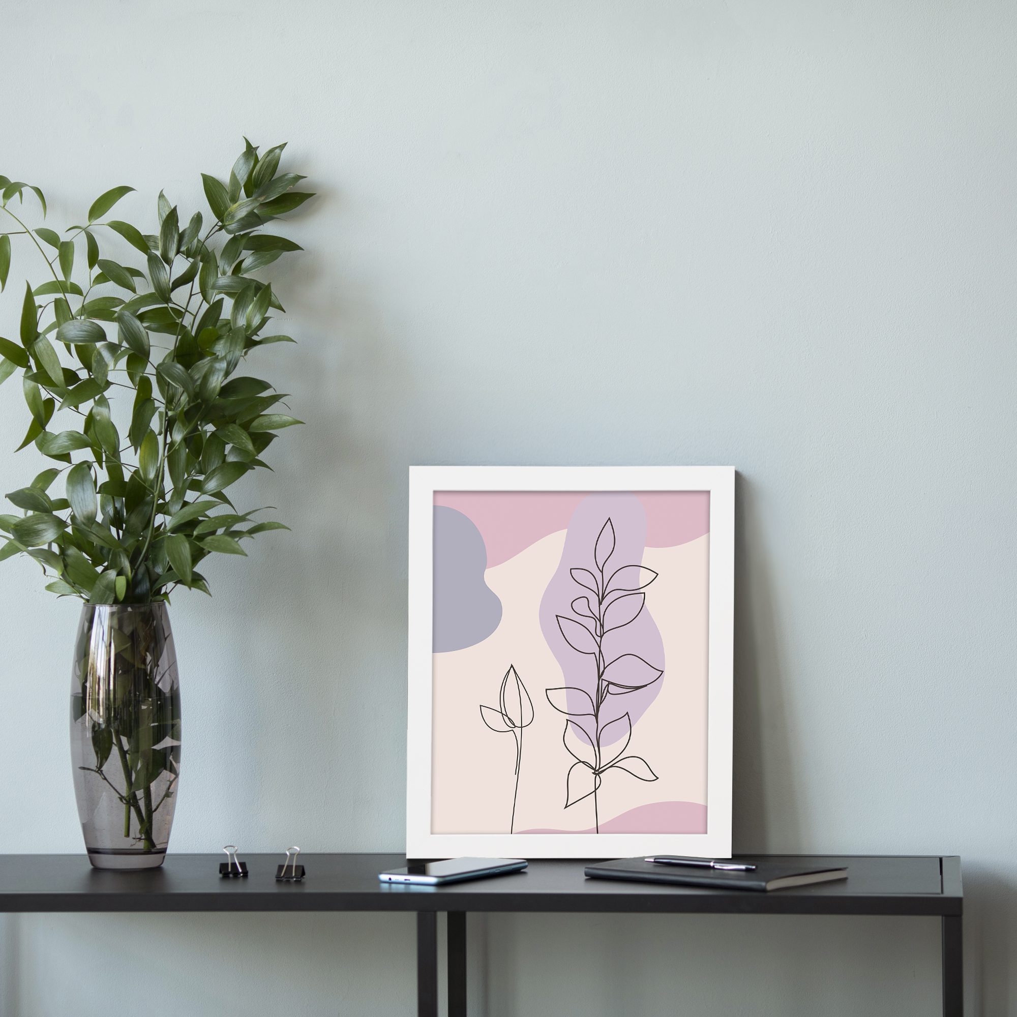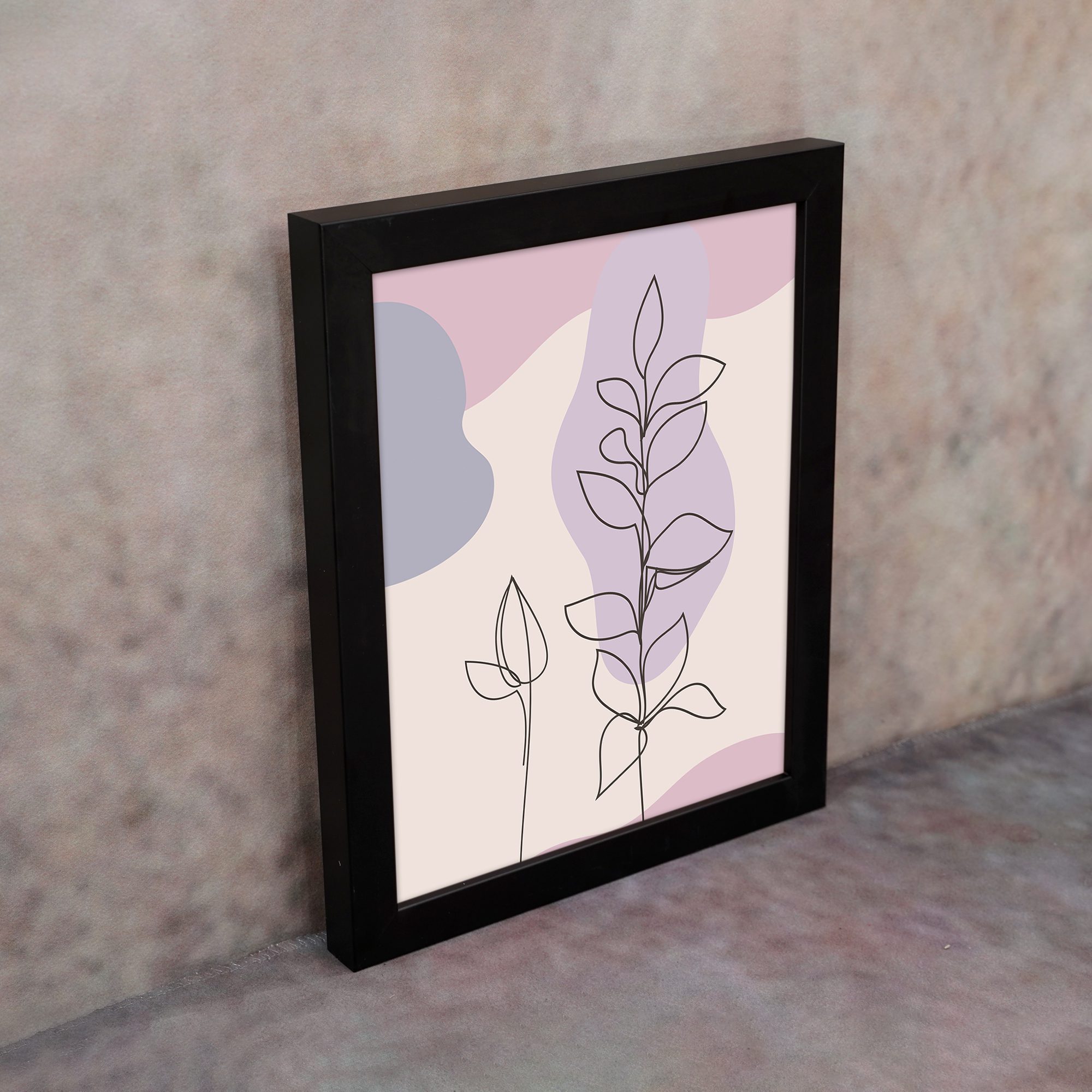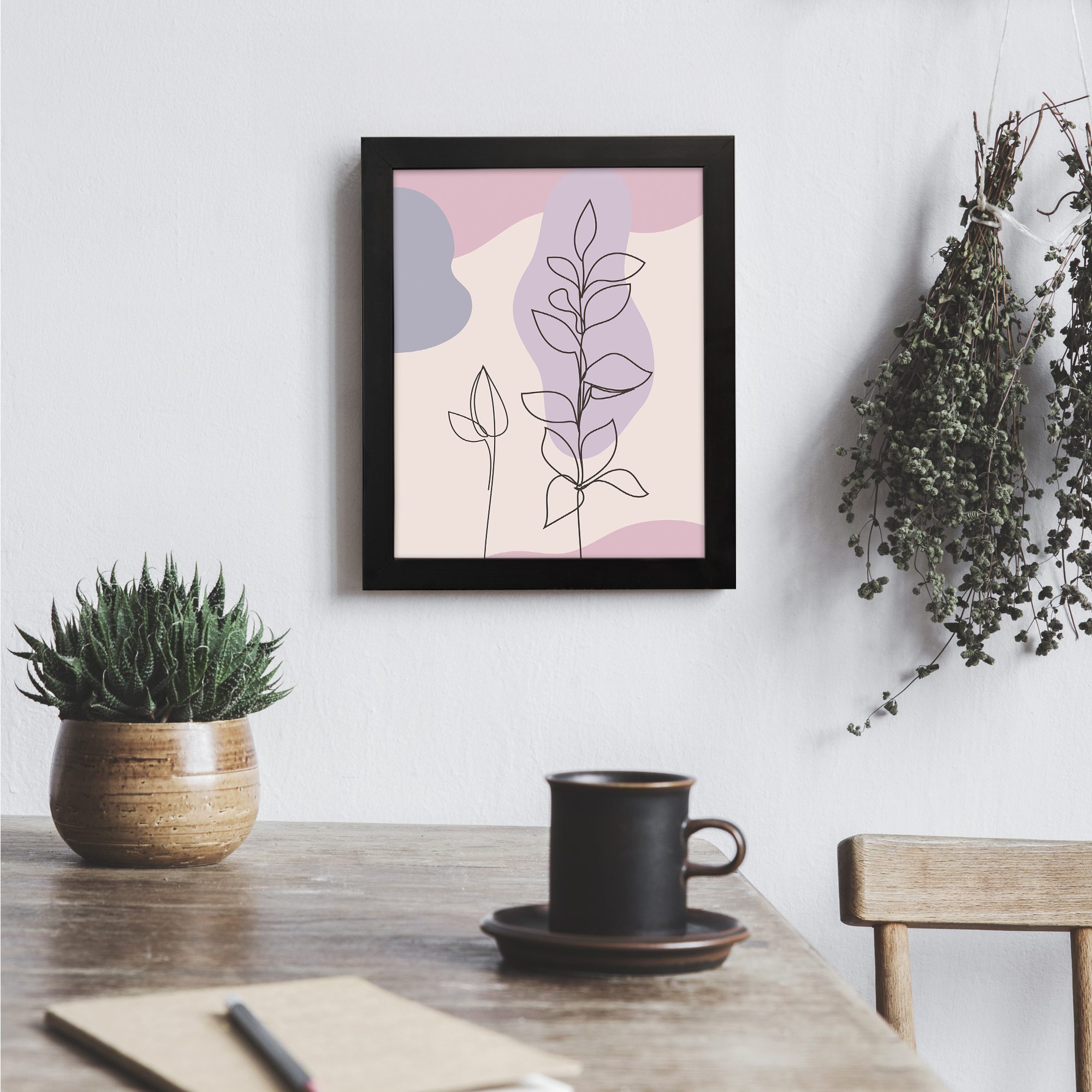 Bring a soft and elegant touch to your space with this Minimalist Wall Art. The design features two delicate botanical stems illustrated in fine line style, layered over smooth abstract shapes for a clean and modern composition.