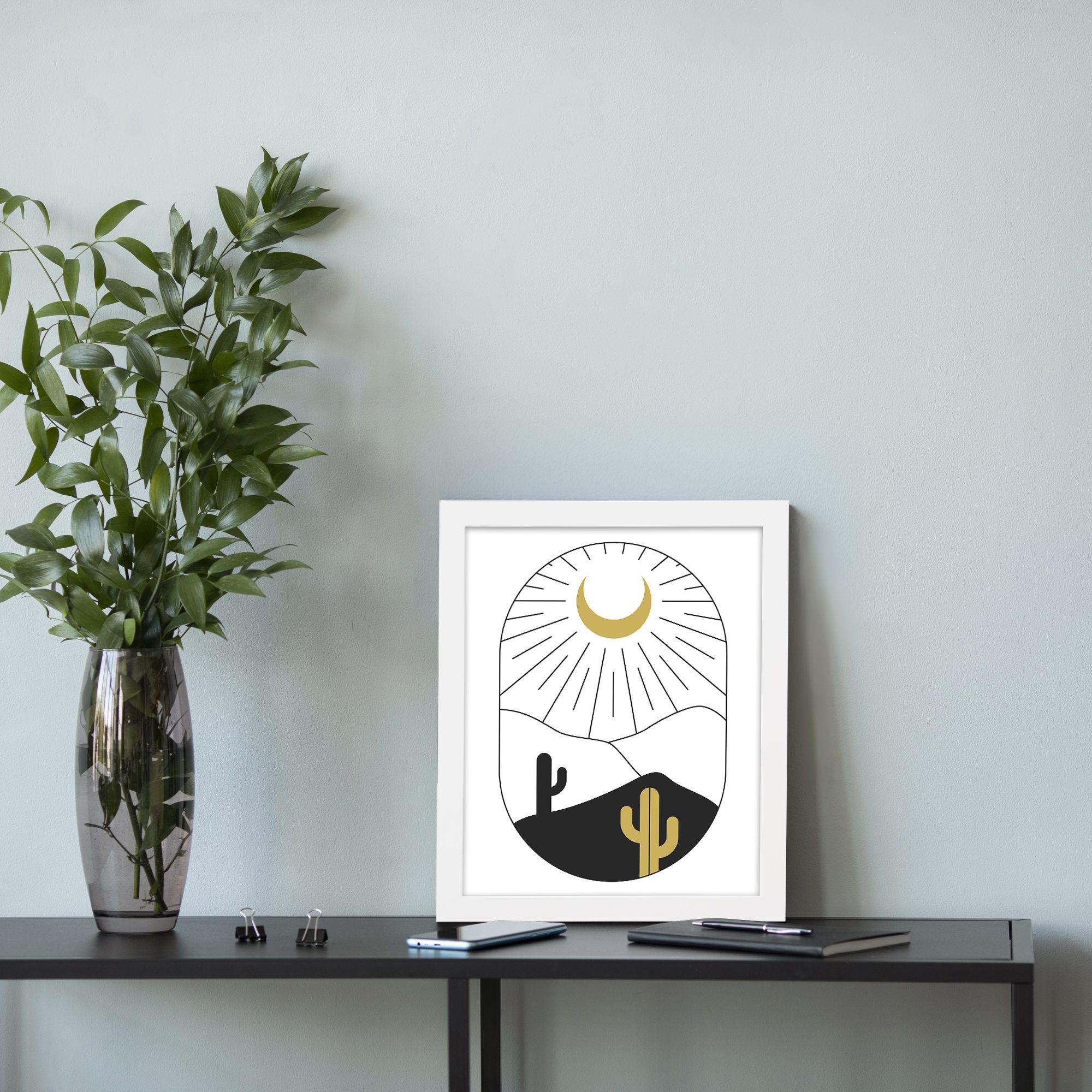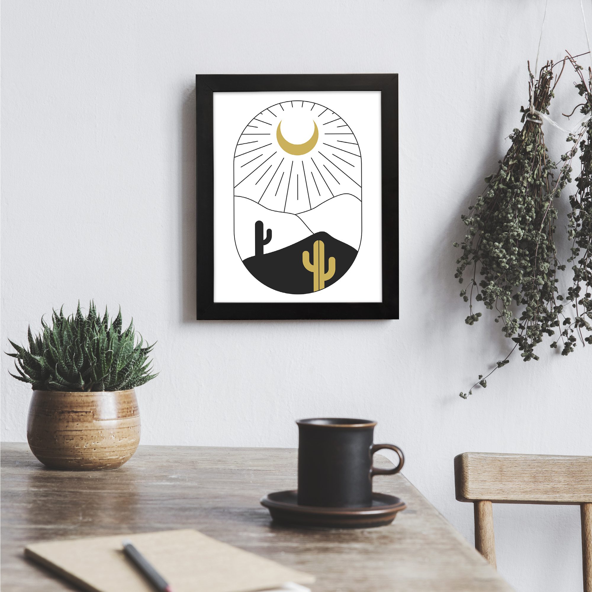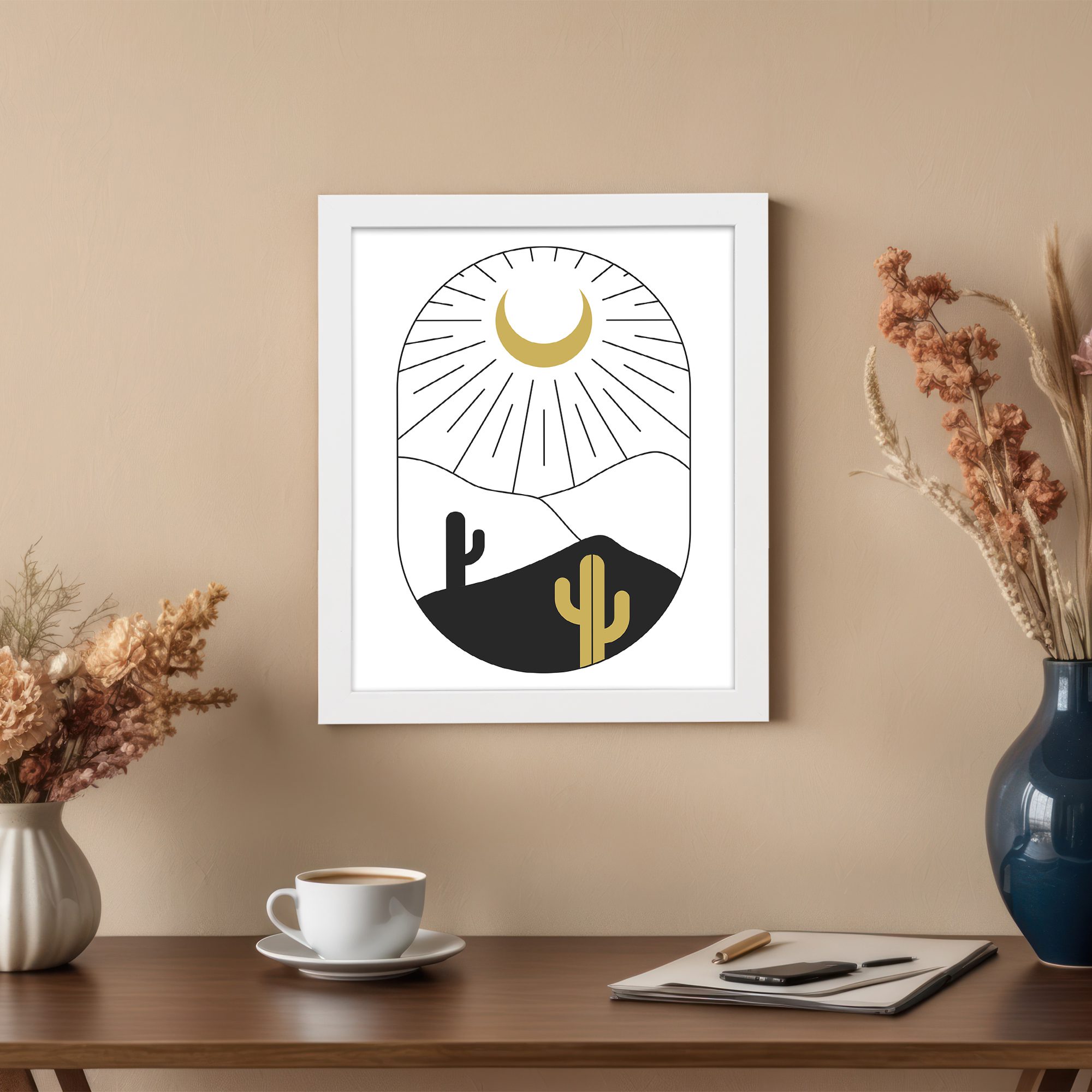 Add a bold and minimal desert-inspired touch to your space with this Minimalist Wall Art. The design features a stylized landscape with cactus silhouettes, rolling hills, and a radiant sun with a crescent form, all illustrated in clean line style.