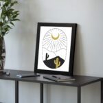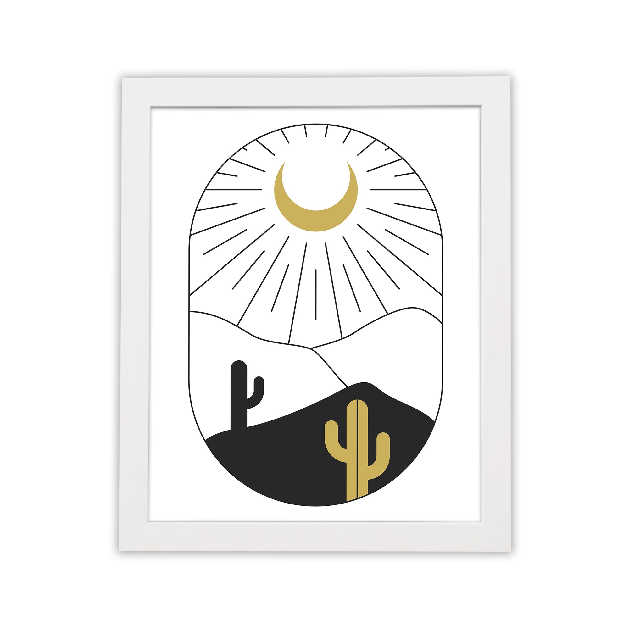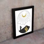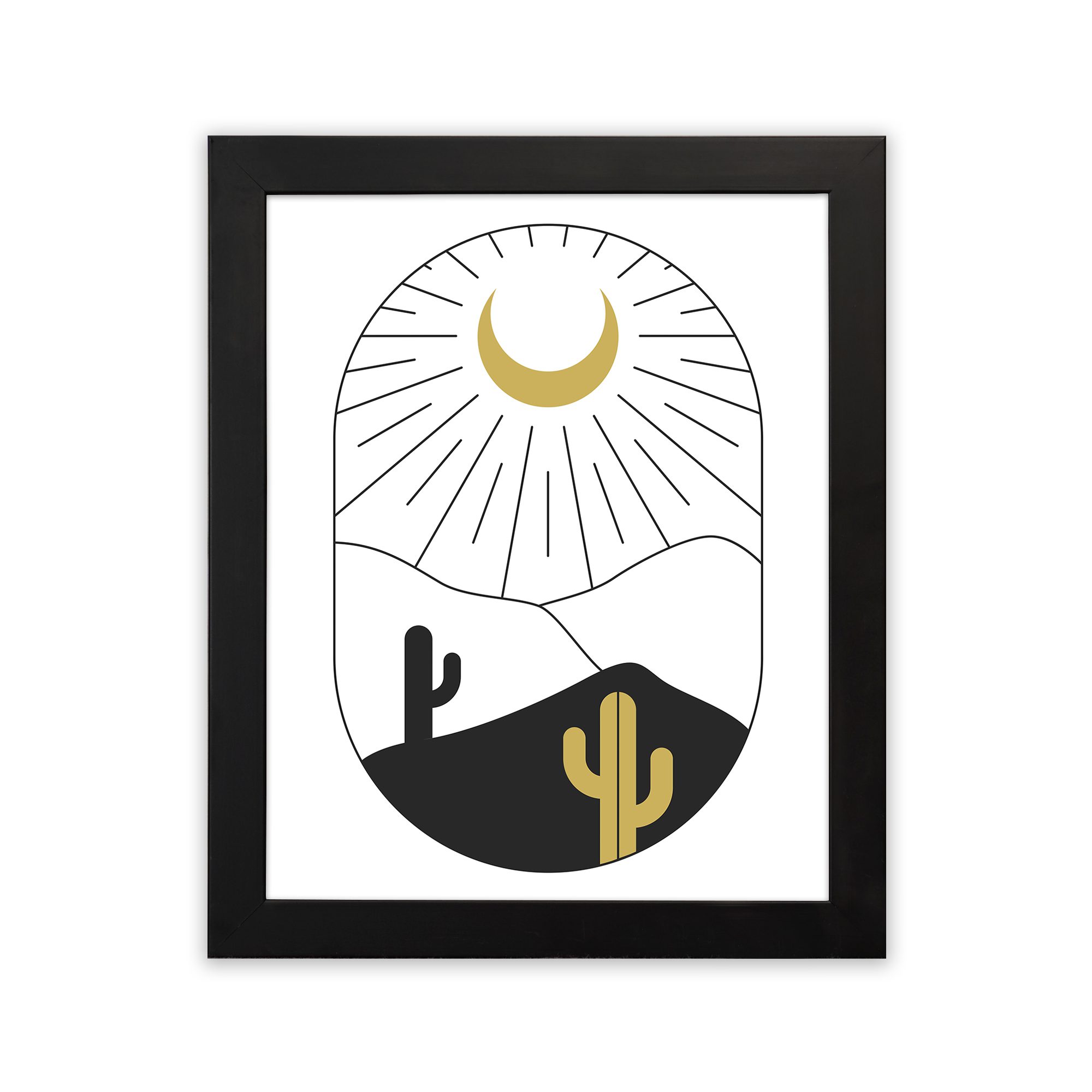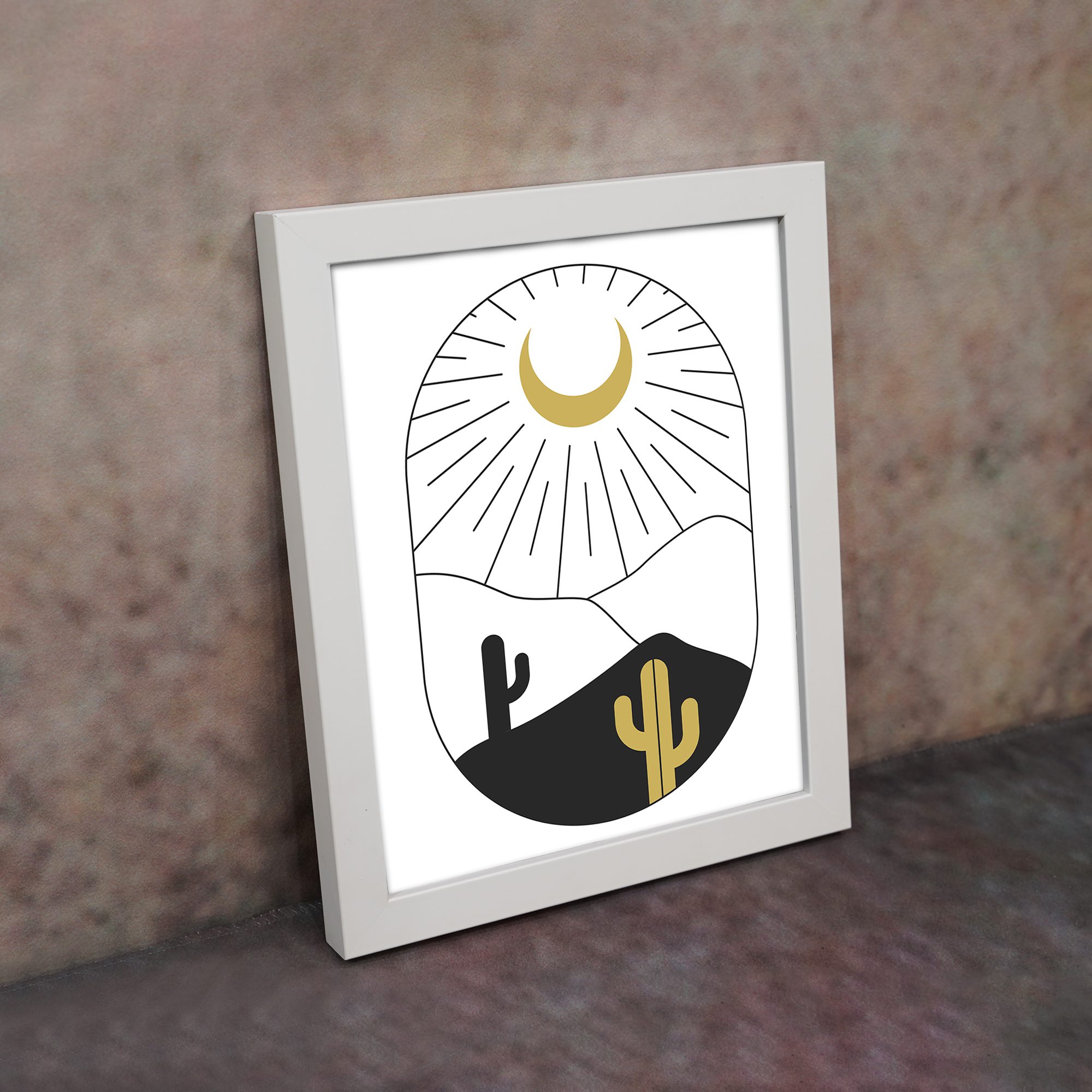 Add a bold and minimal desert-inspired touch to your space with this Minimalist Wall Art. The design features a stylized landscape with cactus silhouettes, rolling hills, and a radiant sun with a crescent form, all illustrated in clean line style.