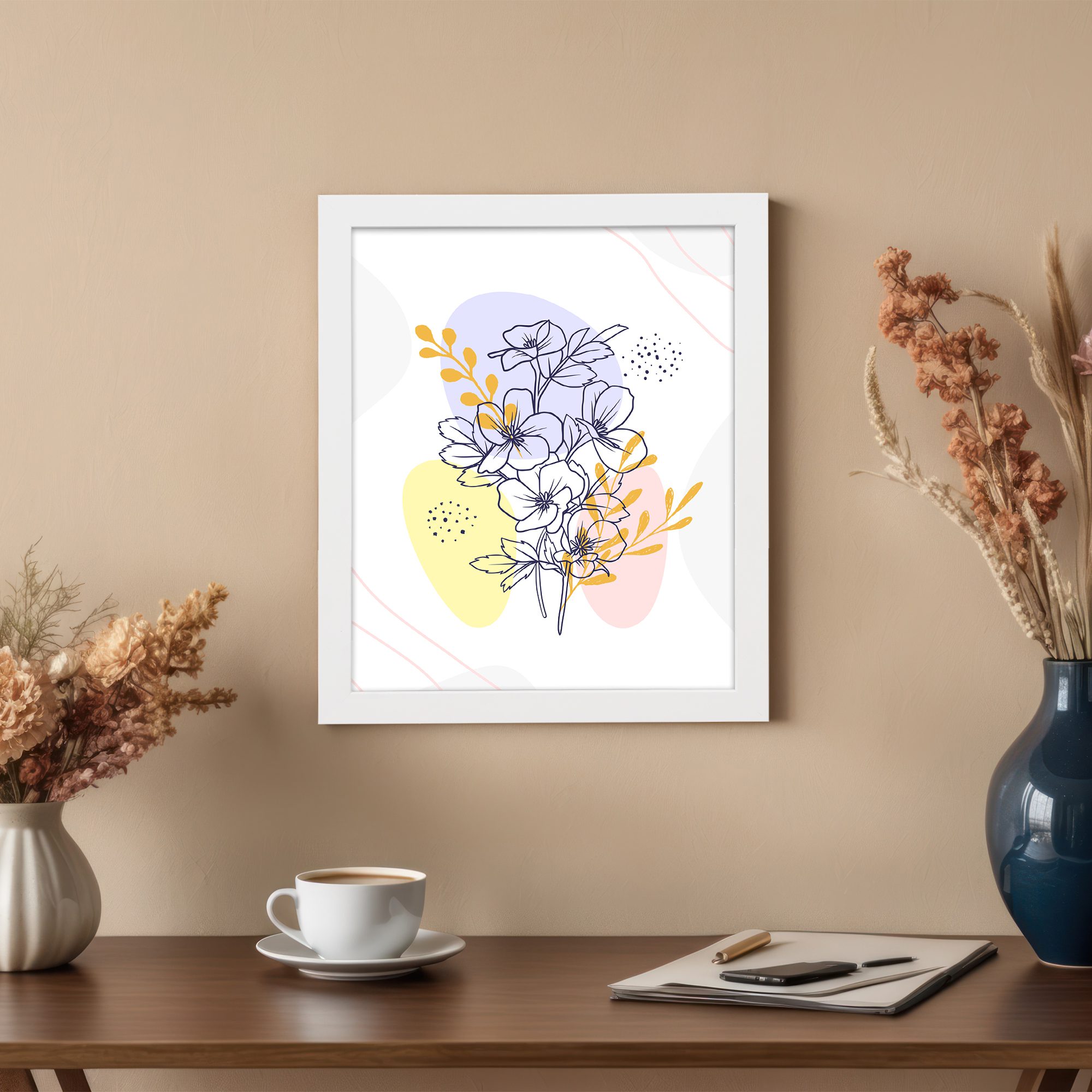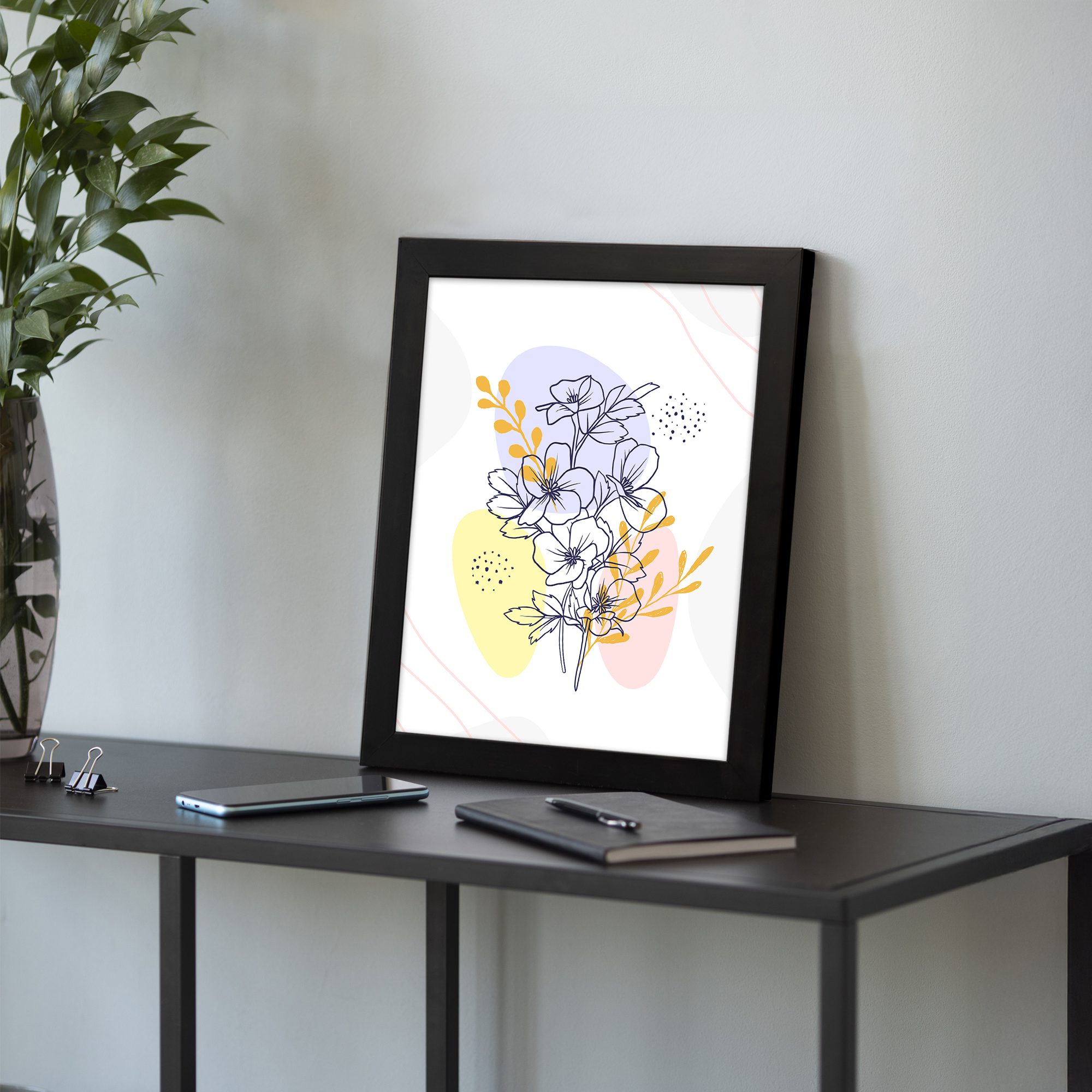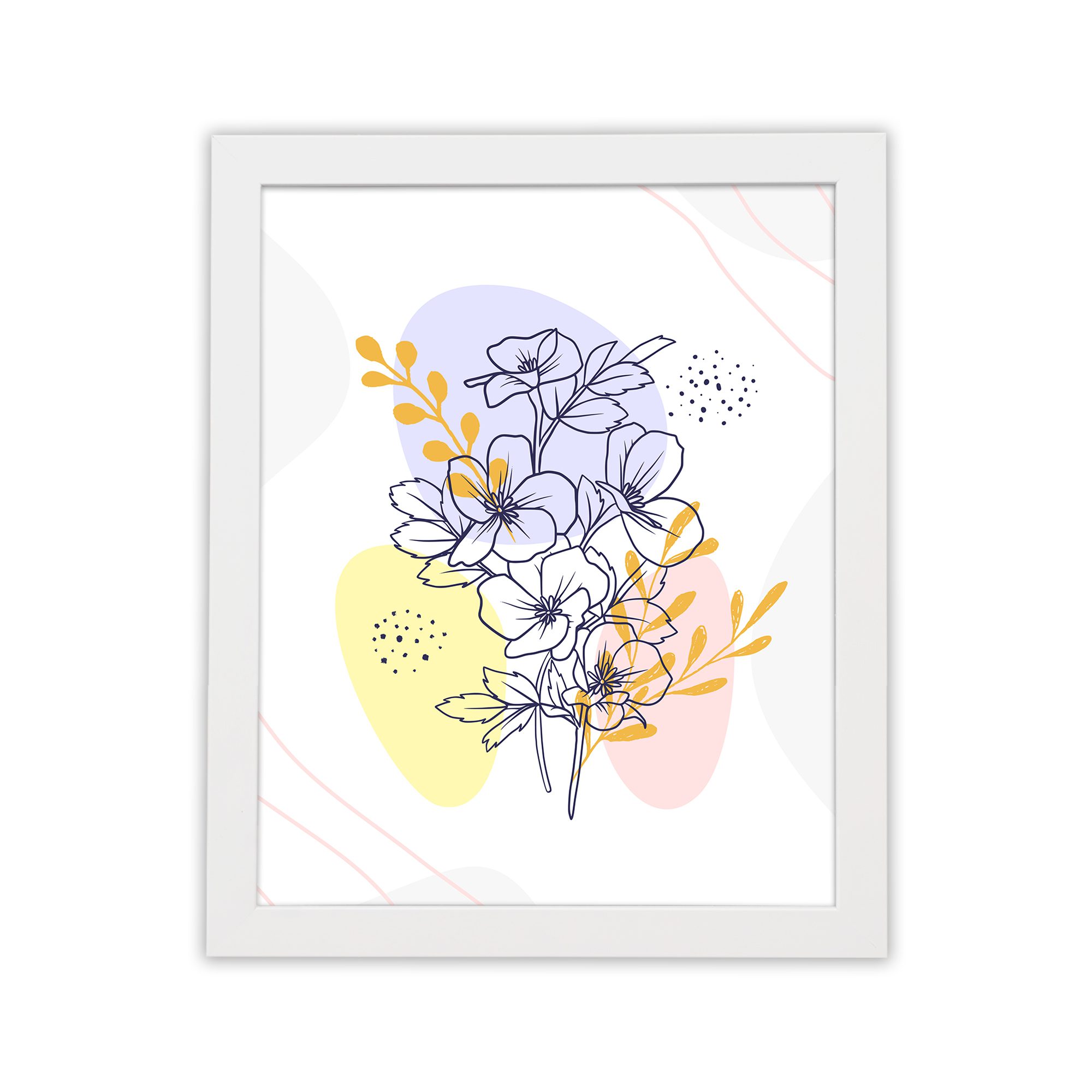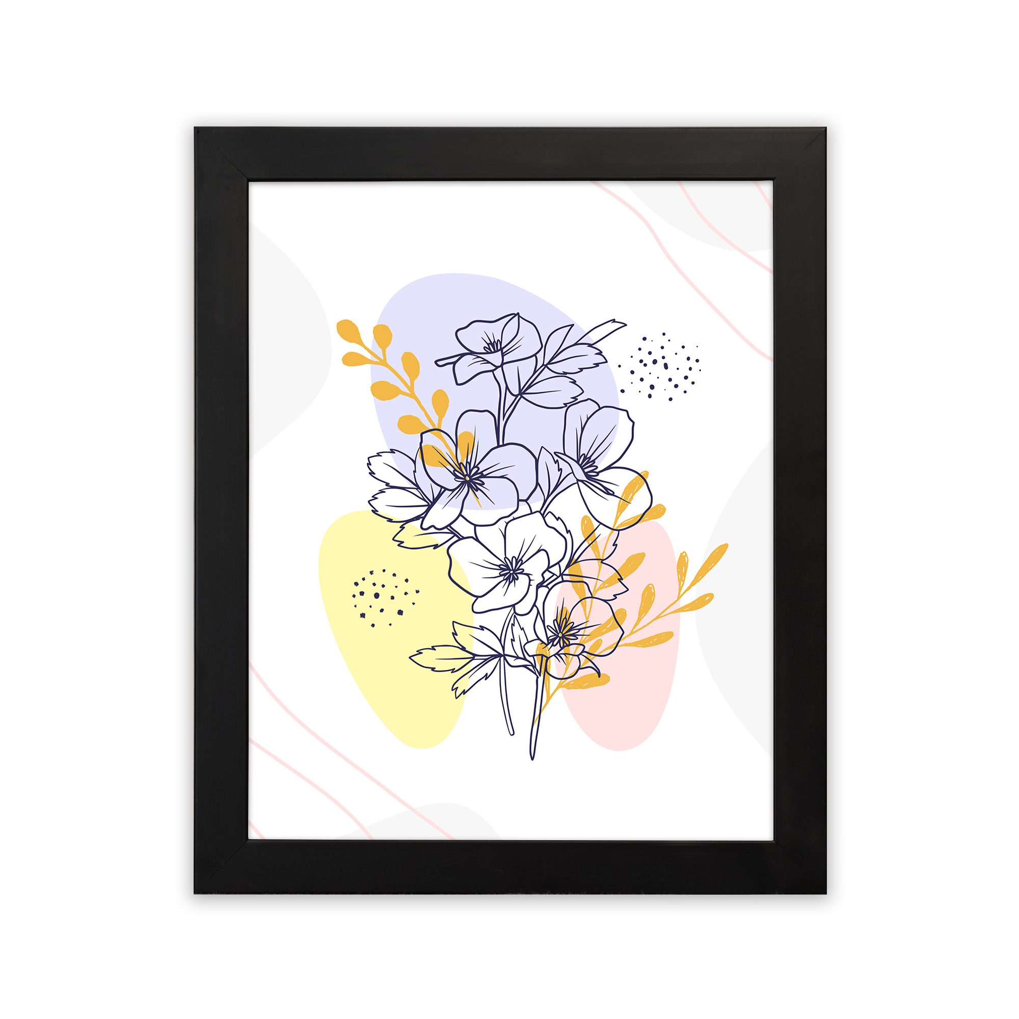 Add a vibrant yet elegant focal point to your space with this Minimalist Wall Art. The design features a detailed floral cluster drawn in fine line style, enhanced with layered abstract shapes and subtle dotted textures for a modern composition.