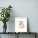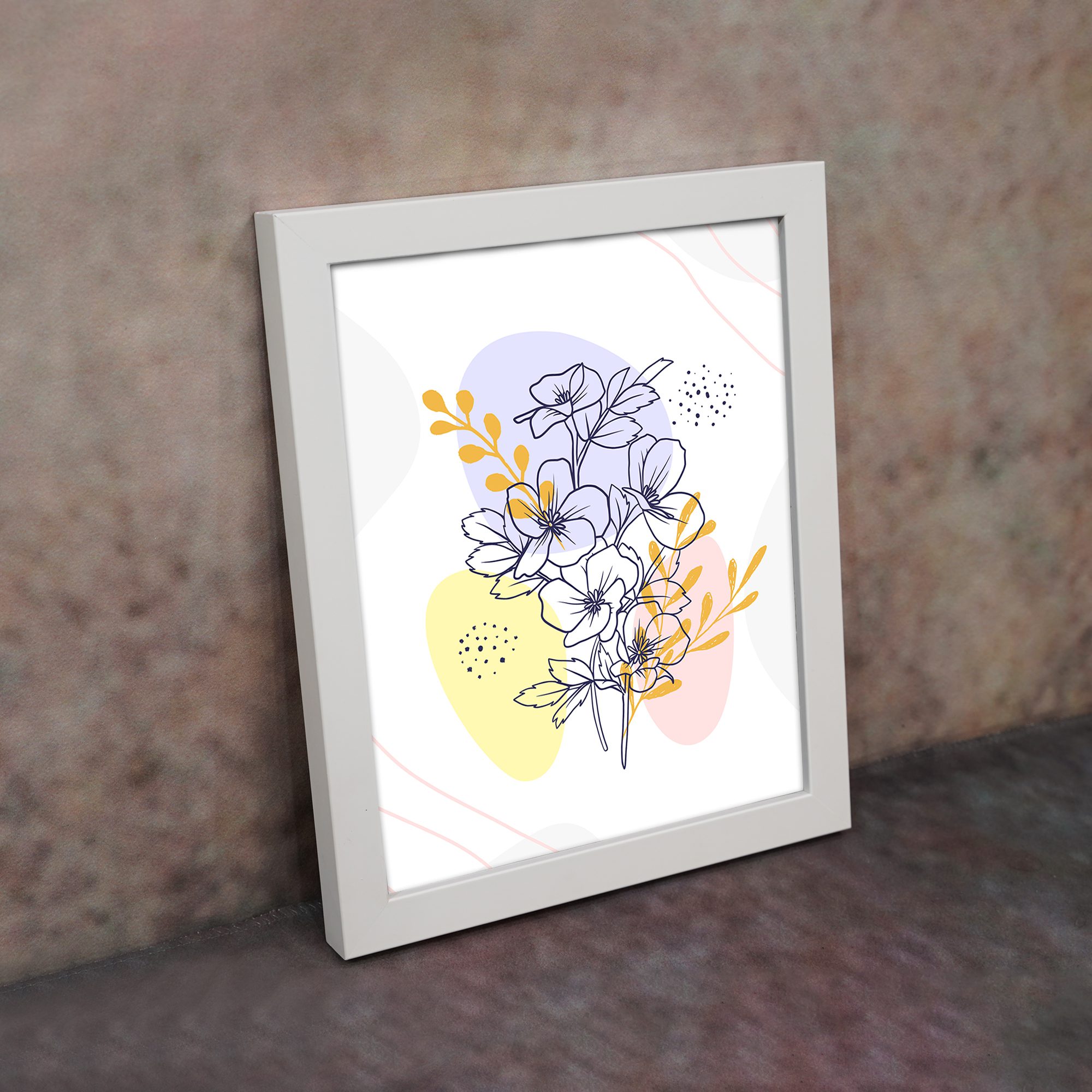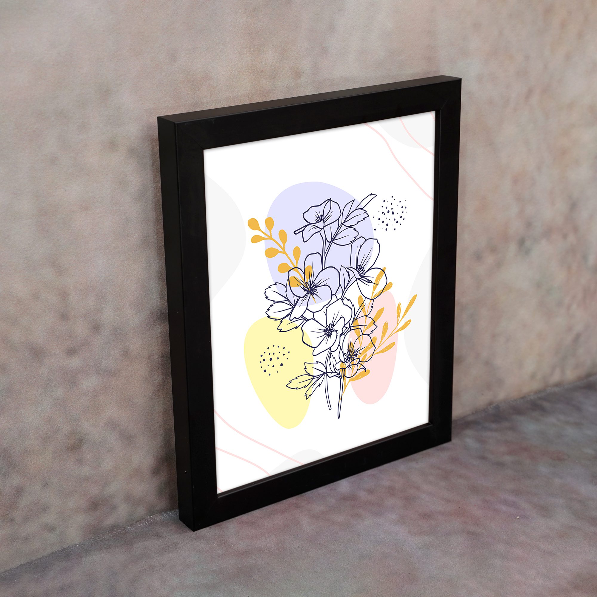 The color palette blends soft lavender, pastel yellow, warm peach, and neutral tones with fine dark line detailing, creating a visually rich yet balanced look. The overlapping flowers and accent leaves bring depth and movement while keeping the overall design clean.