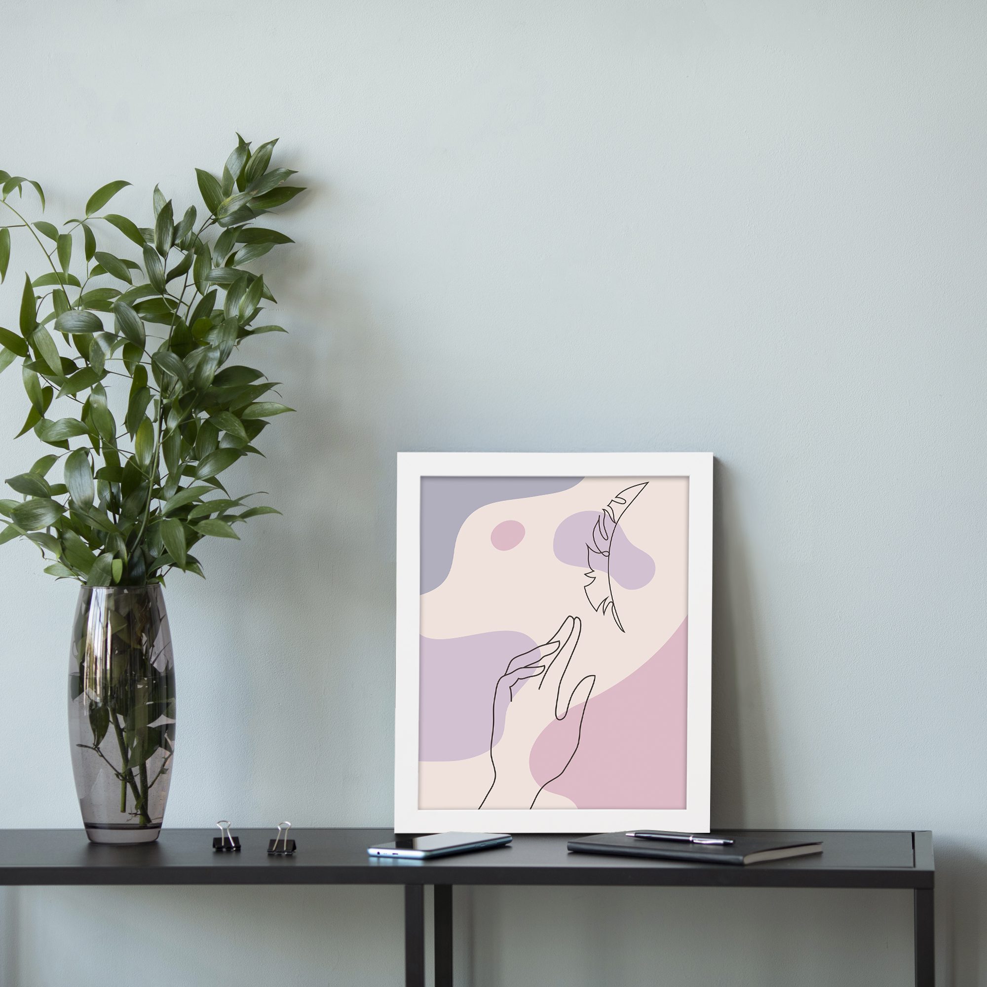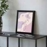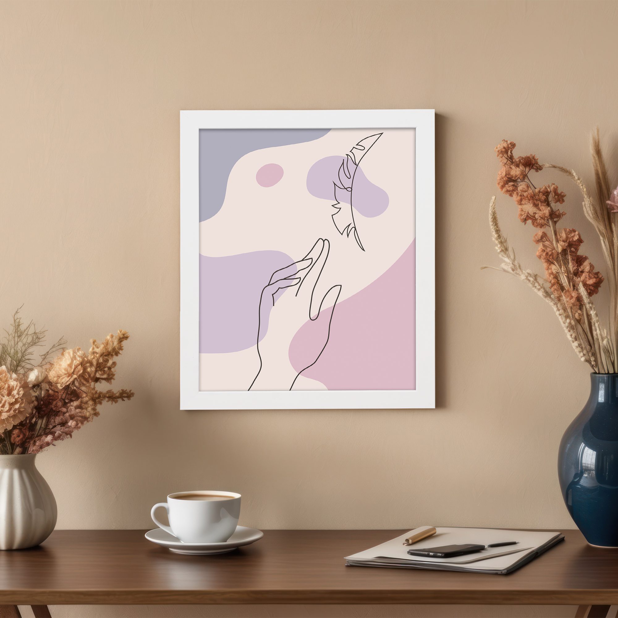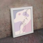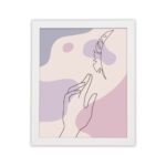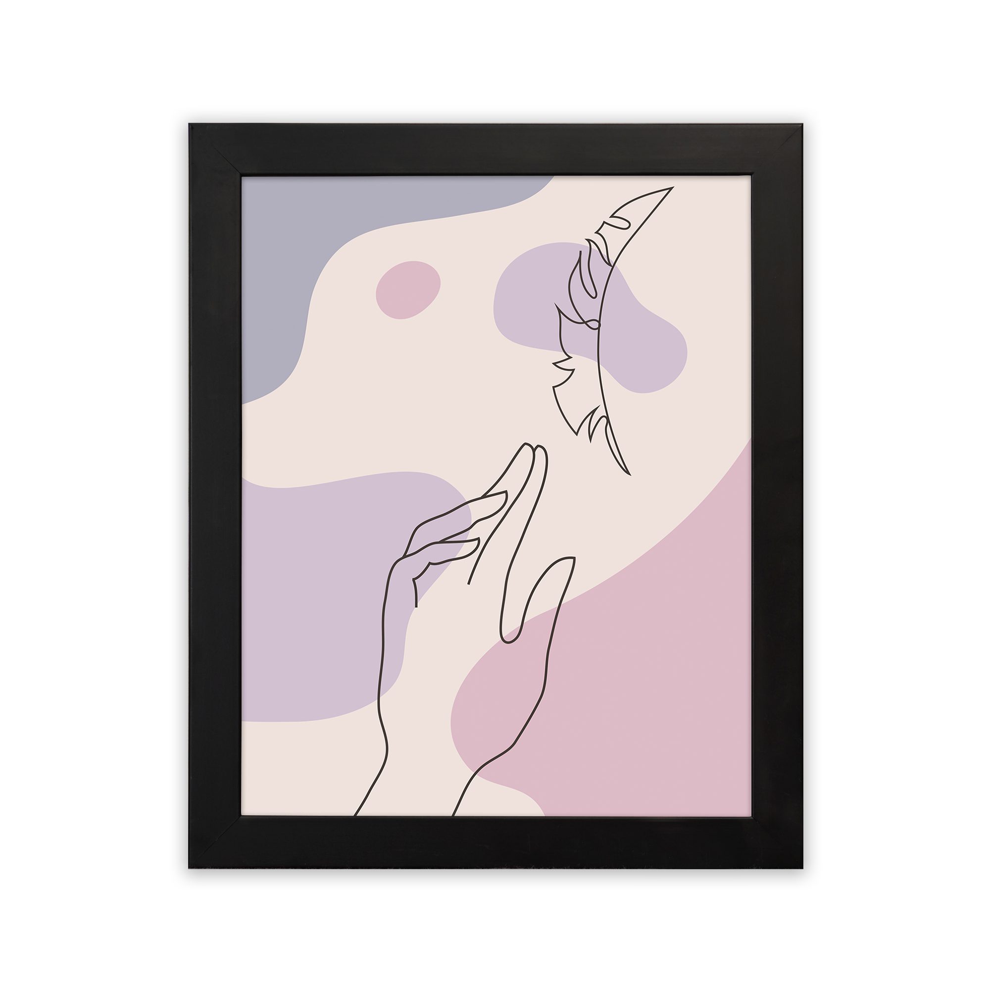 Add a soft and expressive artistic touch to your space with this Minimalist Wall Art. The design features a delicate hand gesture reaching toward a feather, illustrated in fine line style over flowing abstract shapes.