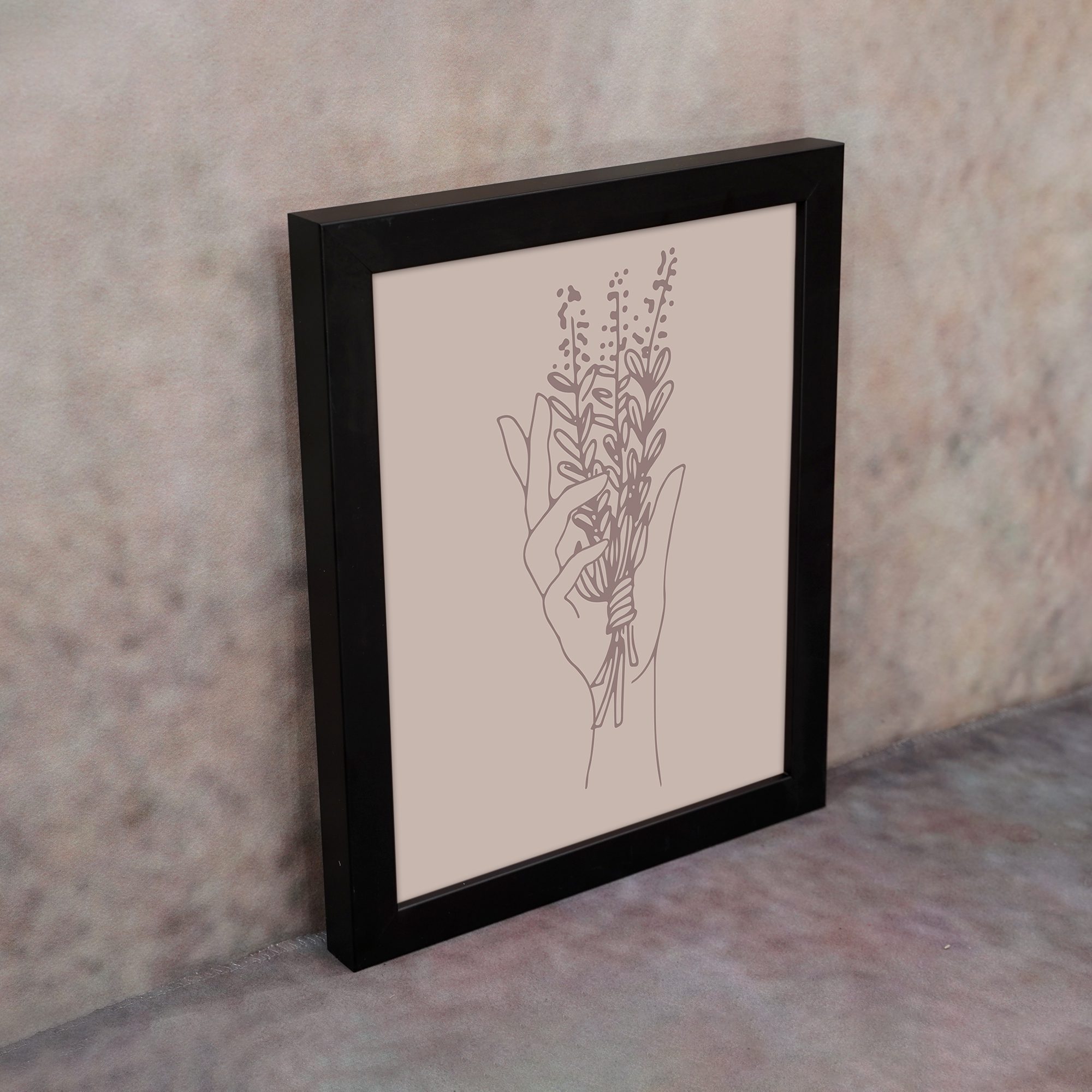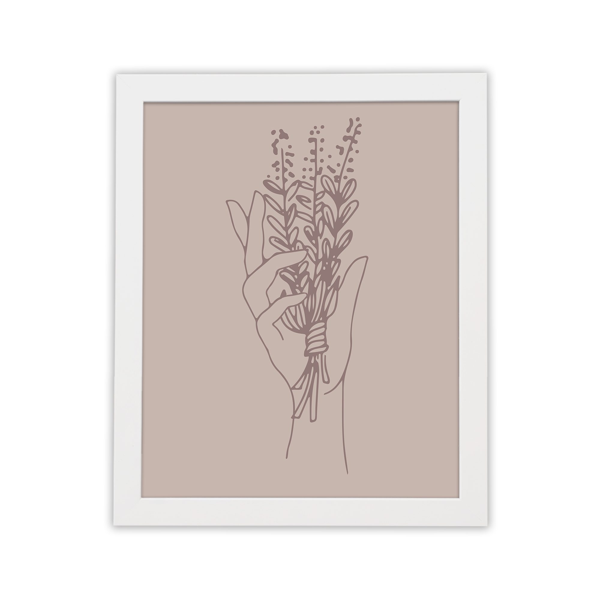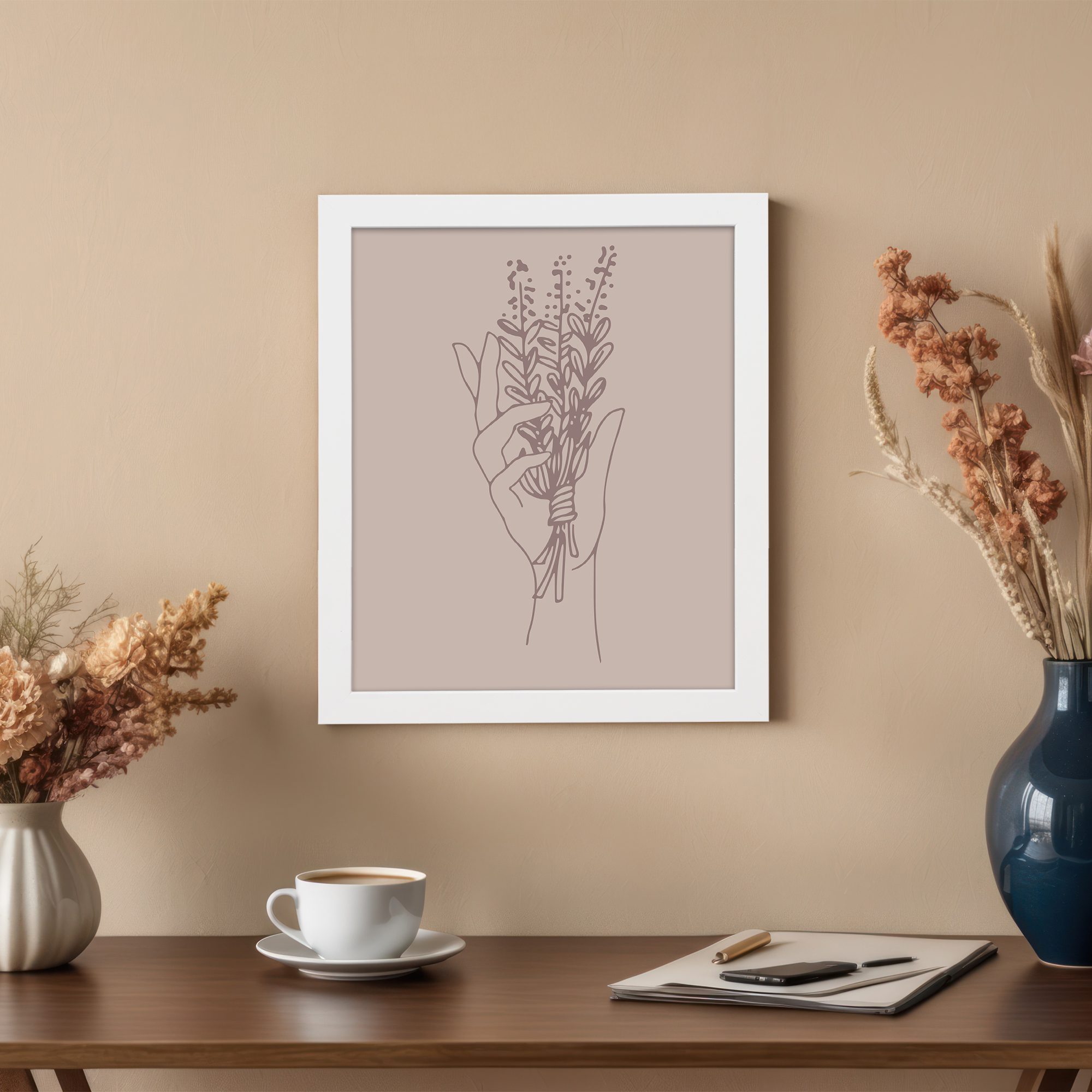 Bring a soft and expressive touch to your space with our Minimalist Wall Art. This design features a hand holding a bouquet of delicate floral stems, illustrated in fine line art for a clean and artistic composition.