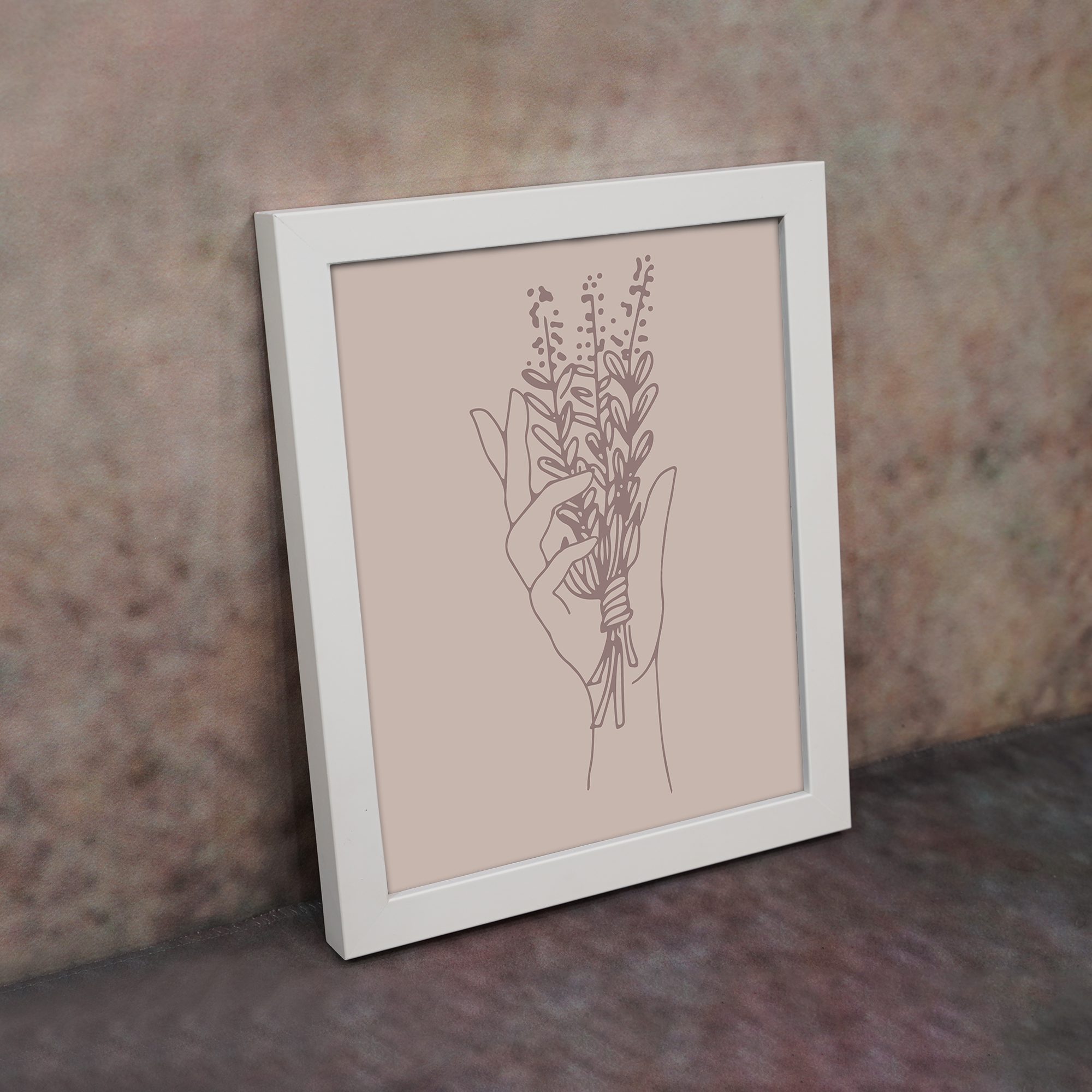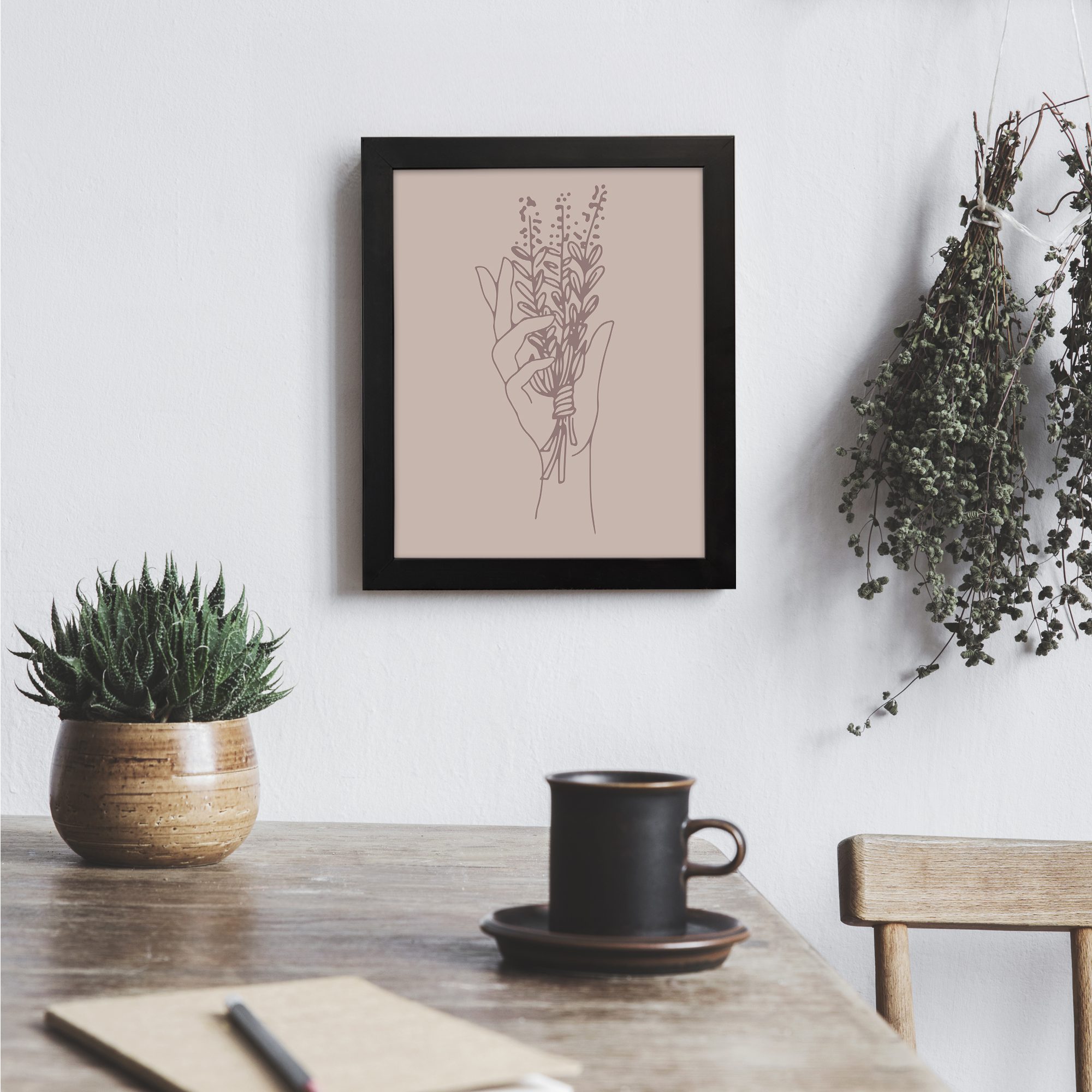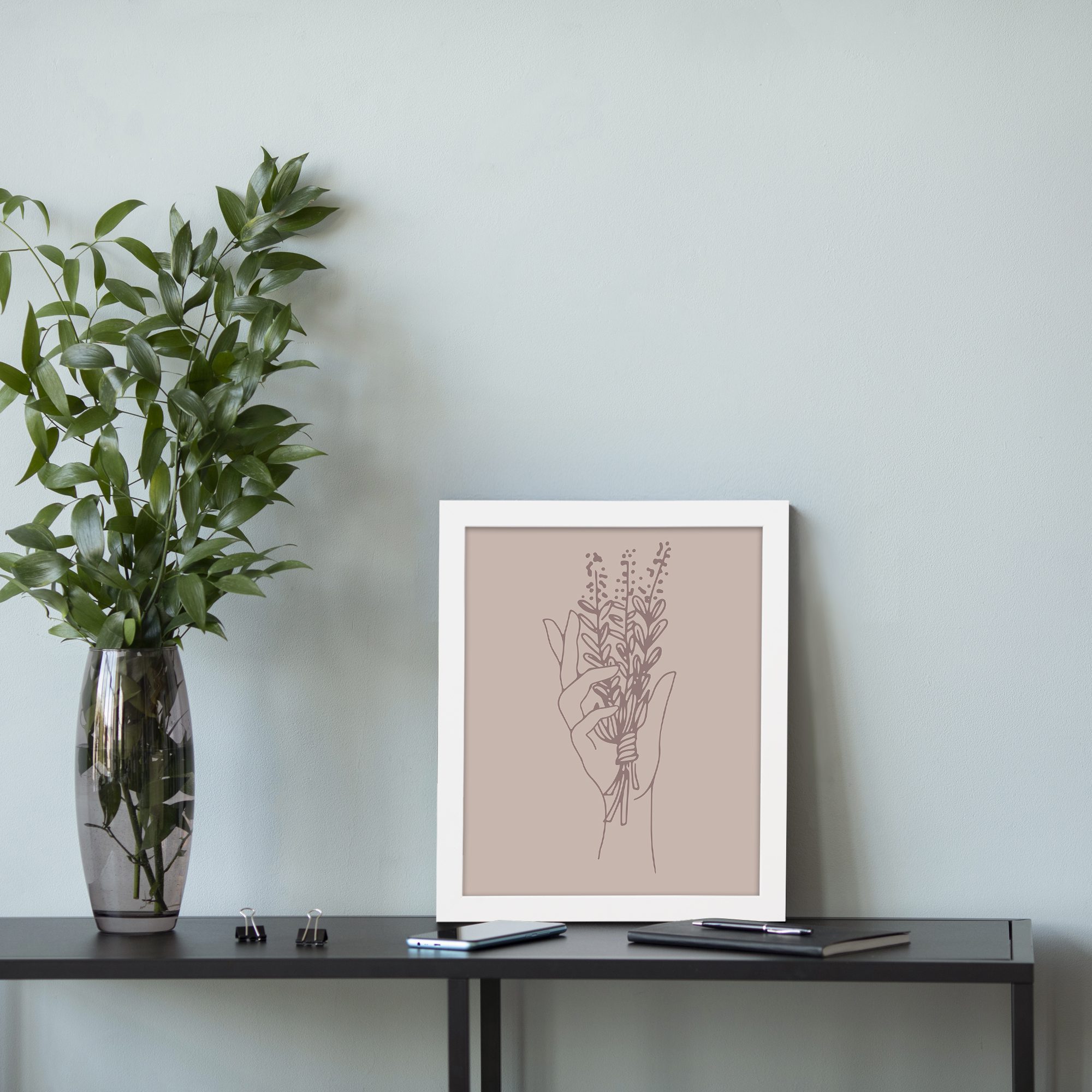 Bring a soft and expressive touch to your space with our Minimalist Wall Art. This design features a hand holding a bouquet of delicate floral stems, illustrated in fine line art for a clean and artistic composition.