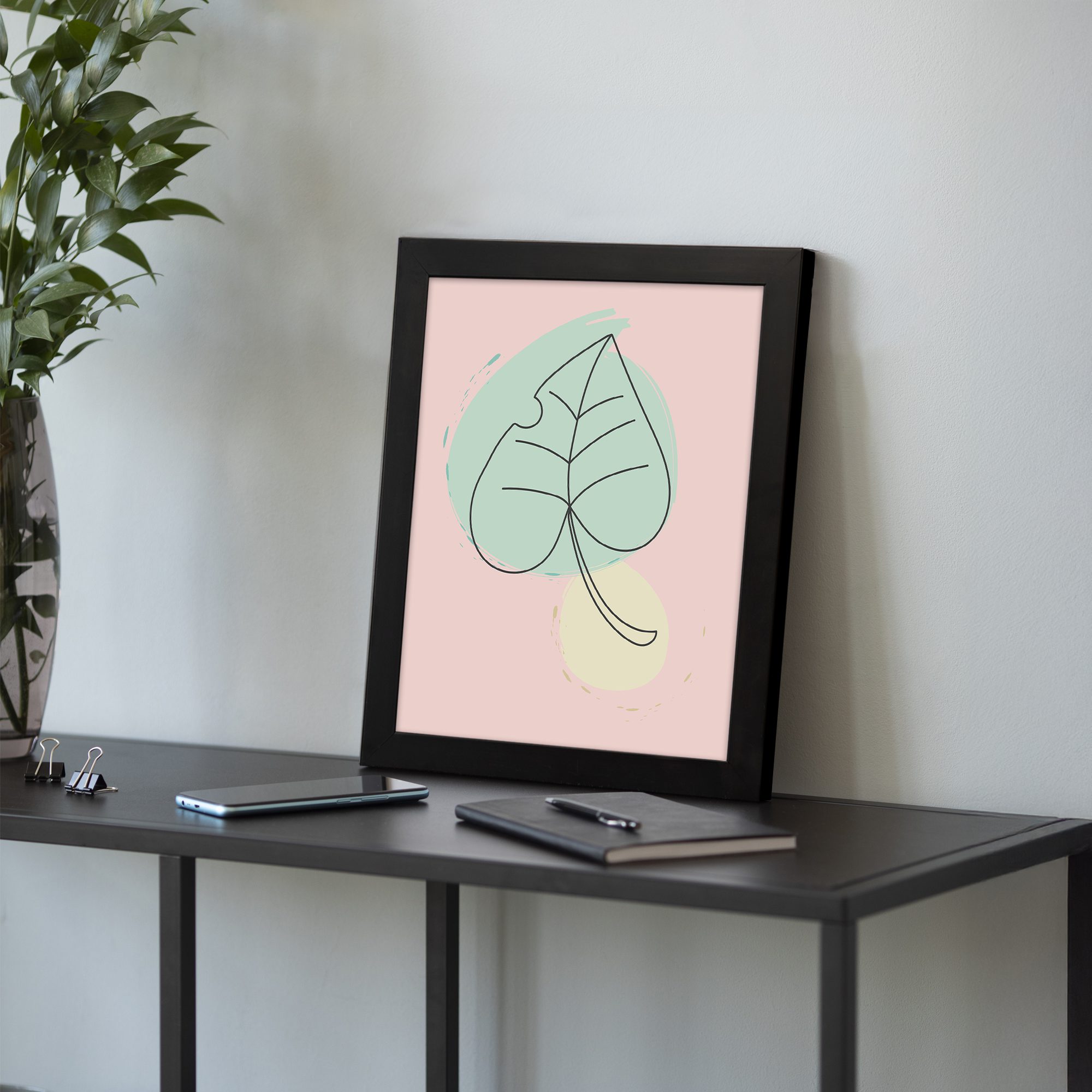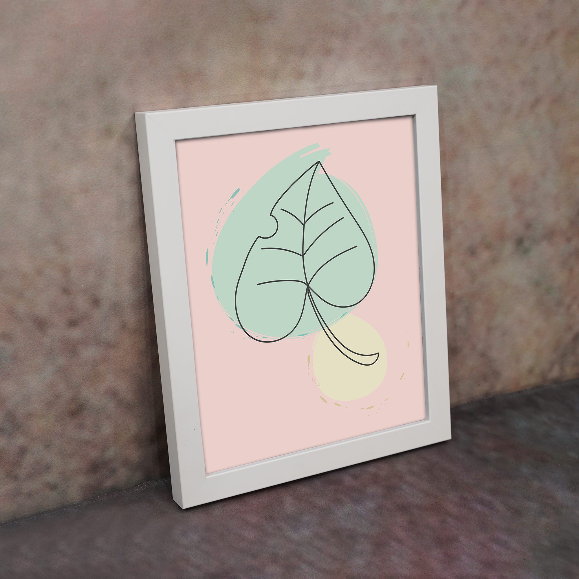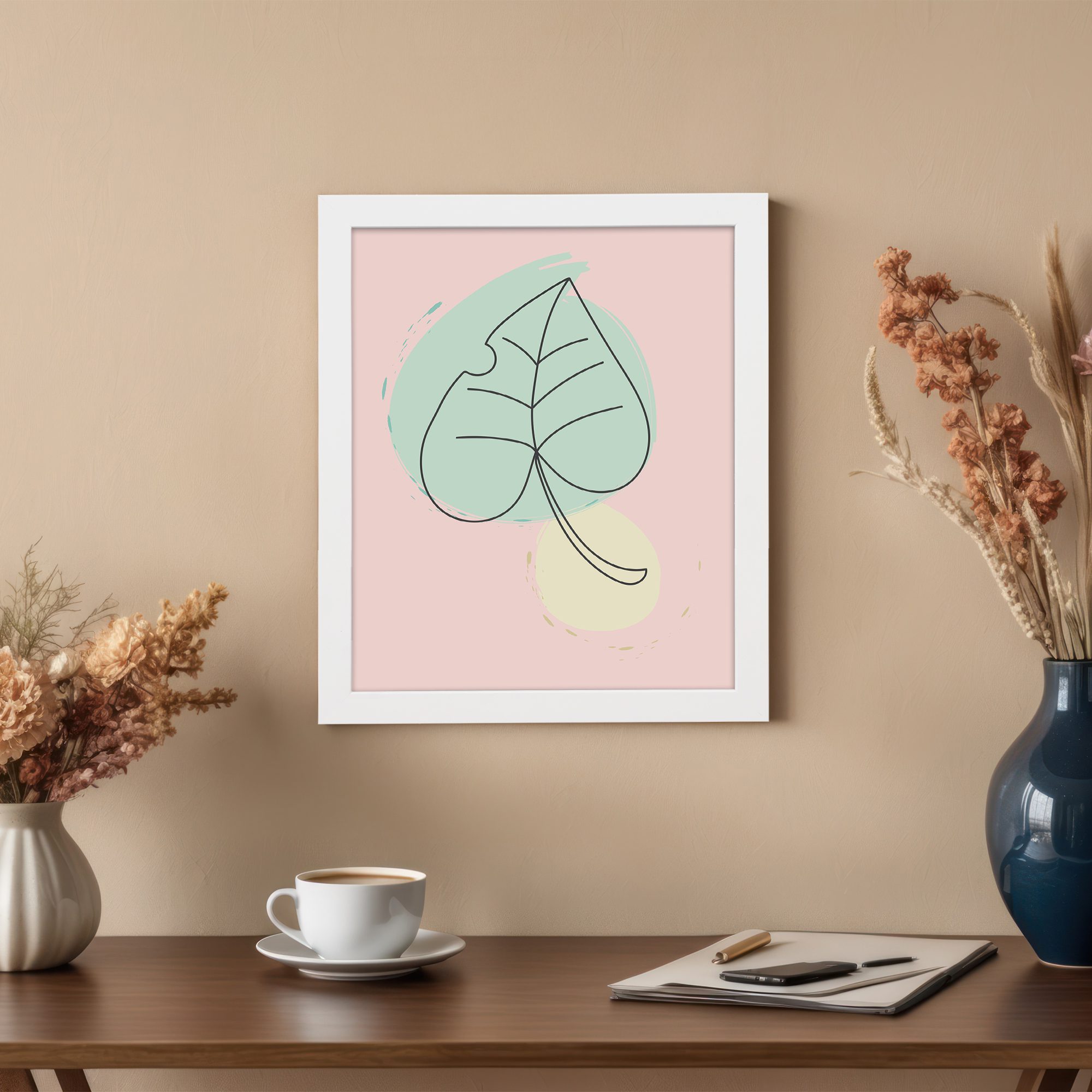 Bring a soft and refreshing touch to your space with our Minimalist Wall Art. This design features a simple leaf line art illustration combined with gentle pastel shapes in the background. The composition is clean and minimal, creating a calm and modern aesthetic.
