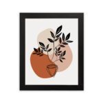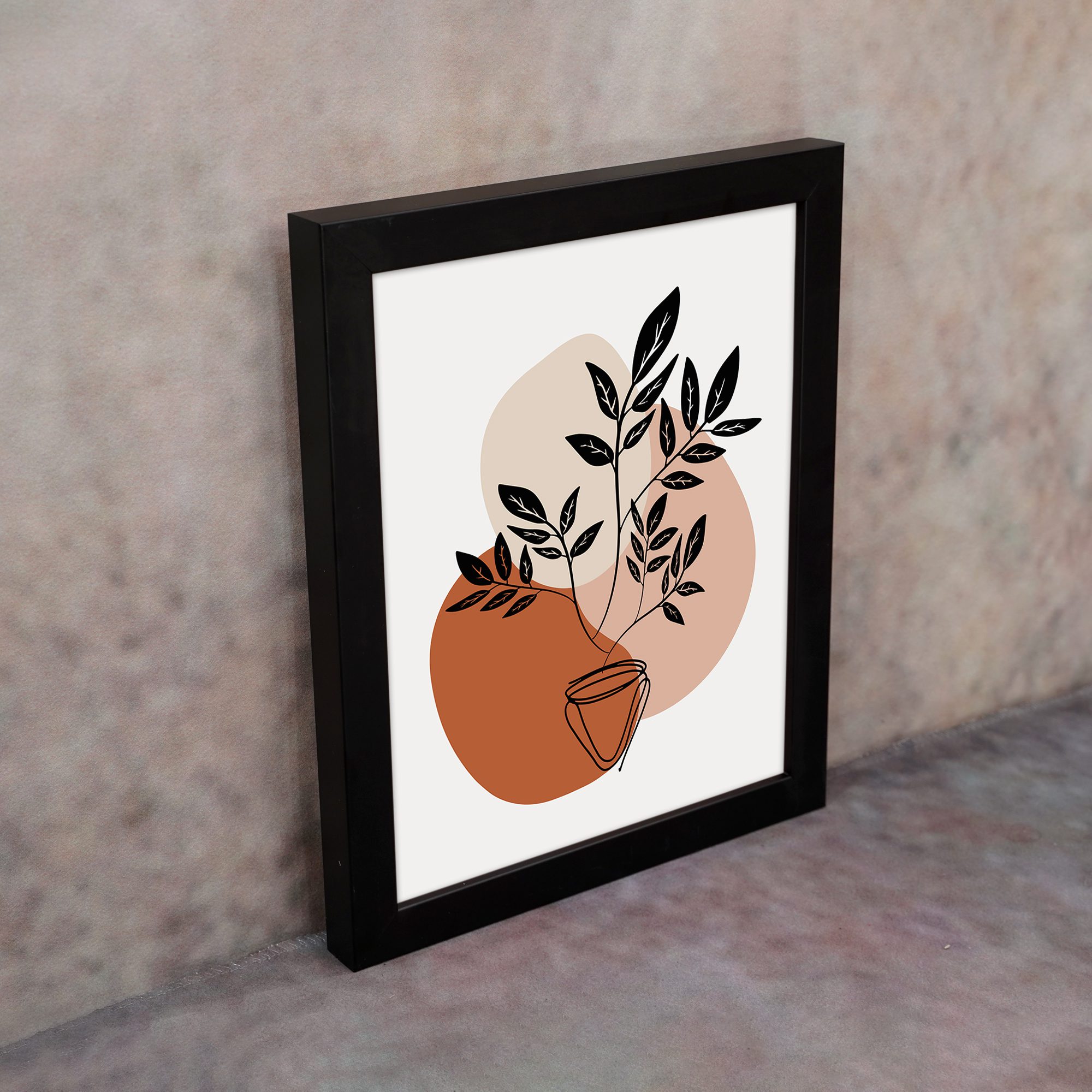 The color palette includes warm terracotta, soft beige, and deep black tones, forming a strong yet balanced visual. The contrast between the dark leaves and warm background shapes adds depth while keeping the overall design simple.