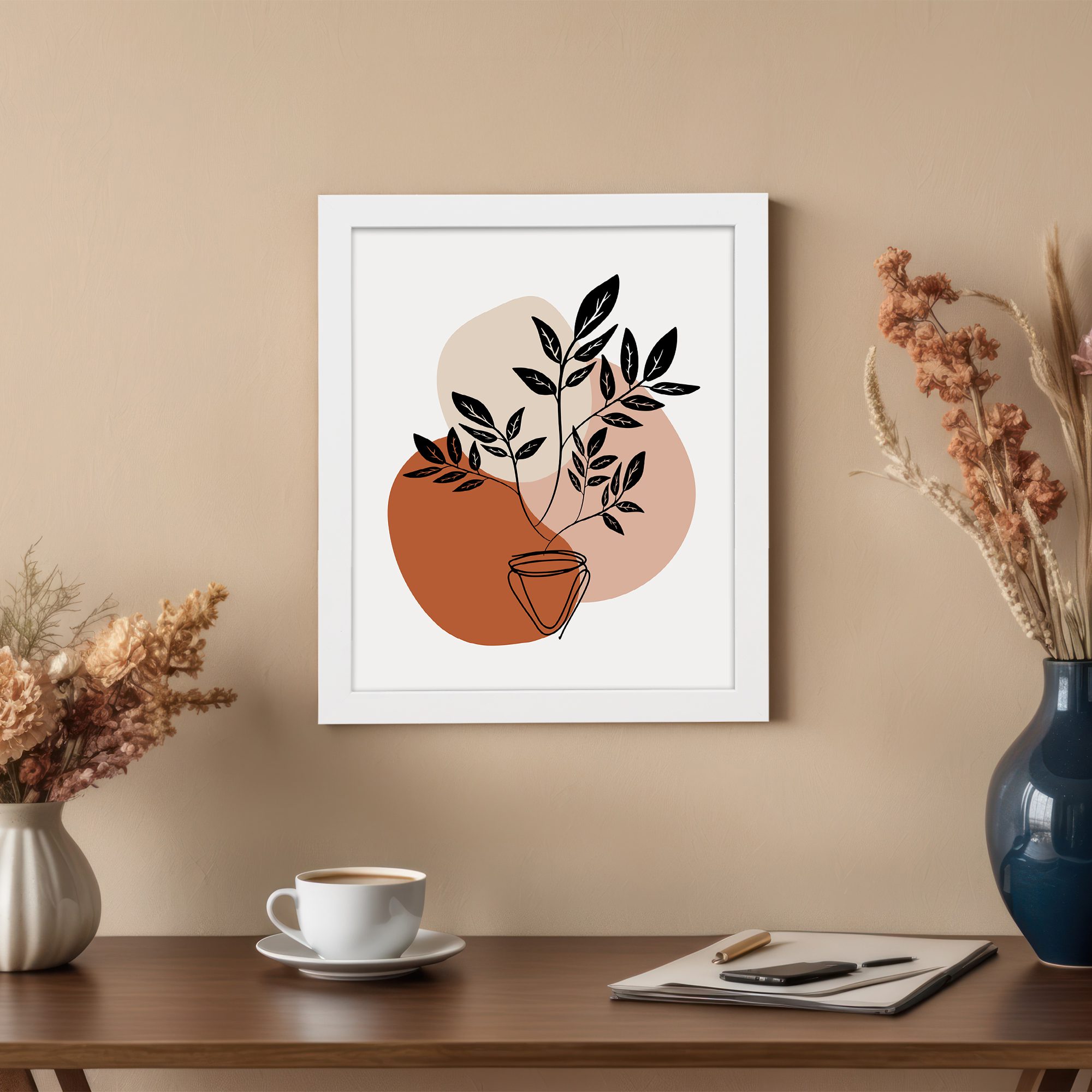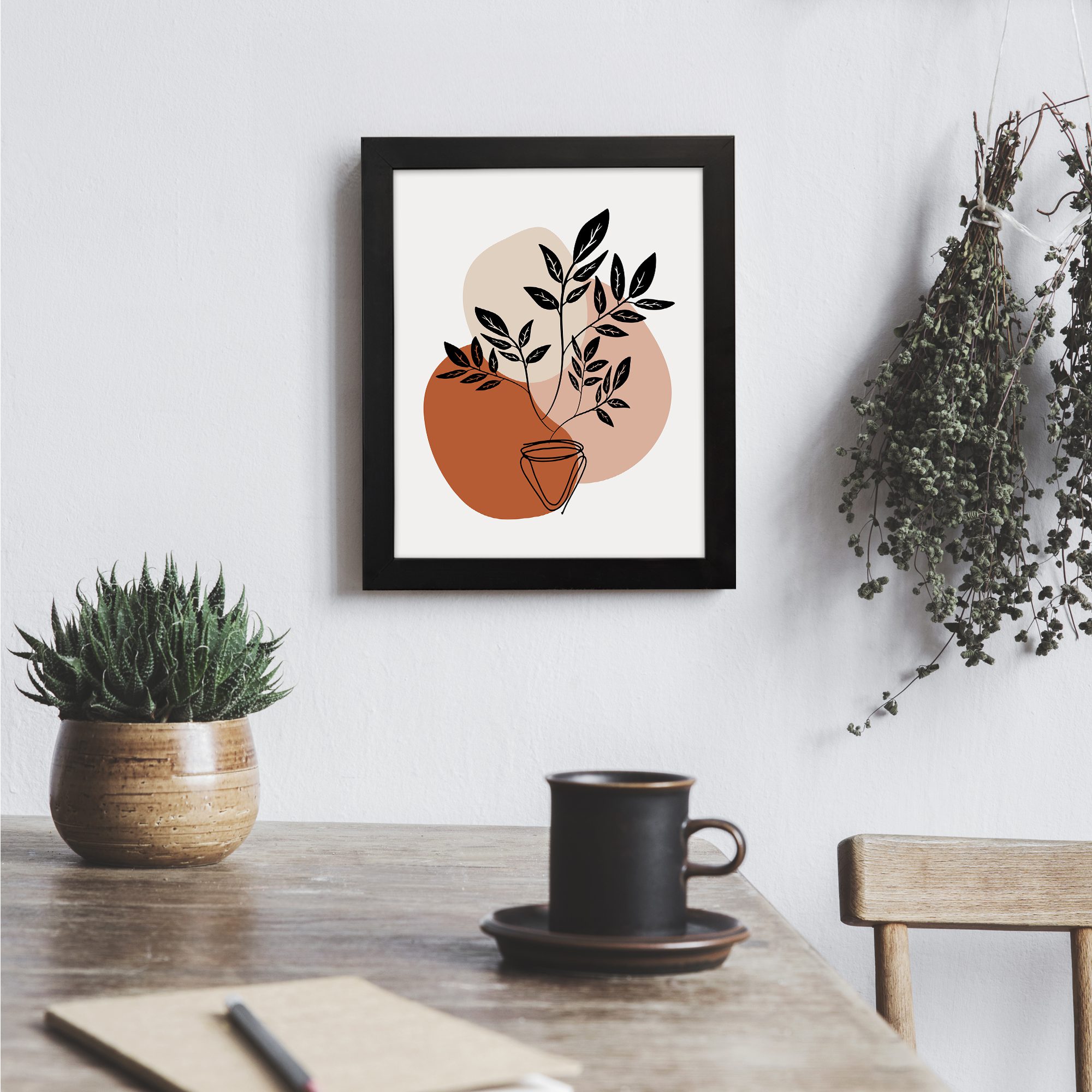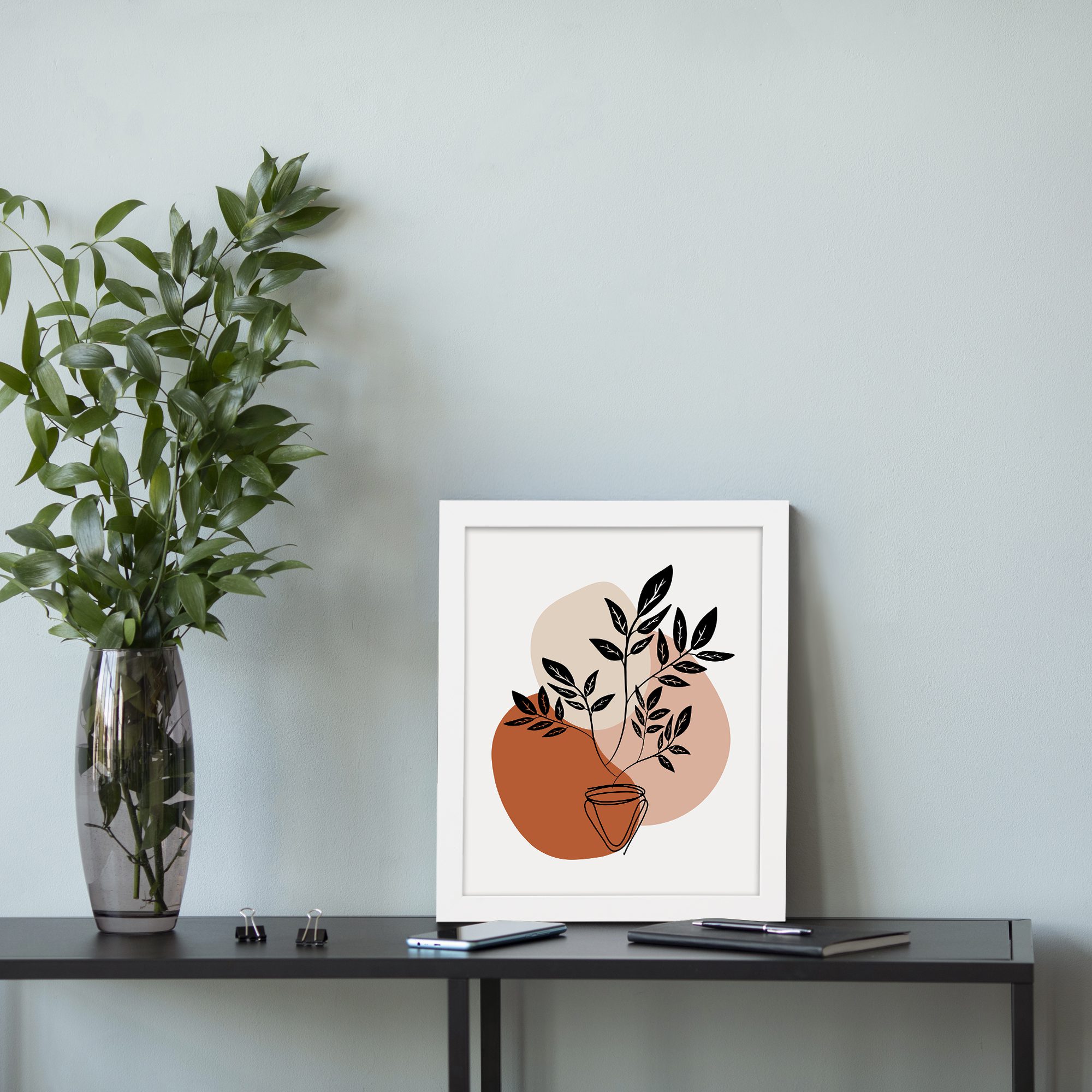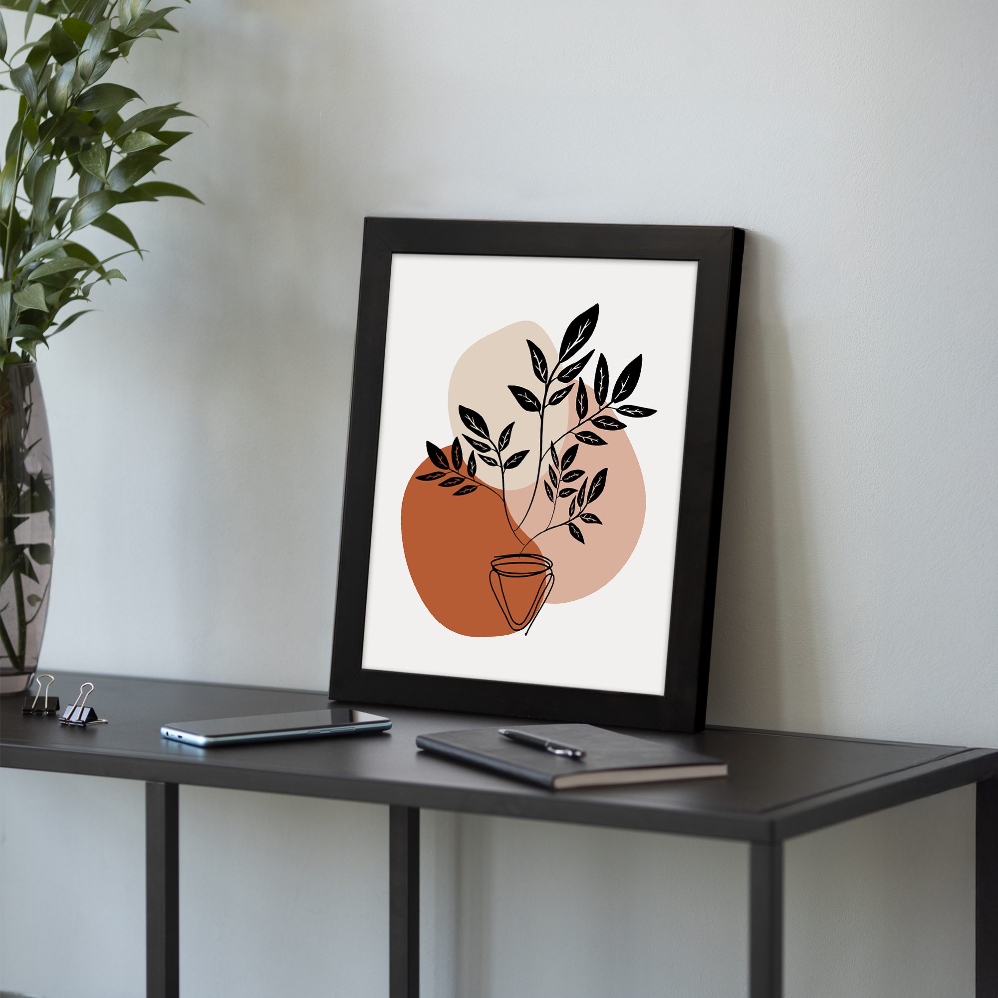 Add a bold yet minimal botanical touch to your space with this Minimalist Wall Art. The design features a potted plant with filled leaf silhouettes, layered over soft abstract shapes to create a clean and modern composition.