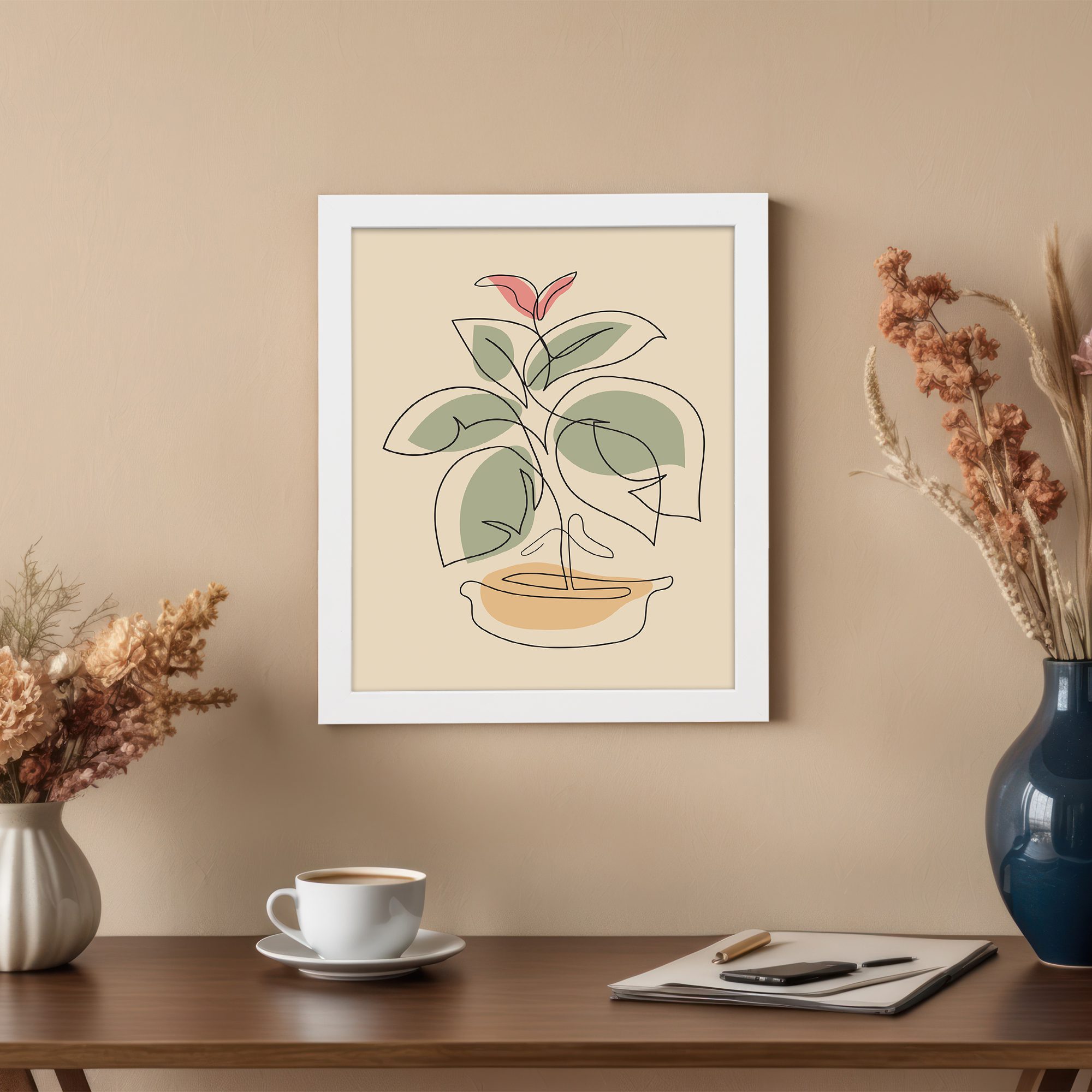 Bring a calm and natural touch to your space with our Minimalist Wall Art. This design features a simple potted plant illustrated in clean line art, combined with soft layered shapes. The composition is minimal and balanced, creating a modern and elegant look.