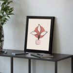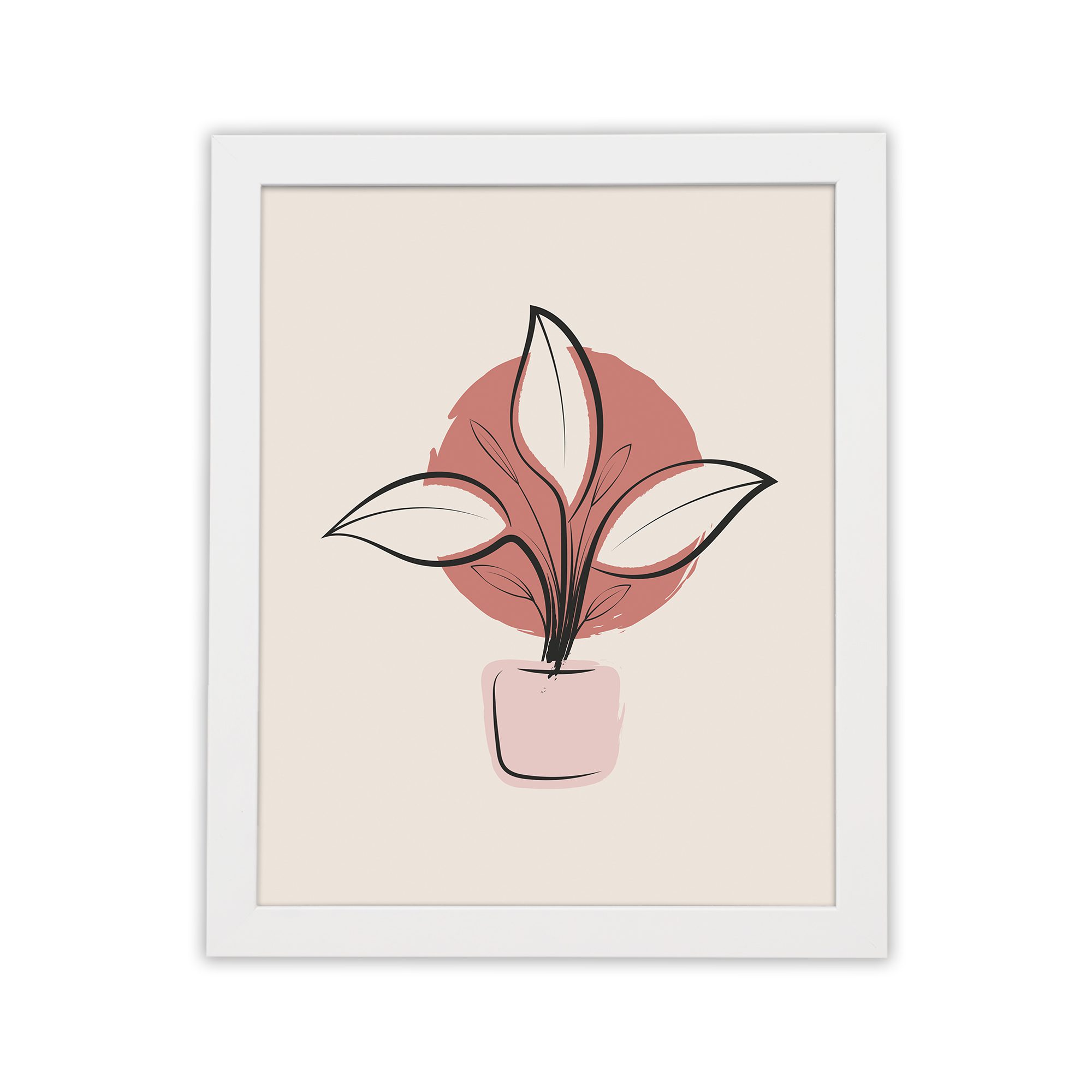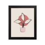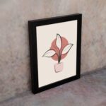 The color palette includes a light beige background, muted red circle, soft pink pot, and dark line detailing, creating a gentle contrast while maintaining a minimal aesthetic. The mix of organic form and geometric shape gives the artwork a contemporary feel.