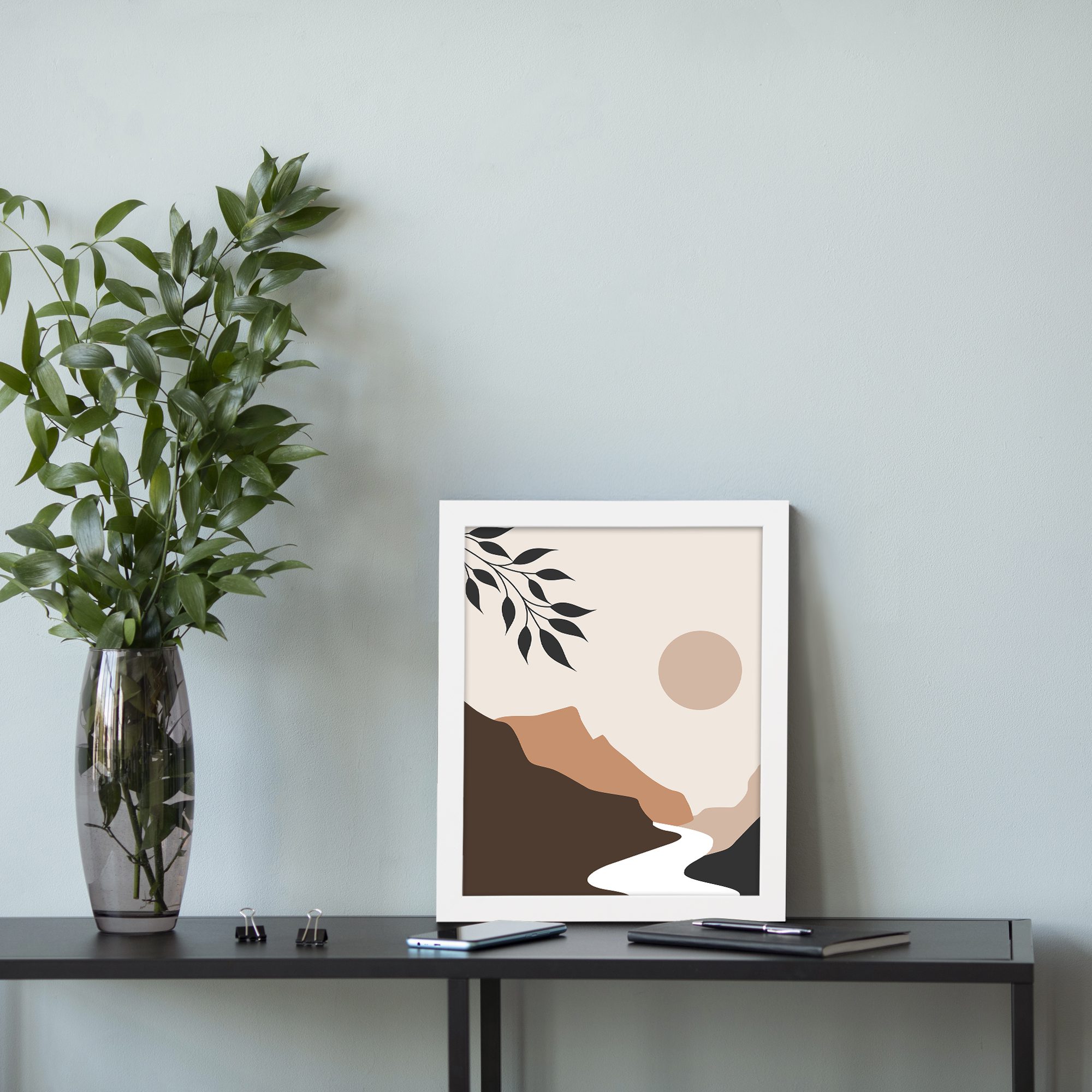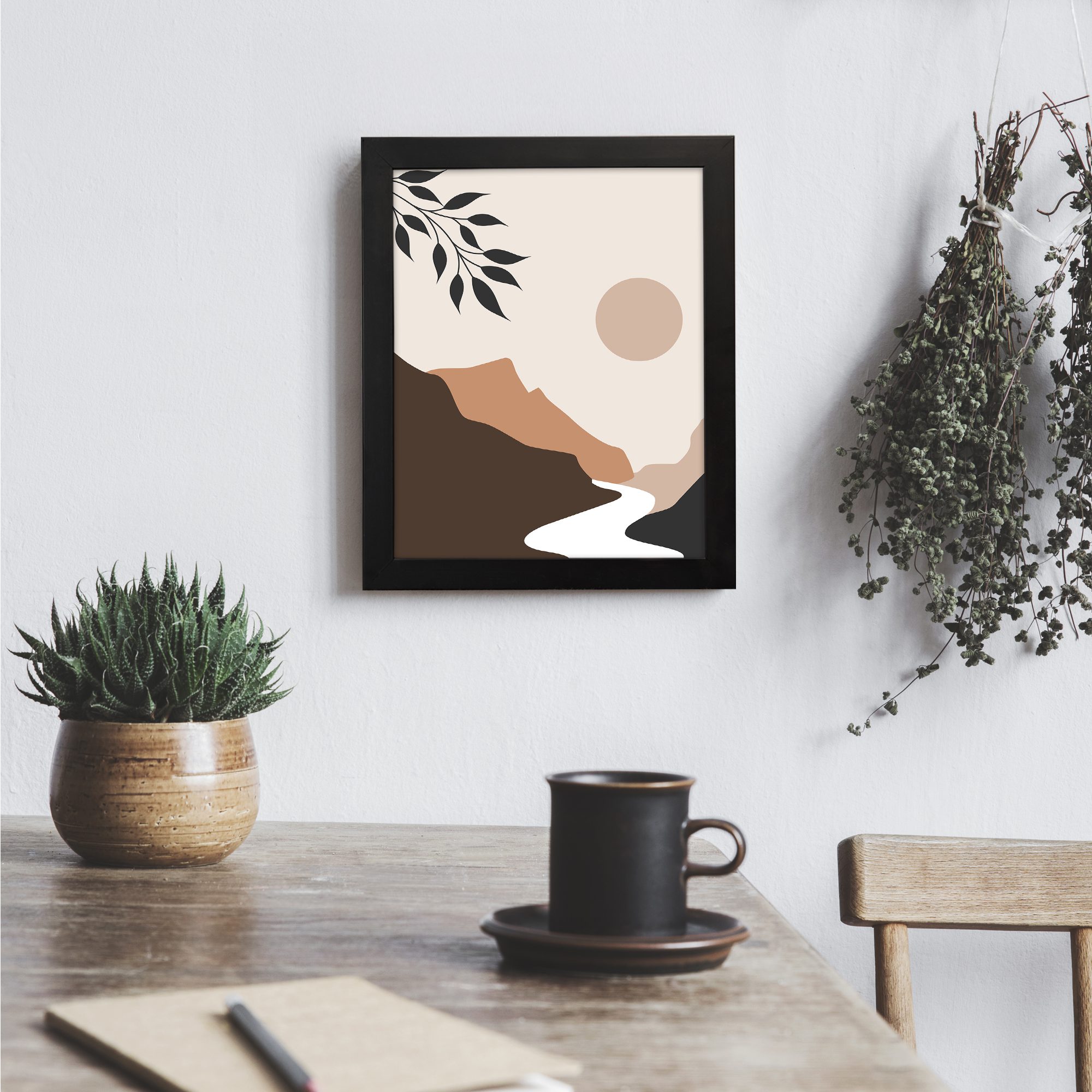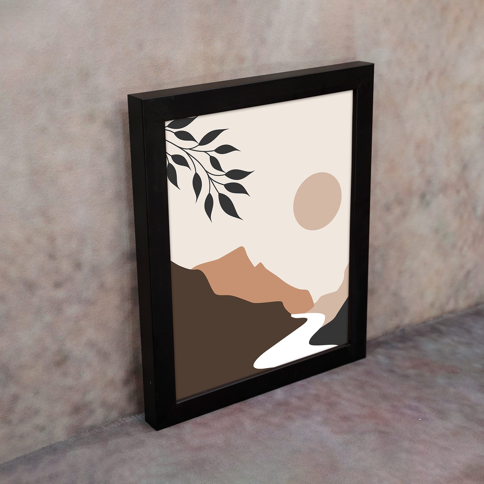 Create a calm and nature-inspired ambiance in your space with this Minimalist Wall Art. The design features a scenic landscape with flowing river elements, soft hills, and a subtle sun, complemented by a delicate leaf detail in the corner.