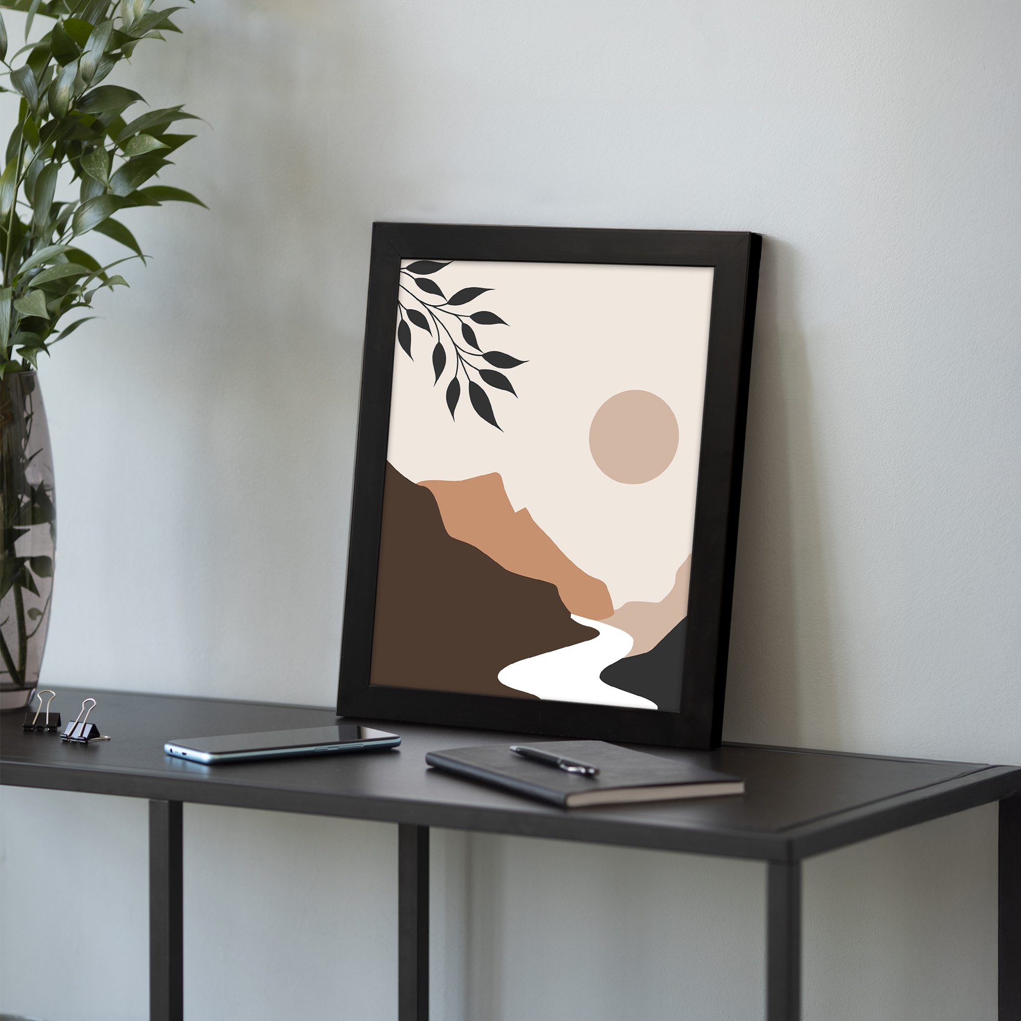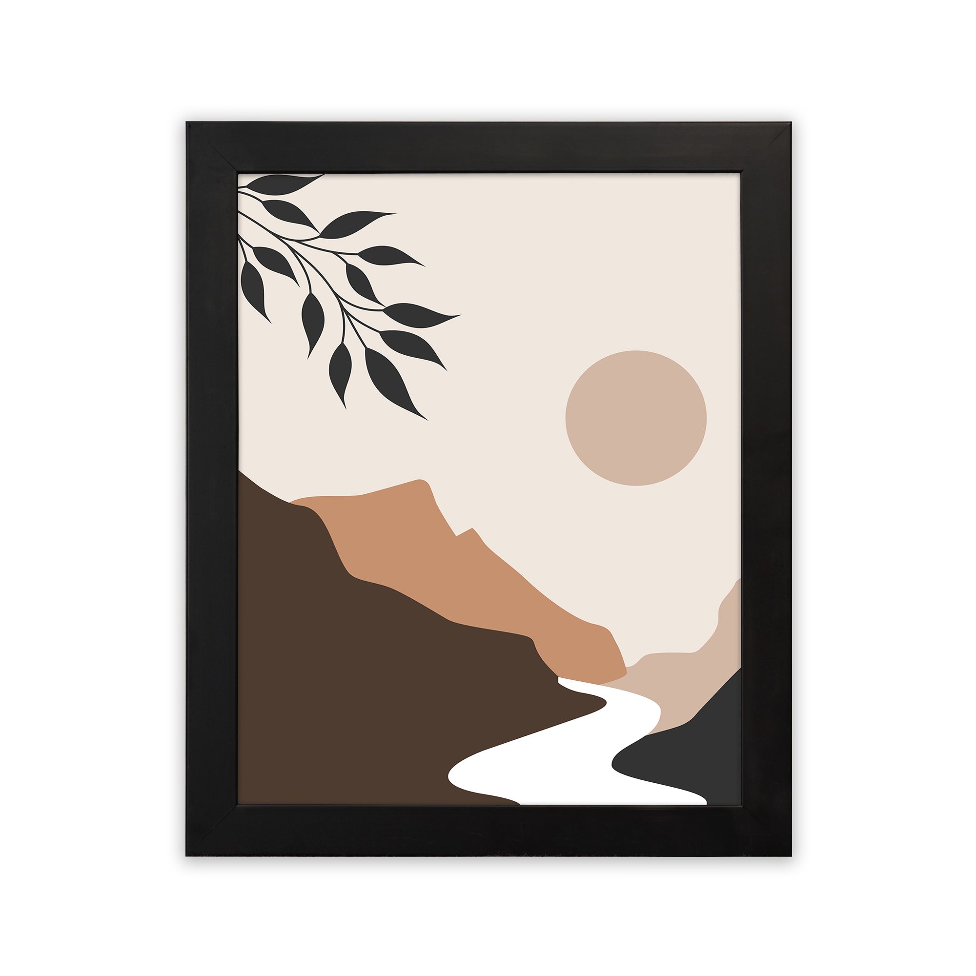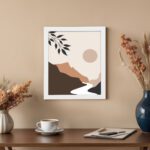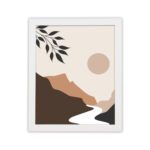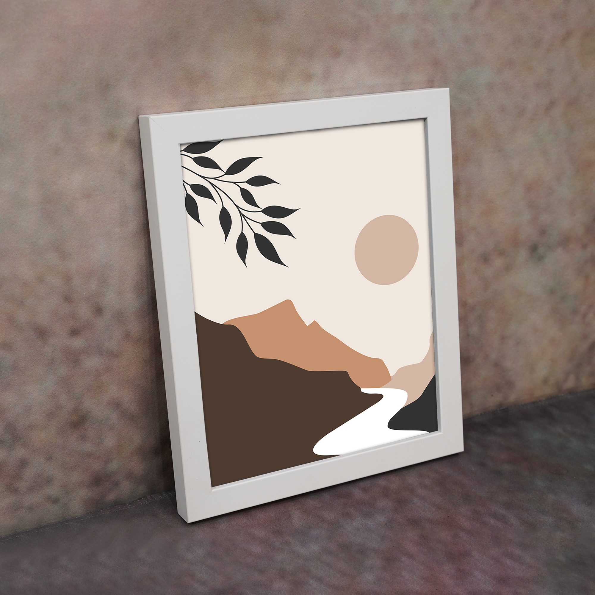 Create a calm and nature-inspired ambiance in your space with this Minimalist Wall Art. The design features a scenic landscape with flowing river elements, soft hills, and a subtle sun, complemented by a delicate leaf detail in the corner.