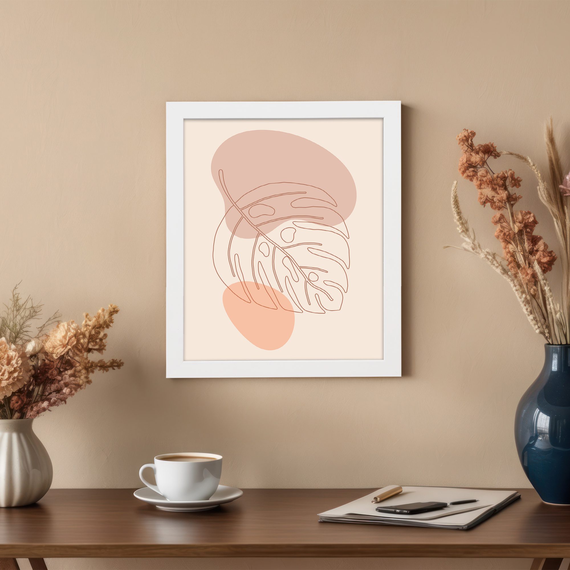 Bring a fresh and elegant touch to your space with our Minimalist Wall Art. This design features a tropical leaf illustrated in simple line art, paired with soft abstract shapes in the background. The composition is clean and balanced, creating a calm and modern aesthetic.
