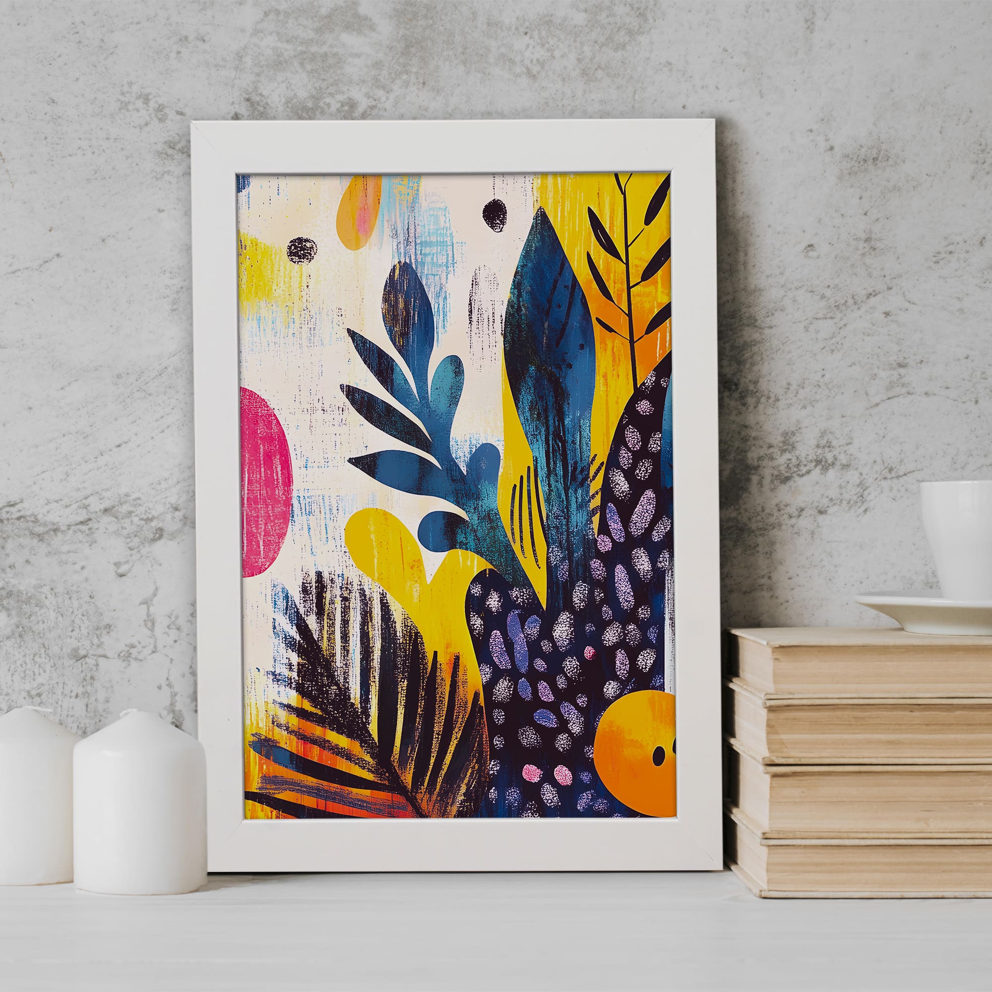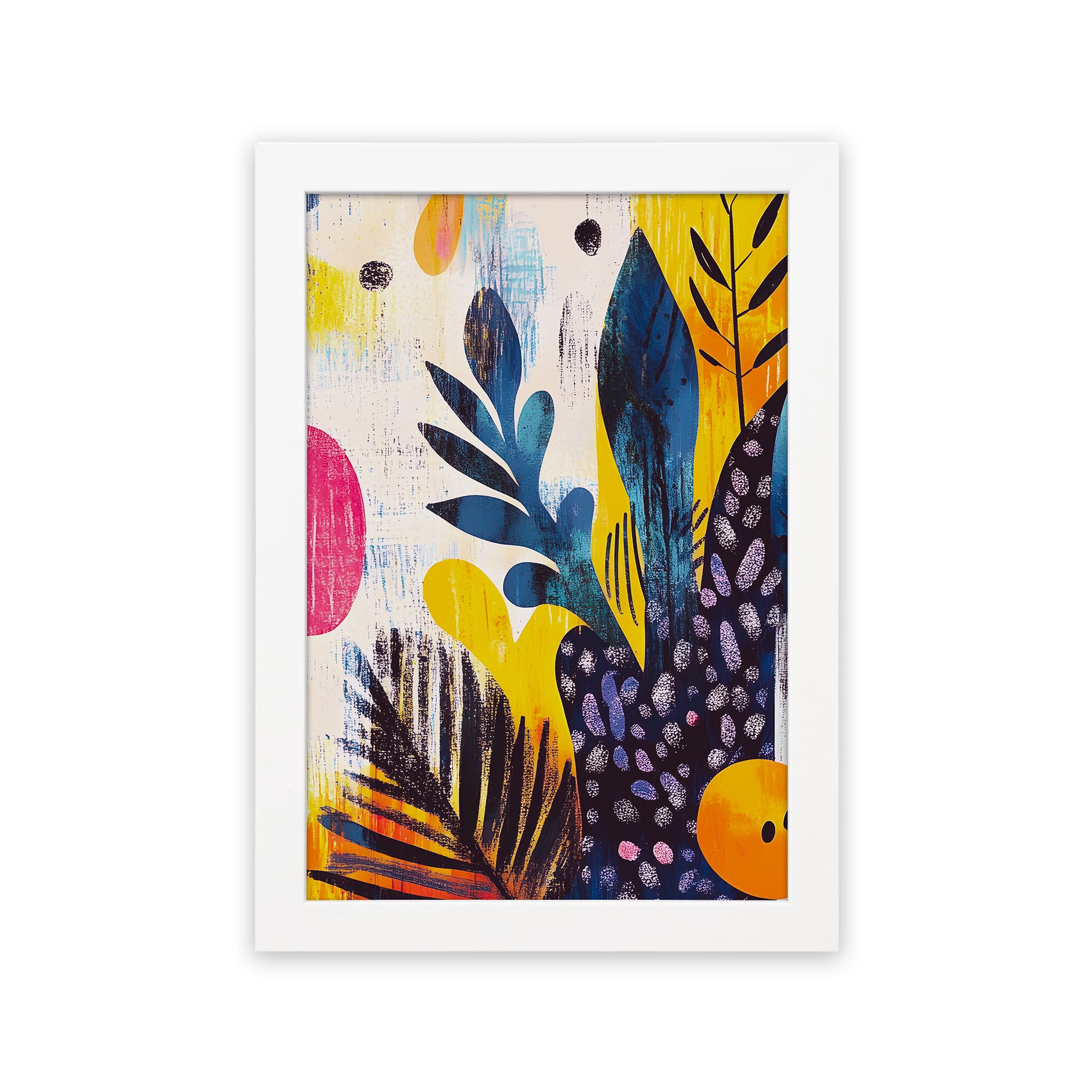 Bring a bold and modern look to your space with this Modern Botanical Abstract Wall Art. This artwork features a stylish mix of leaf patterns and abstract shapes in vibrant shades of yellow, blue, pink, and black. The clean background highlights each element, creating a balanced and eye-catching design.