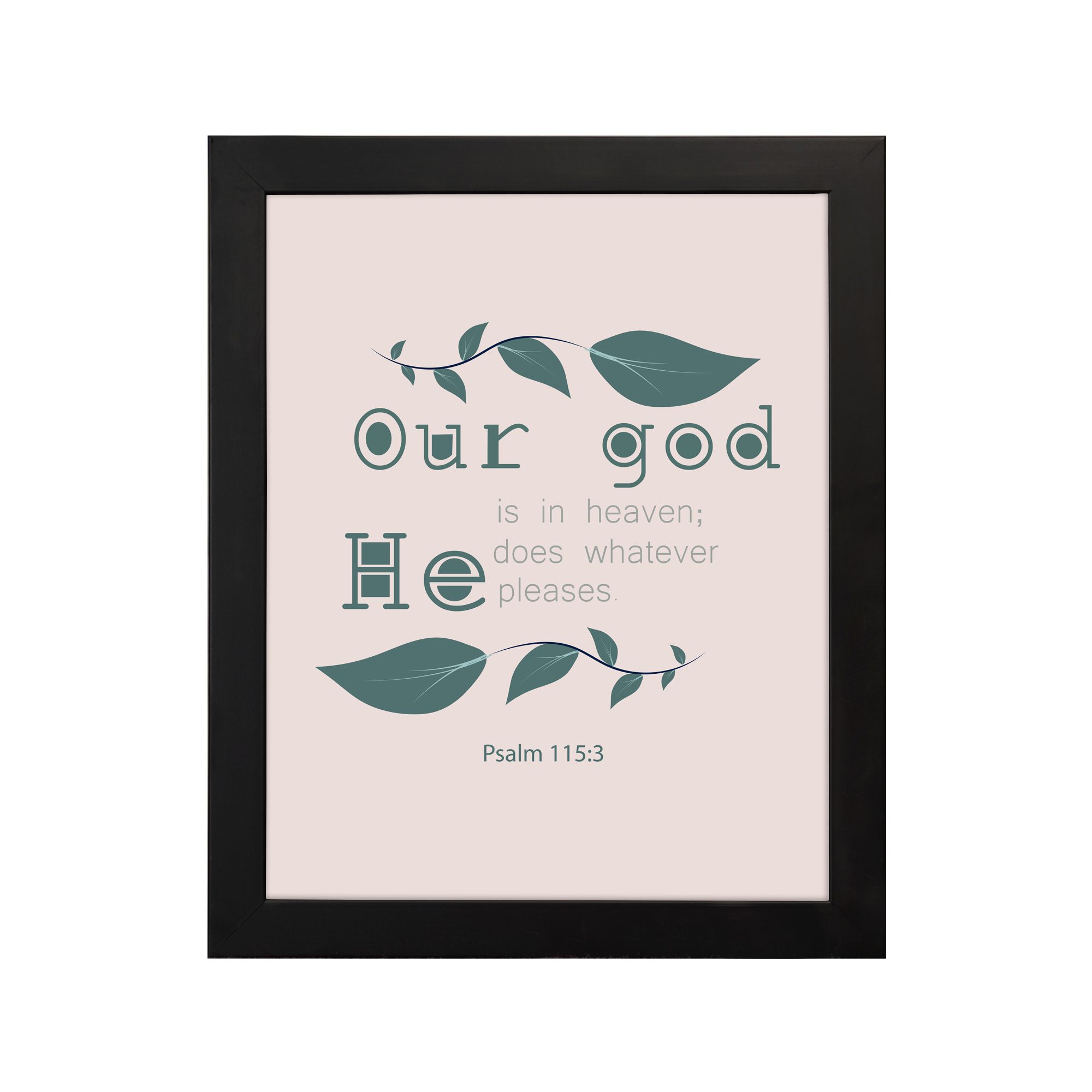 Adorn your home or office with this elegant Christian wall art featuring the inspiring verse from Psalm 115:3. This piece, “Our God Is In Heaven; He Does Whatever Pleases Him,” is beautifully designed with a light pink background and dark green leaf accents, complemented by green font.