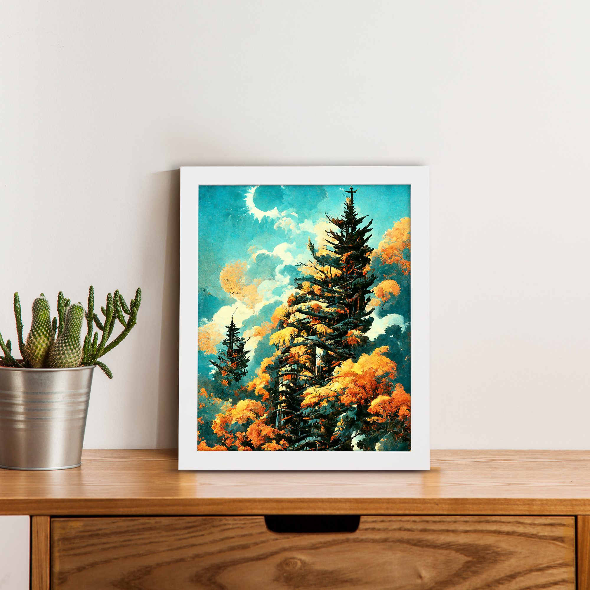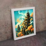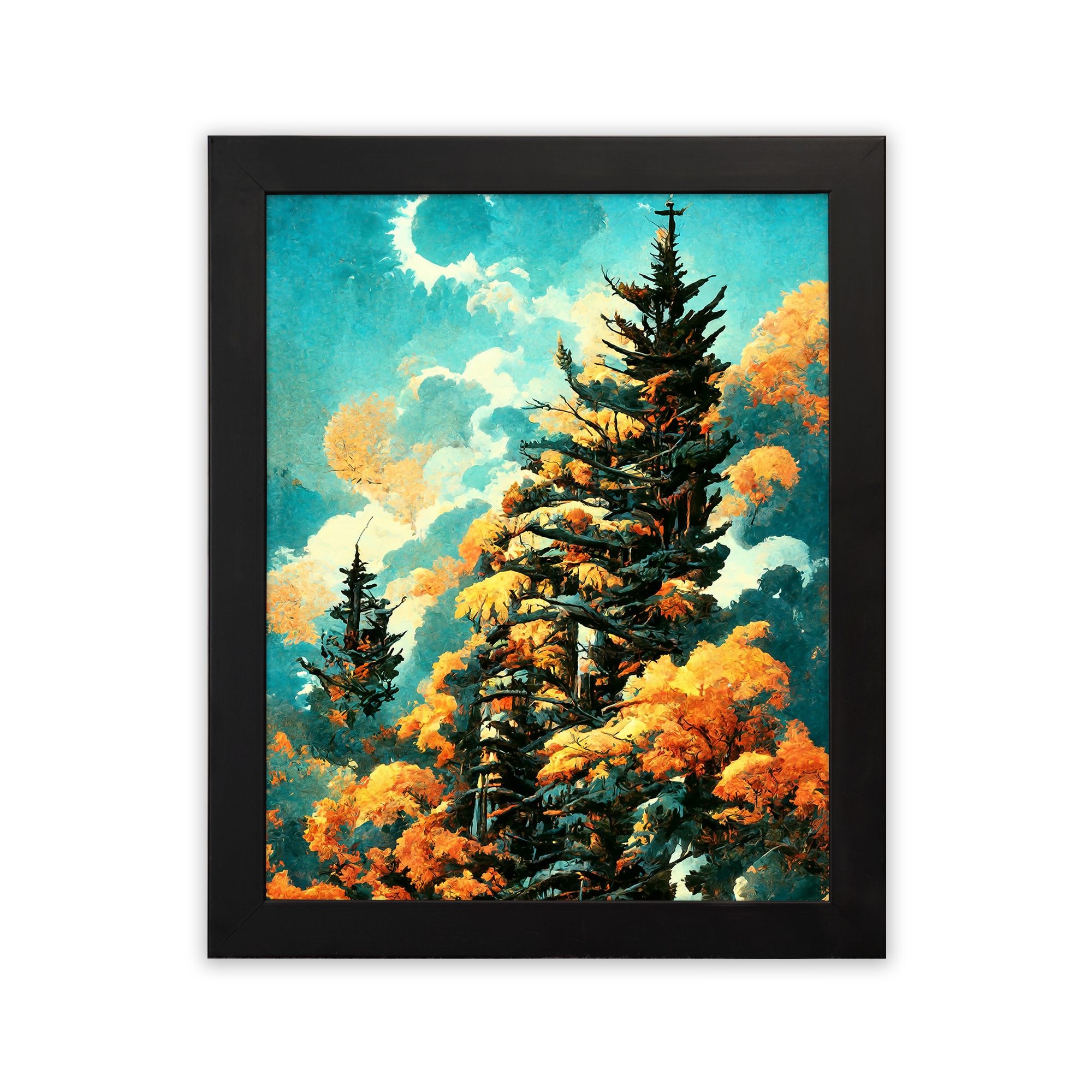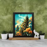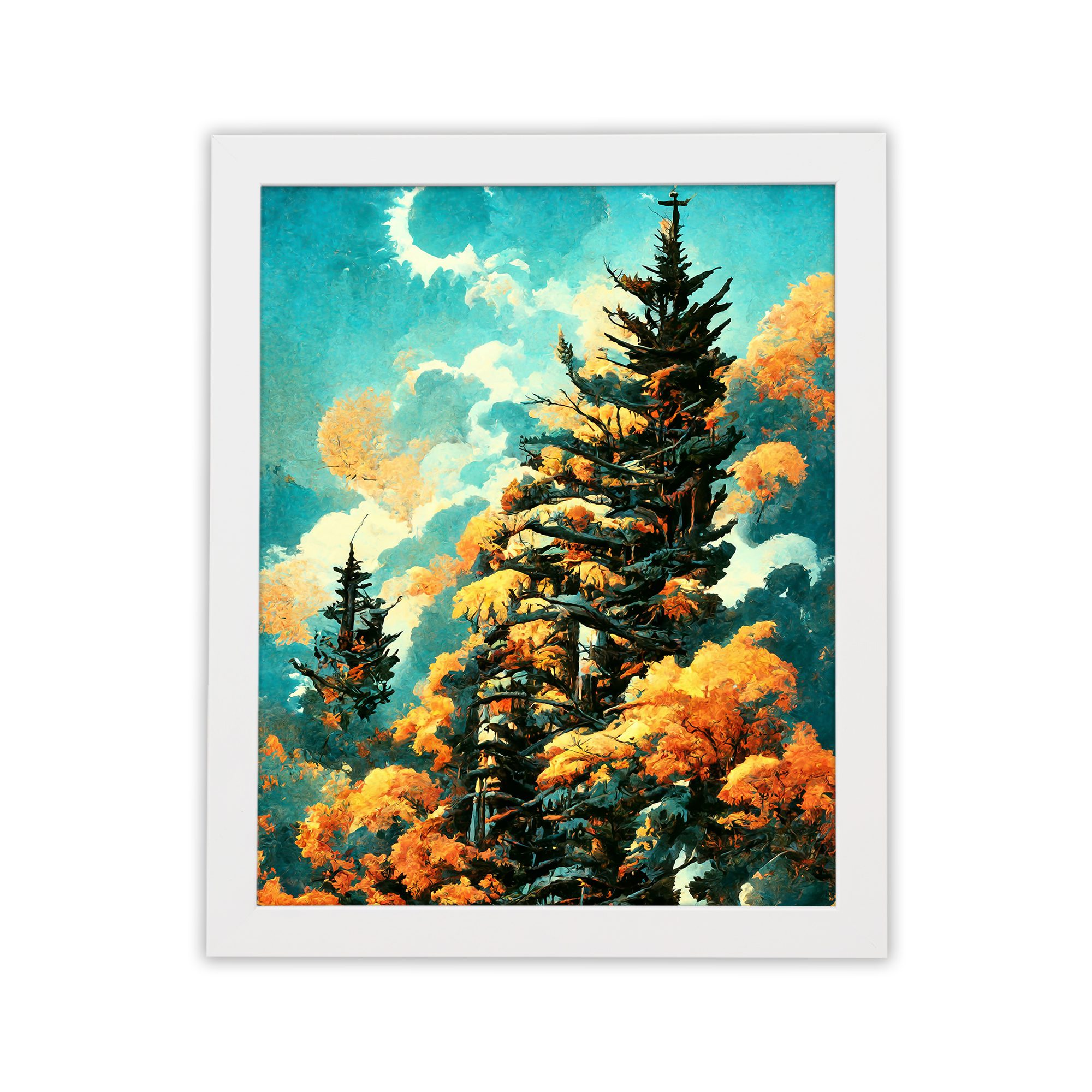 Bring a fresh and vibrant natural feel to your space with this Pine Tree Sky Wall Art. This artwork features tall pine trees surrounded by warm-toned foliage under a bright sky with soft clouds and a glowing moon. The contrast of cool sky tones and warm leaves creates a visually rich and calming scene.
