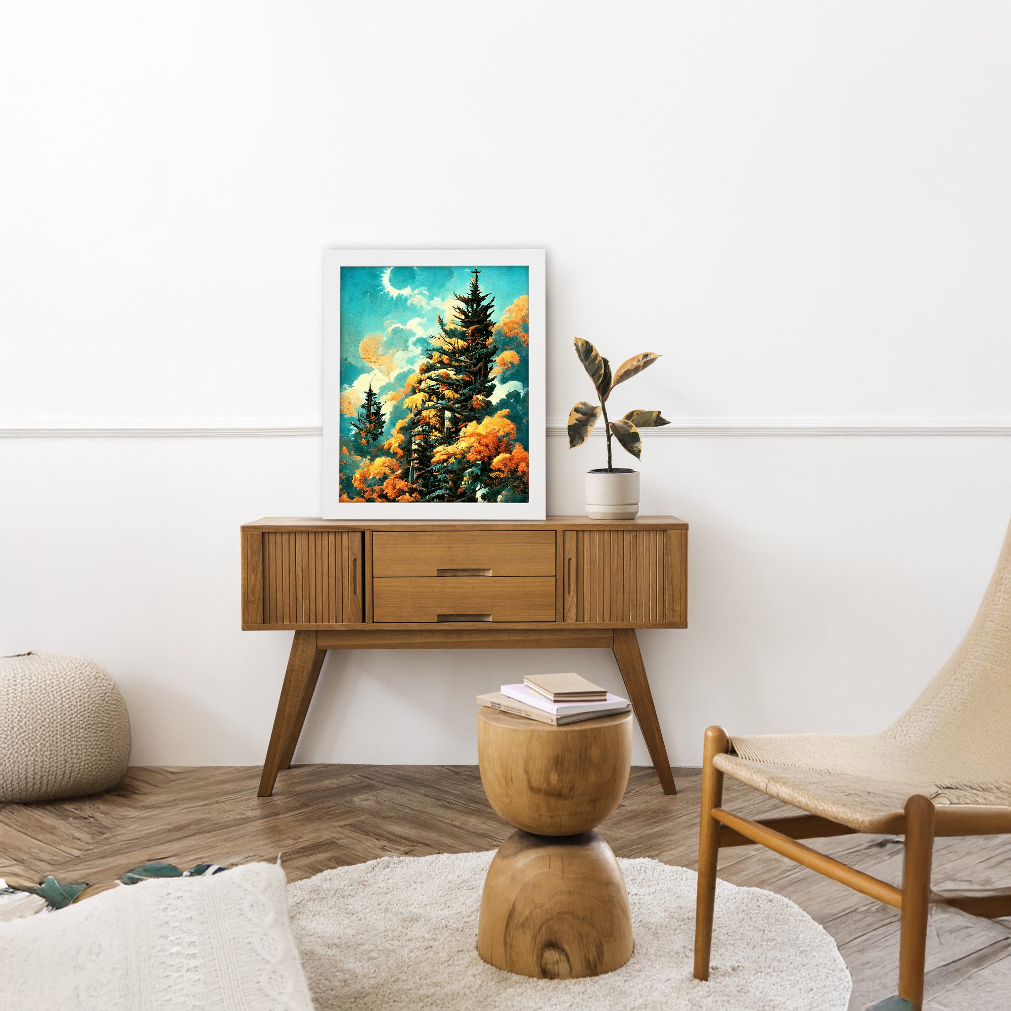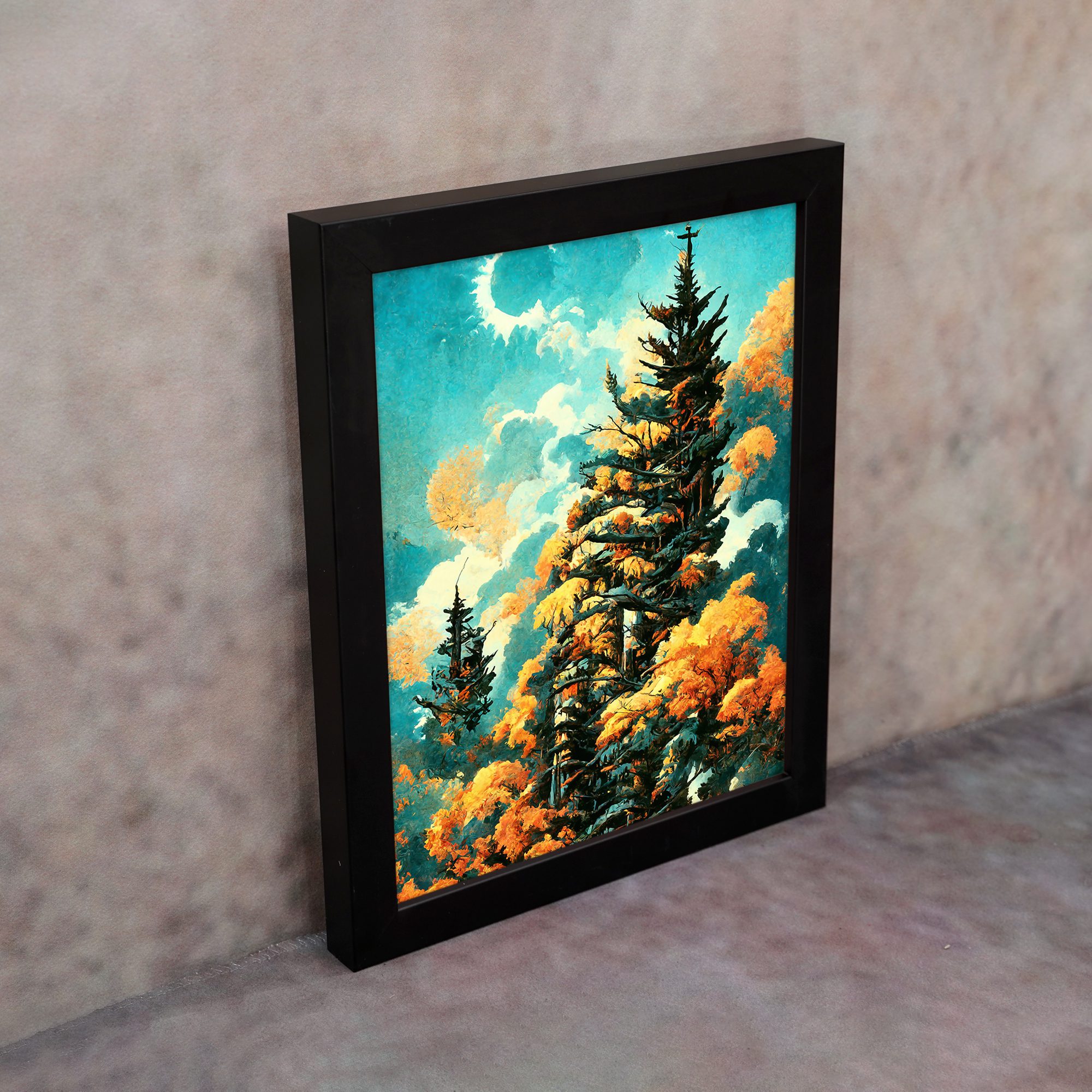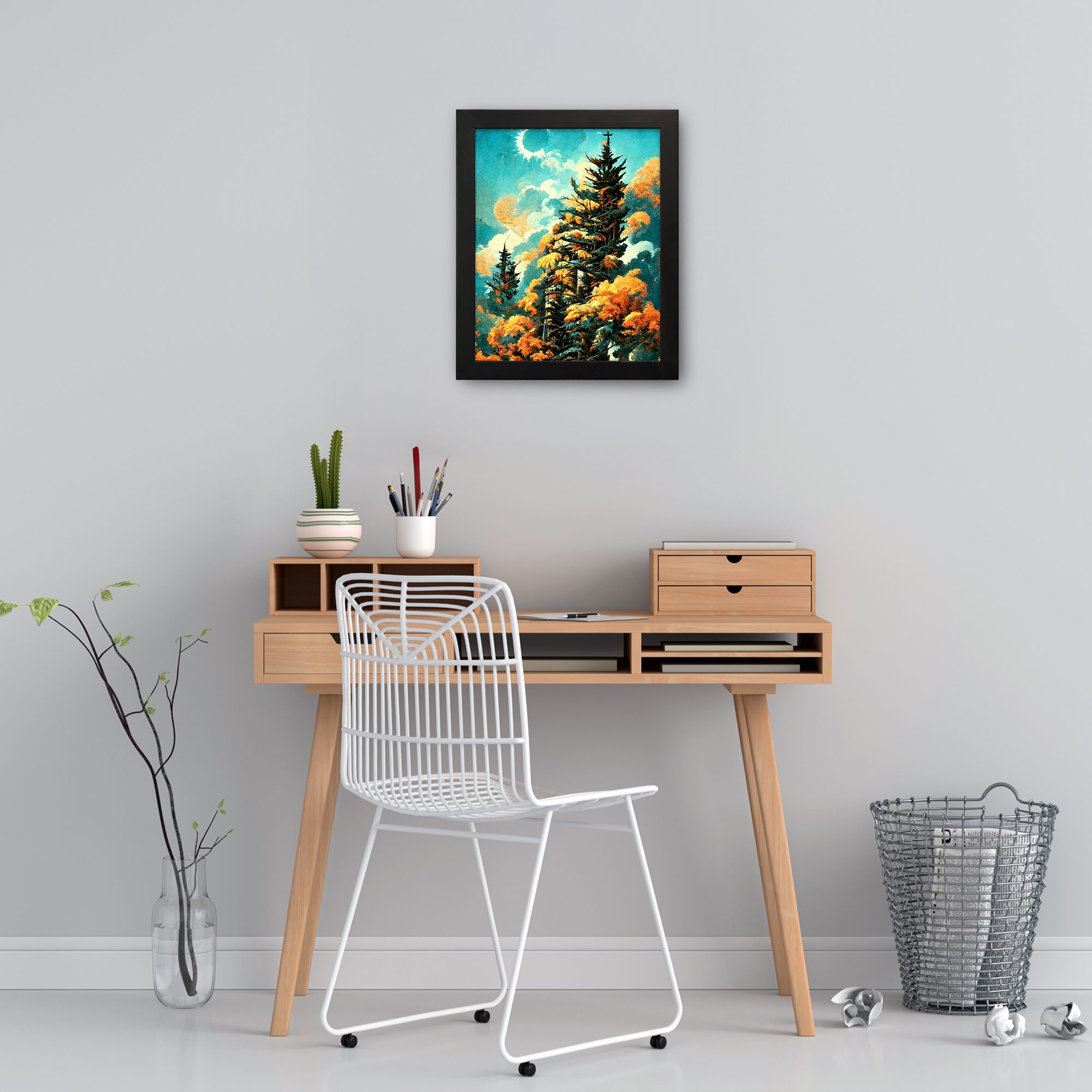Bring a fresh and vibrant natural feel to your space with this Pine Tree Sky Wall Art. This artwork features tall pine trees surrounded by warm-toned foliage under a bright sky with soft clouds and a glowing moon. The contrast of cool sky tones and warm leaves creates a visually rich and calming scene.