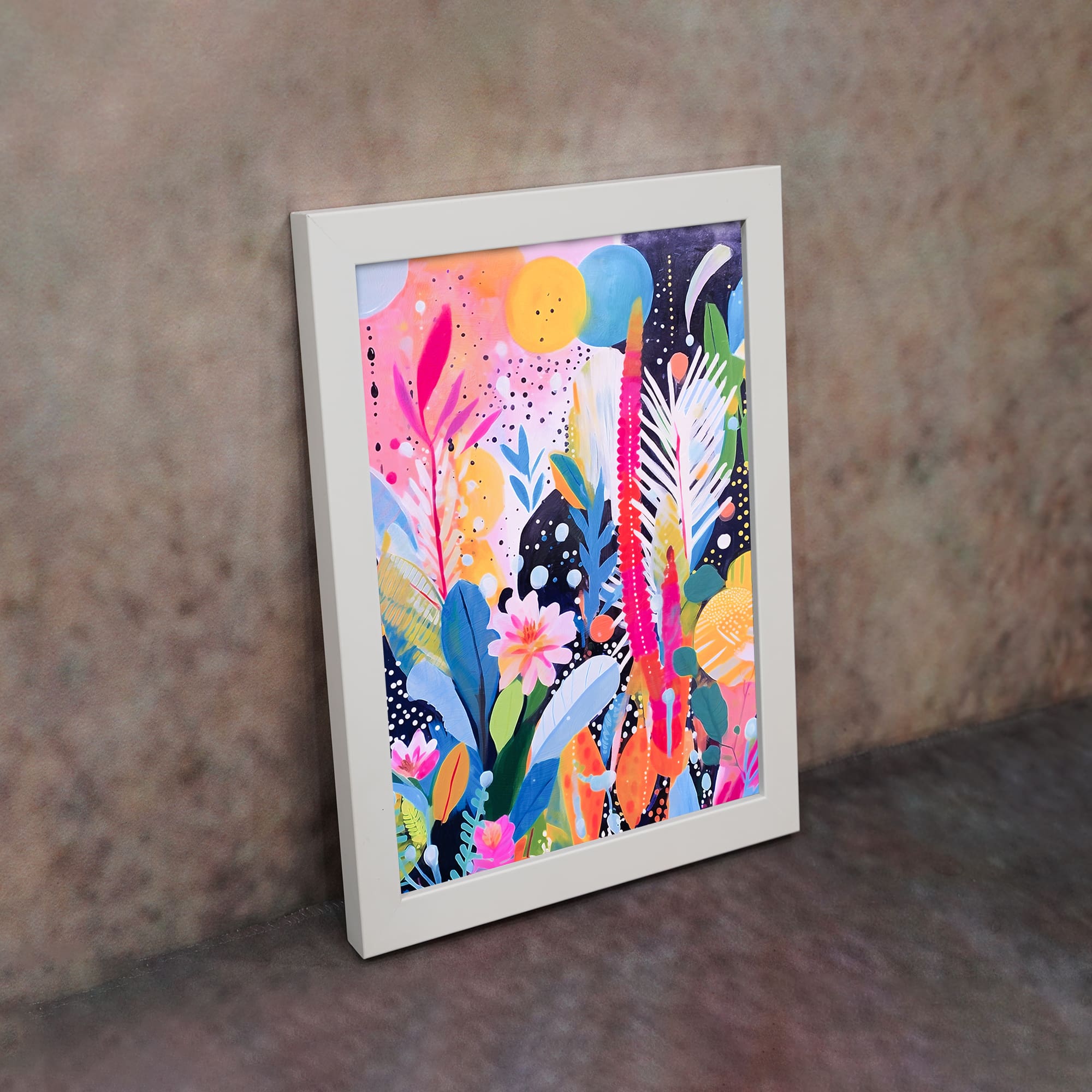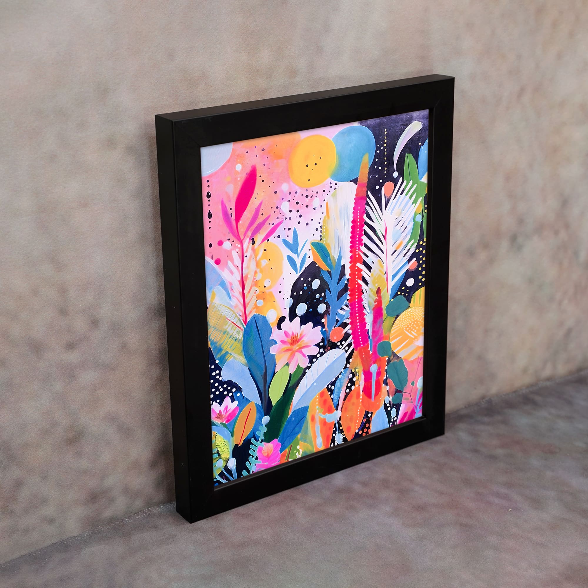 Inspired by floral paintings art, this piece blends bold botanical elements with creative abstract patterns. The mix of bright colors and layered textures adds depth and movement, making it a perfect addition to modern and artistic interiors.