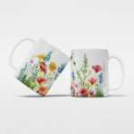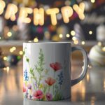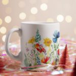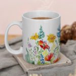 This stylish mug features a beautiful nature-inspired design with leaves and colorful flowers against a white background. The vibrant colors and intricate details will create a cheerful and uplifting atmosphere in your kitchen.