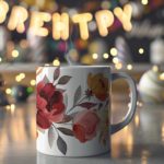 This stylish mug features a beautiful nature-inspired design with leaves and colorful flowers against a white background. The vibrant colors and intricate details will create a cheerful and uplifting atmosphere in your kitchen.