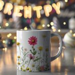 This stylish mug features a beautiful nature-inspired design with leaves and colorful flowers against a white background. The vibrant colors and intricate details will create a cheerful and uplifting atmosphere in your kitchen.