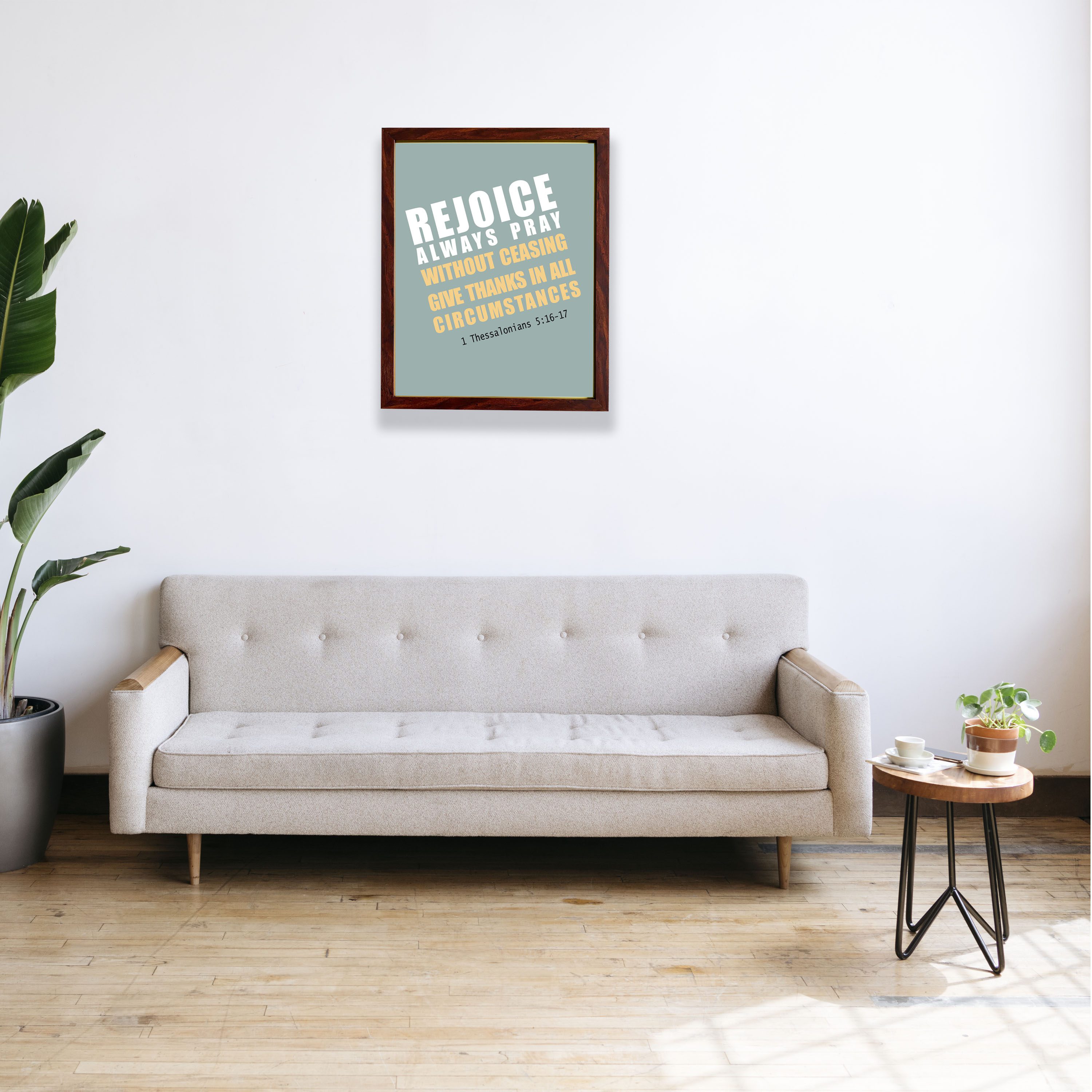 The Infidu will bring hope and inspiration to your area. Always and forever be joyful and grateful, no matter what. 1 Thessalonians 5:16–17 Bible Art for the Wall. This bold piece of Christian wall art reads, “Rejoice always, pray without ceasing, and give thanks in all circumstances.” This bold piece of Christian wall art features text in a modern mix of white and yellow, set against a muted green background and surrounded by black for a clean, modern look.