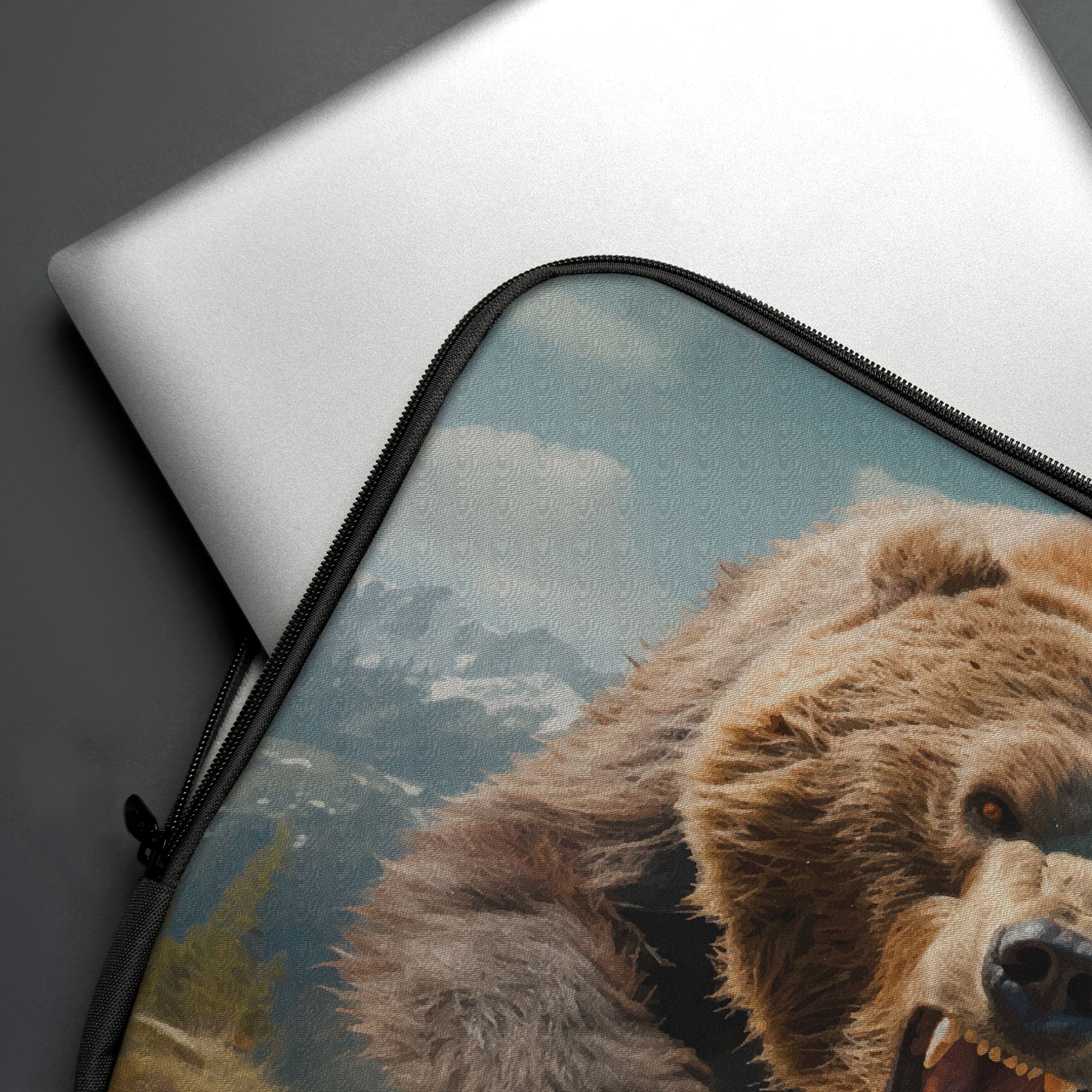 Protect your laptop with the Infidu Roaring Bear Laptop Sleeve, which has a pattern of a mean brown bear on it. With its grayish-blue color, the background looks like a rough desert, with snowy mountains or a cold, natural setting. The colors accentuate the bear’s strong personality, creating a striking effect. Made of high-quality cloth, this sleeve effectively protects against damage and scratches. The safe zip closing keeps your laptop safe while you’re out and about. This sleeve is perfect for people who want cloth sleeves for computers, laptop bags, or laptop sleeves with zippers. It is durable and has a rough, tough look!