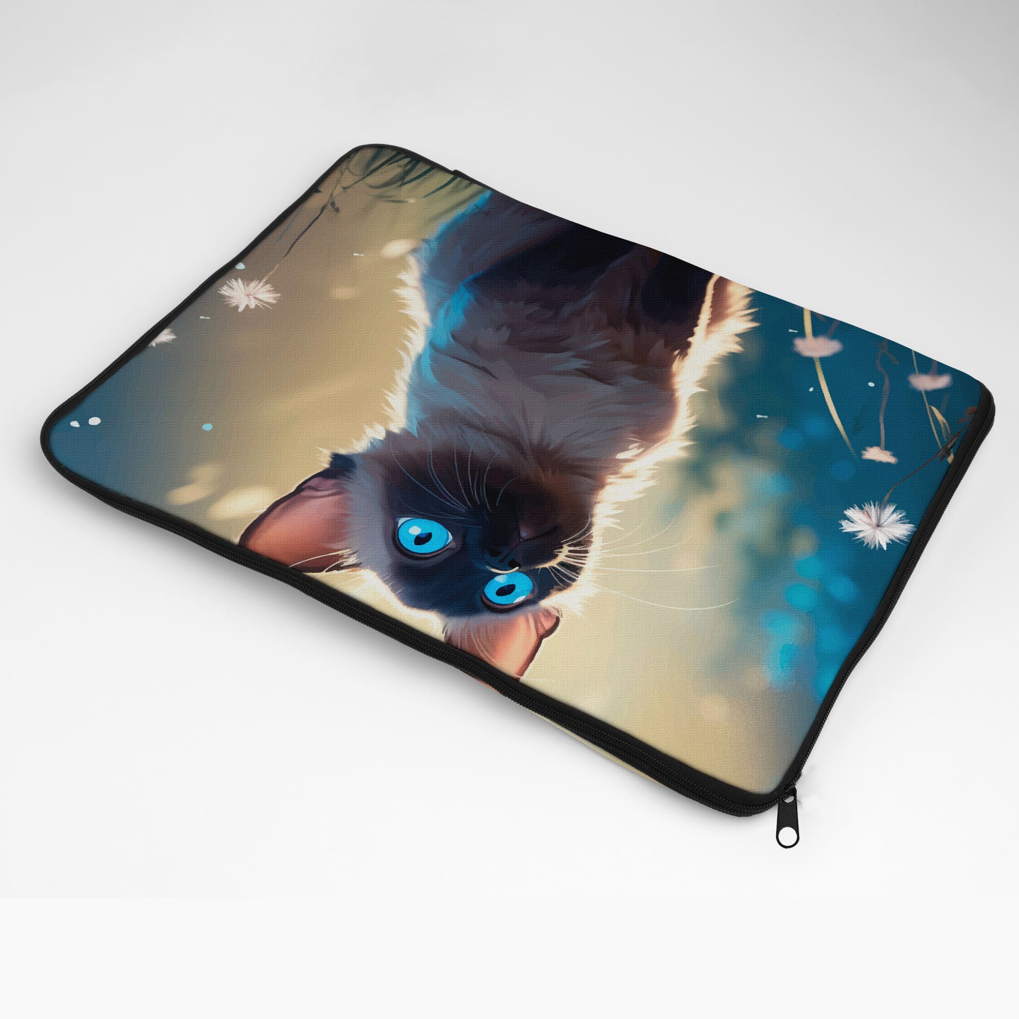 The Infidu Siamese Cat Blue Eyes Magical Laptop Sleeve features a stunning image of a Siamese cat, renowned for its beautiful blue eyes. The sparkling particles and soft-focus background in different shades of blue make the scene feel magical and dreamlike. This stunning pattern is ideal for people who love cats and prints that stand out. Because it is made of strong fabric, this laptop sleeve protects your laptop well and gives it a stylish look. This is a must-have for cat lovers and people who like unique, artsy accessories!