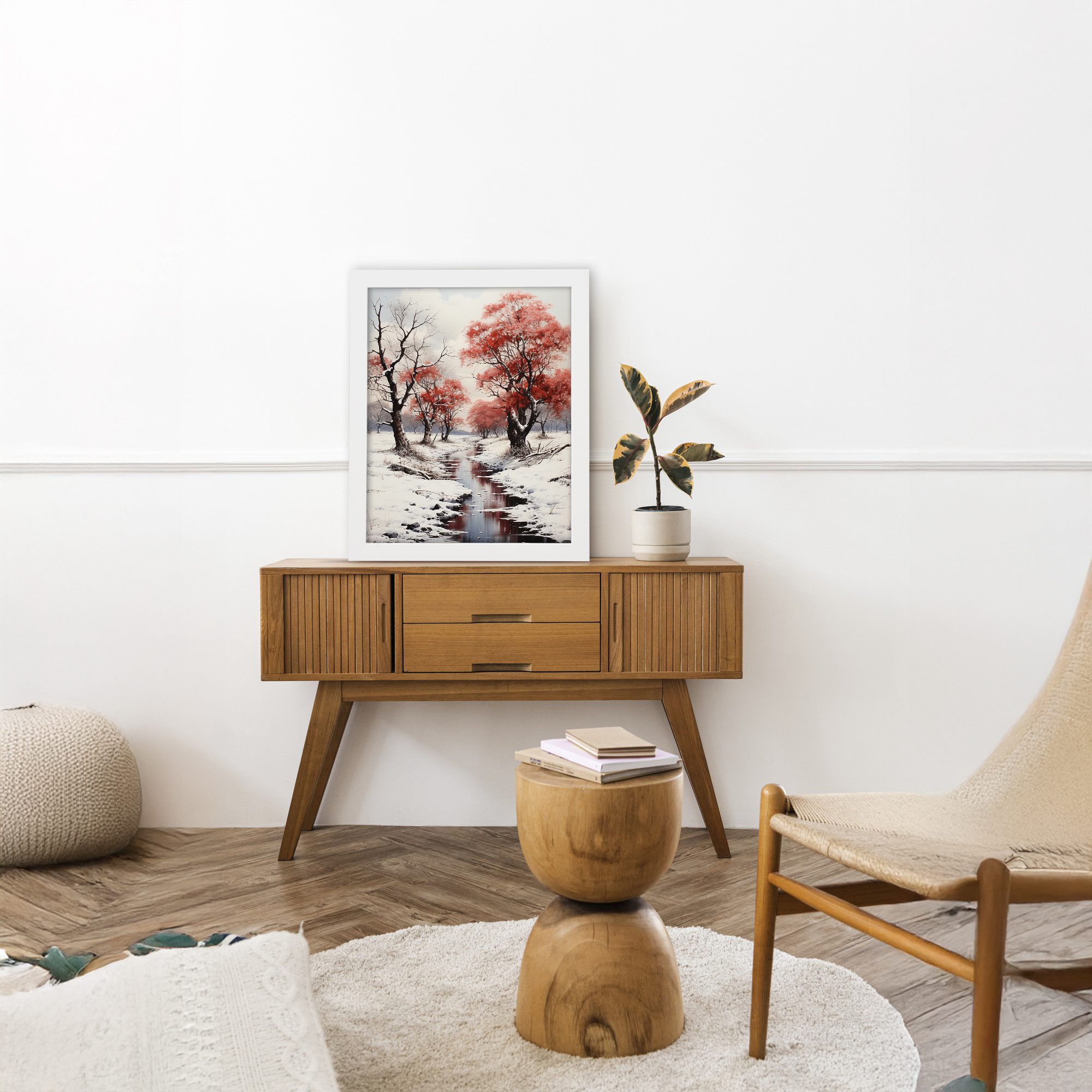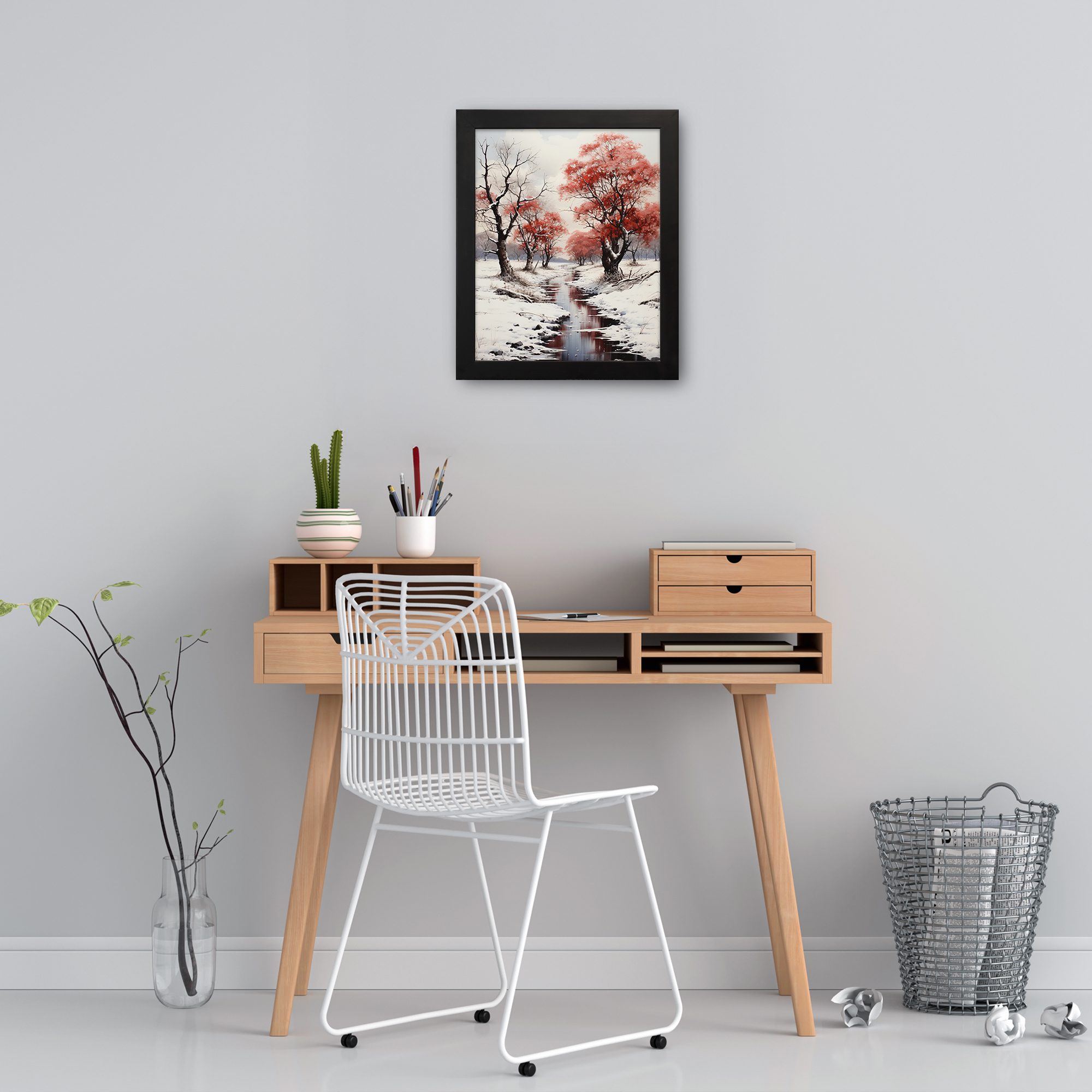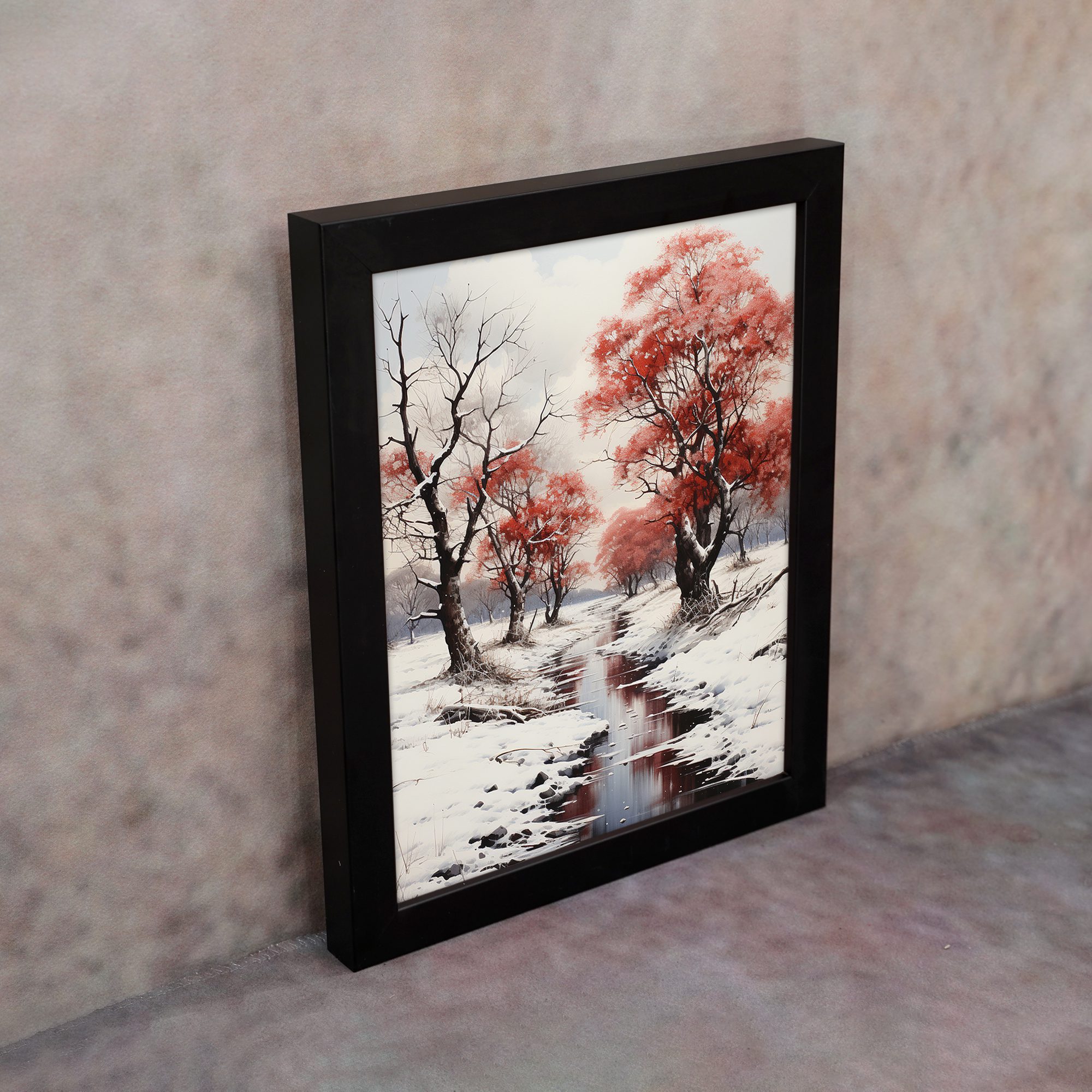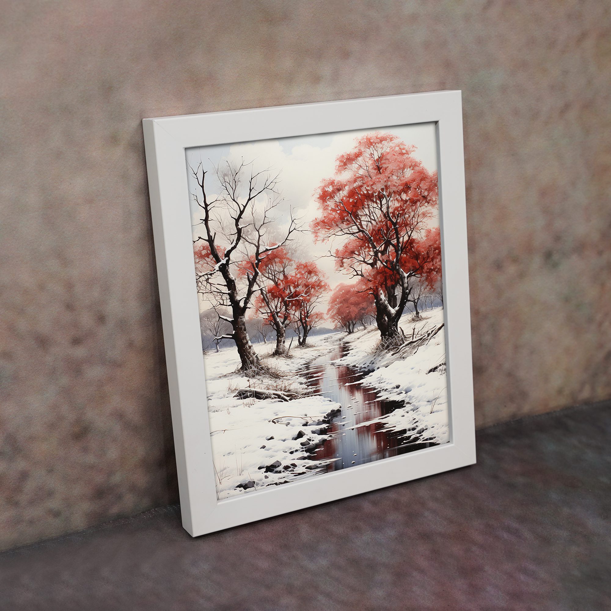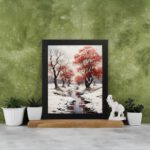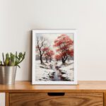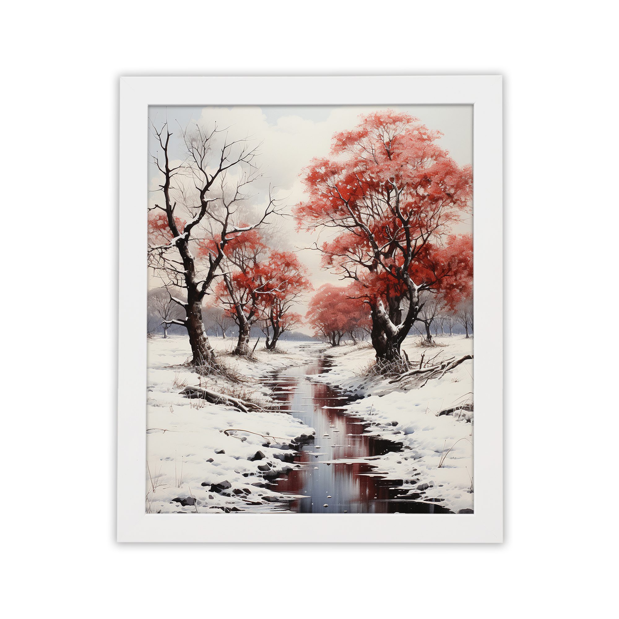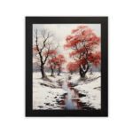 Create a calm and peaceful atmosphere in your space with this Snow Red Tree River Wall Art. This artwork features a quiet winter scene with snow-covered ground, a flowing river, and striking red trees that stand out beautifully against the soft white background.