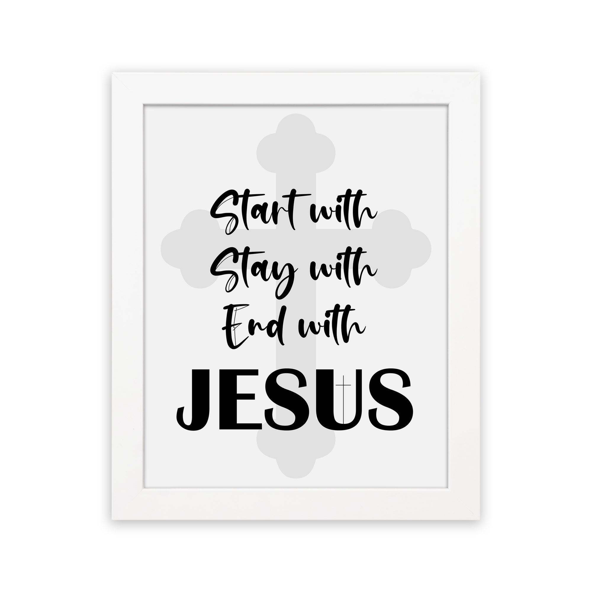 The “Start With Jesus, Stay With Jesus, End With Jesus” Bible Wall Art from Infidu will bring a strong message of faith into your home. This beautiful design has big black letters on a white background. There is a light gray cross behind the words to give them more depth and meaning. It draws attention to the main point of the message by making the word “Jesus” stand out in a bigger, bolder font. Skilled digital artists created this wall art, which would look great in any Christian home. This beautiful piece of Christian wall art is a great way to remember your faith or to give it as a gift to someone you care about. This piece will give your living room, bedroom, or office a spiritual touch, no matter where you put it. Buy Bible verse wall art to motivate yourself and other people.