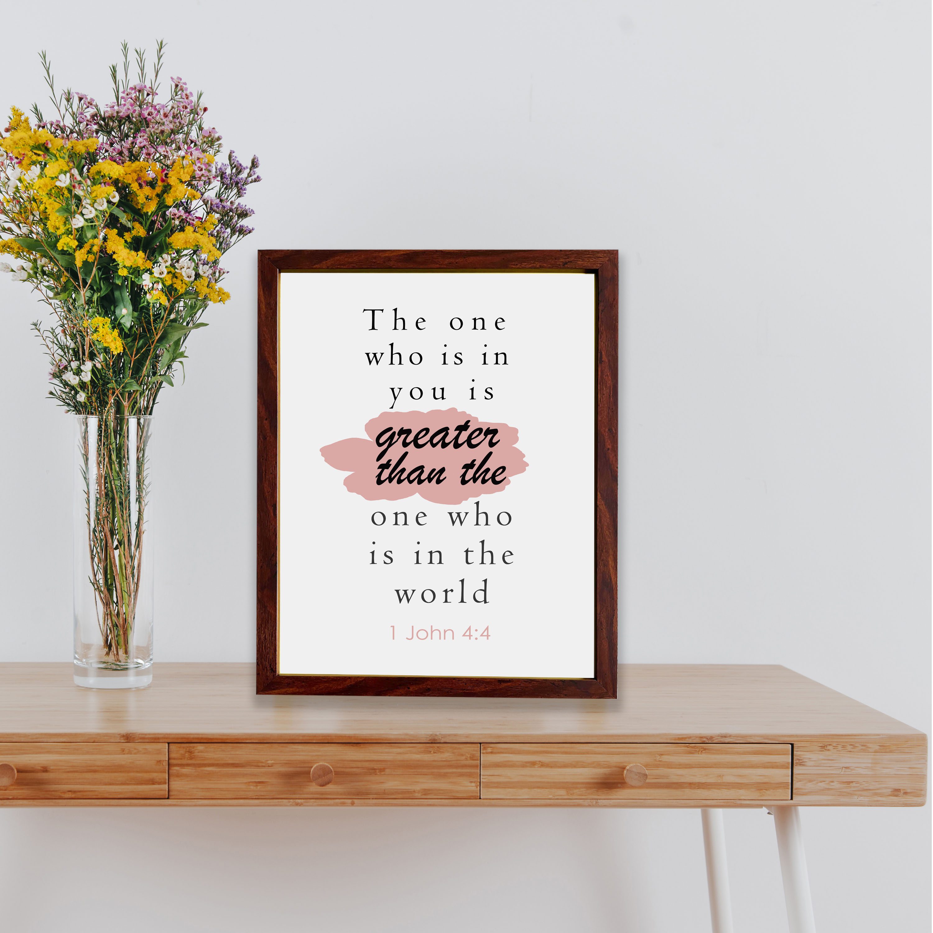 Adding an Infidu to any room is a guaranteed way to make a statement. Embrace the One Within You; They Outweigh All Others in the World. Scripture Wall Art 1 John 4:4. Behind the strong words, “The one who is in you is greater than the one who is in the world,” this minimalist design showcases a gentle pink brushstroke on a white background. The phrase, written in a striking black typeface, will serve as a motivational showpiece in any setting. Beautifully crafted by skilled digital artisans, this Christian wall art will grace any room. Shop today for Bible verse wall art that will elevate your environment and spirit, whether you’re searching for a way to inspire faith or if you’re just looking for the perfect gift!