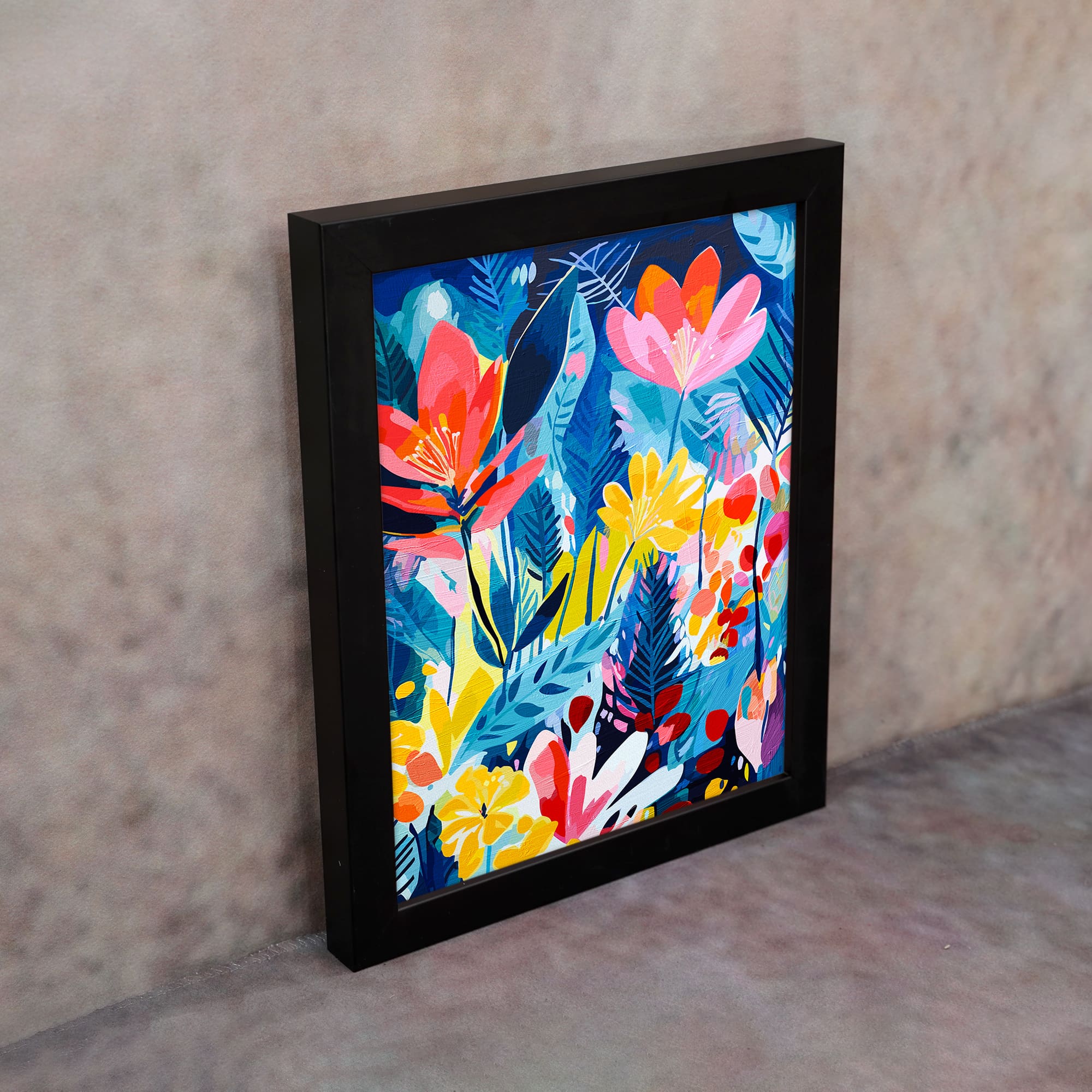Inspired by floral paintings art, the artwork uses bold shapes and layered colors to create depth and movement. The dark background enhances the brightness of the flowers, making it a perfect statement piece for any wall.