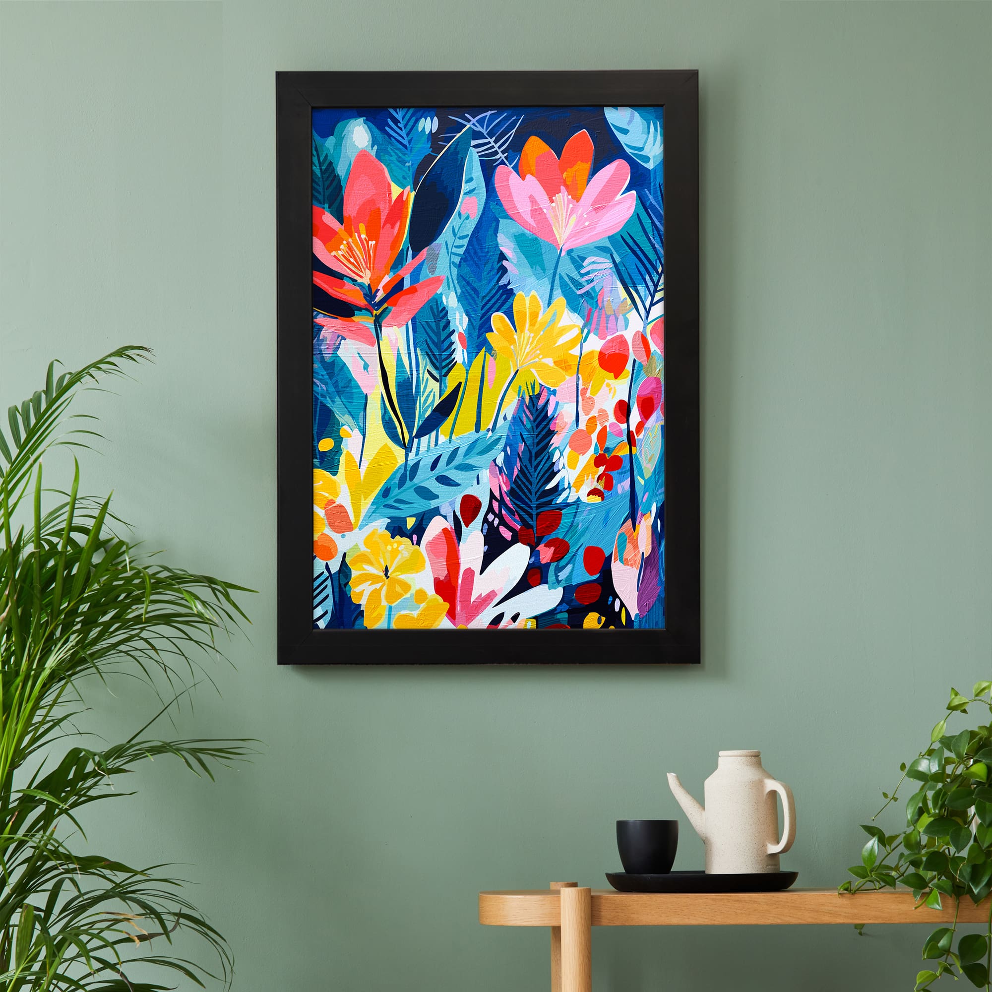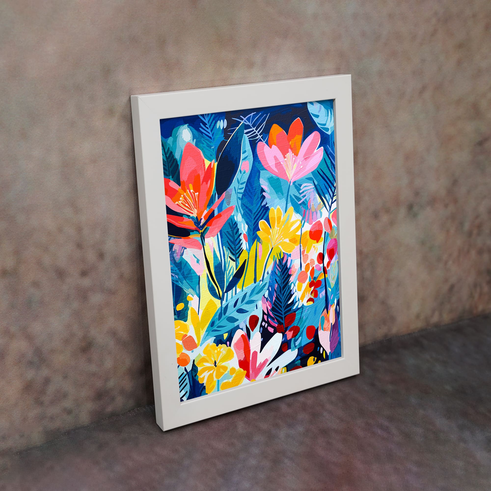Add a bold and stylish touch to your space with this Tropical Floral Night Wall Art. This artwork features vibrant flowers and leafy patterns set against a deep blue background, creating a striking contrast. The mix of bright colors like pink, yellow, red, and blue gives the design a lively and modern feel.