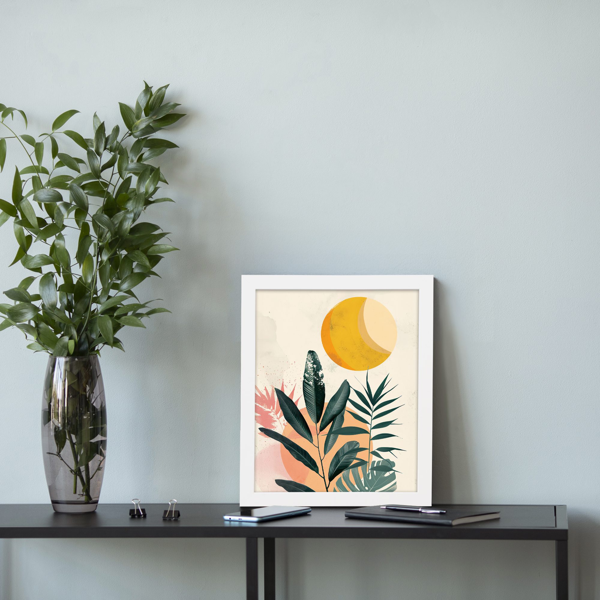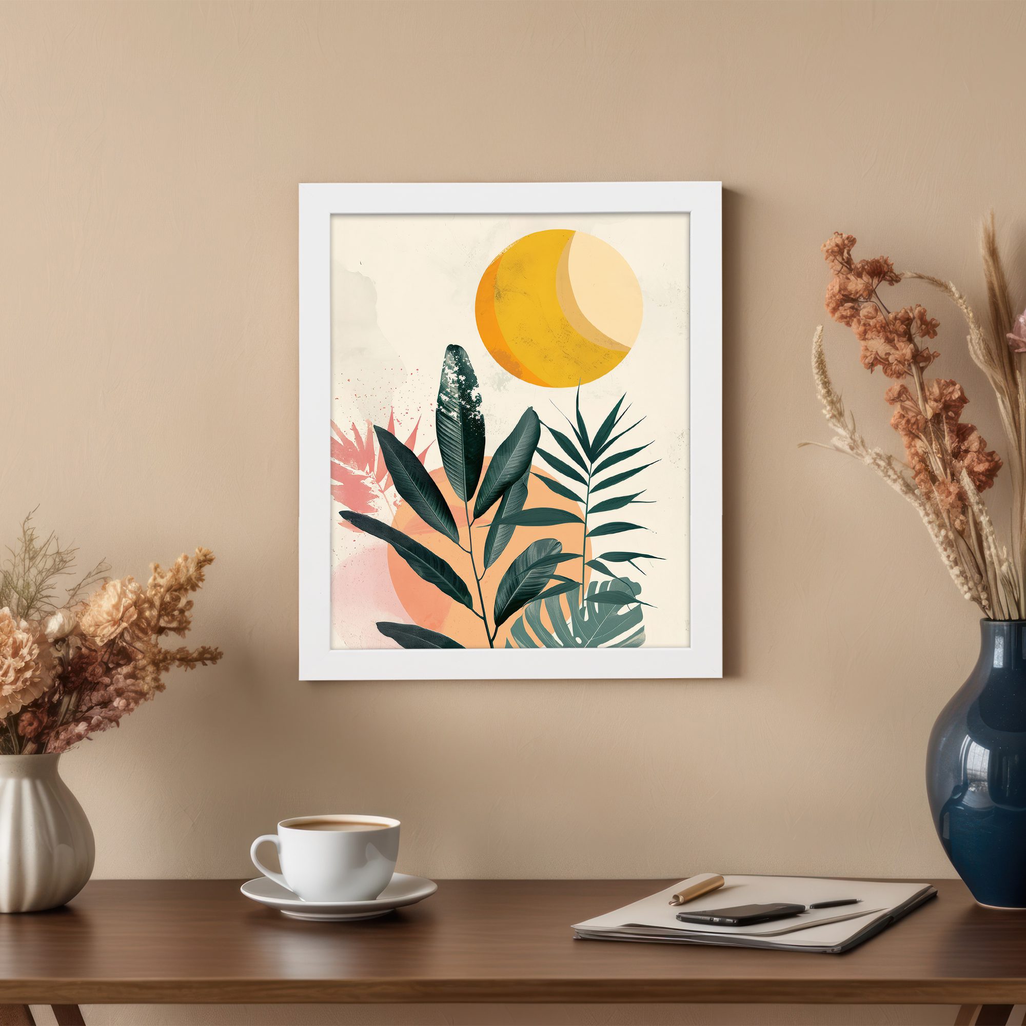 Bring a warm and refreshing feel to your home with this Kotart aesthetic modern wall art. This artwork features tropical leaves combined with a soft glowing sun in the background, creating a natural and calming look. The blend of earthy tones and simple shapes makes it perfect for modern interiors.