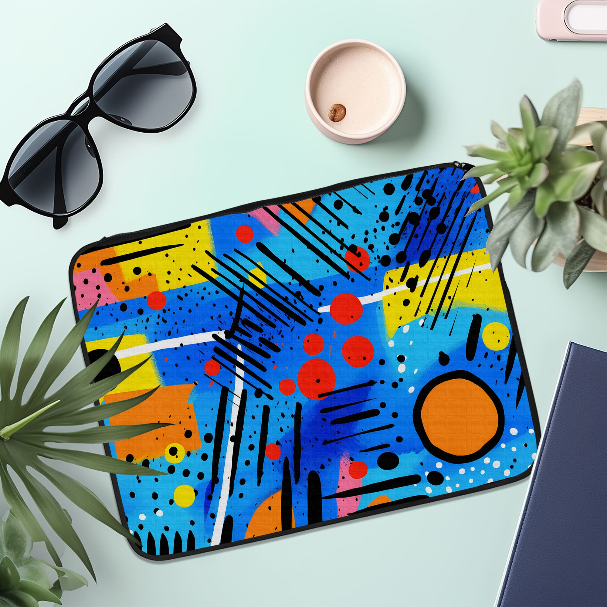 The Infidu Vibrant Abstract Geometric Pattern Laptop Sleeve gives your laptop a colorful and artistic look. There are bright blue shapes on a yellow, pink, orange, black, and red background that make this sleeve very lively. Lines, dots, and different geometric shapes give the design a unique, modern look. Skilled digital artists crafted this robust fabric sleeve to effectively protect your laptop. It has a safe zipper closure and is great for people who want a stylish laptop bag, a fabric laptop sleeve, or a laptop sleeve with a zipper!