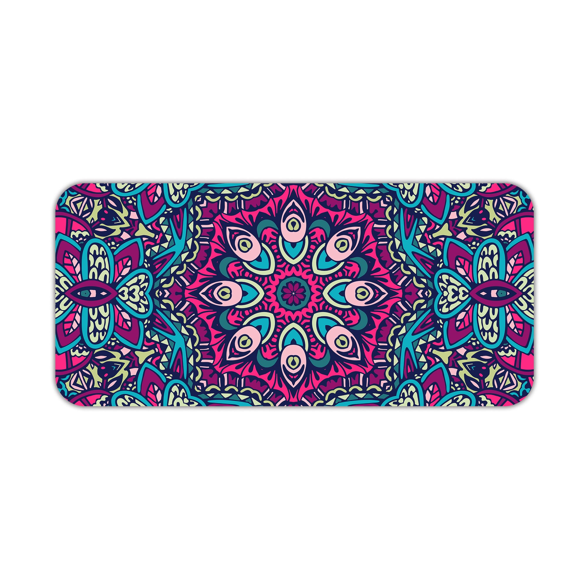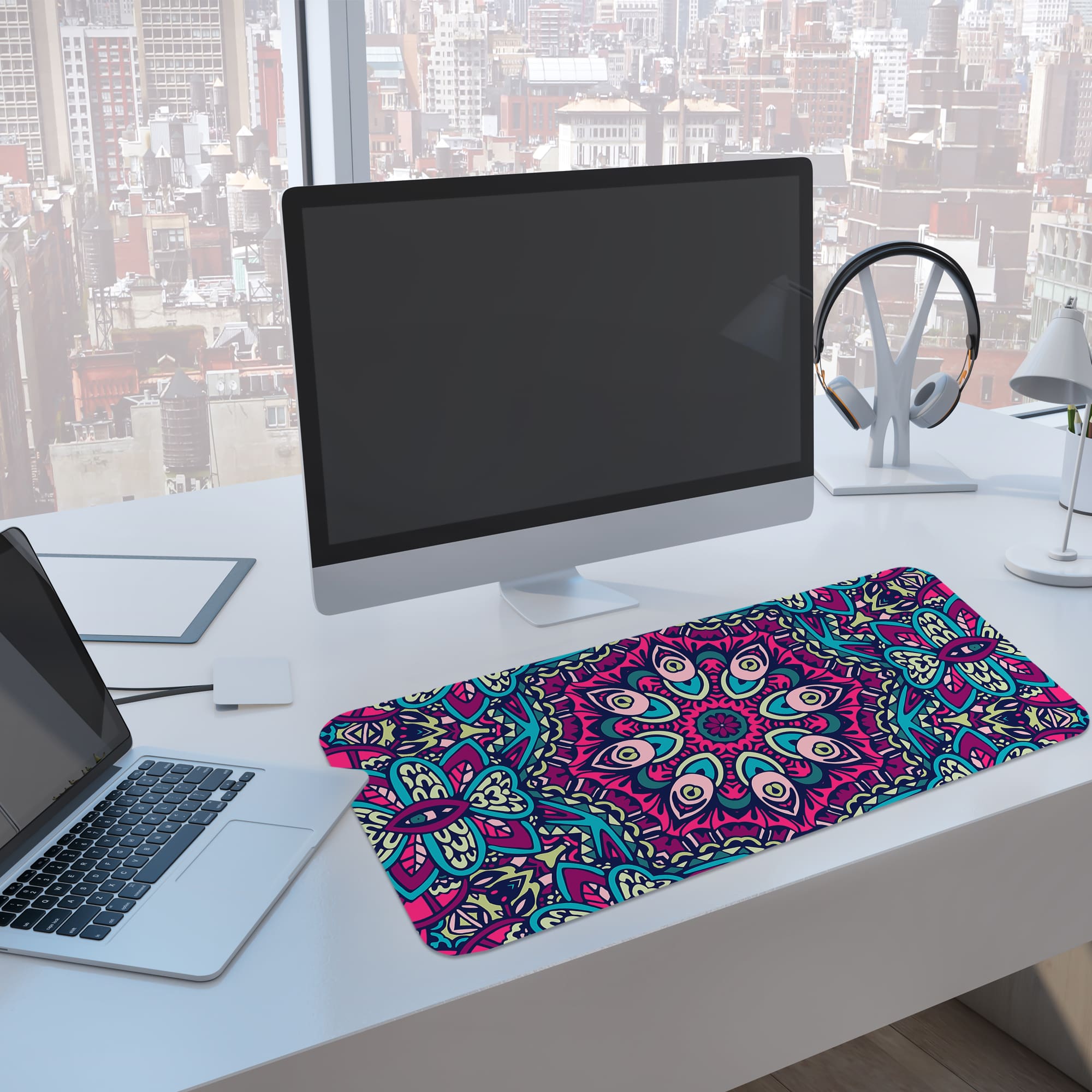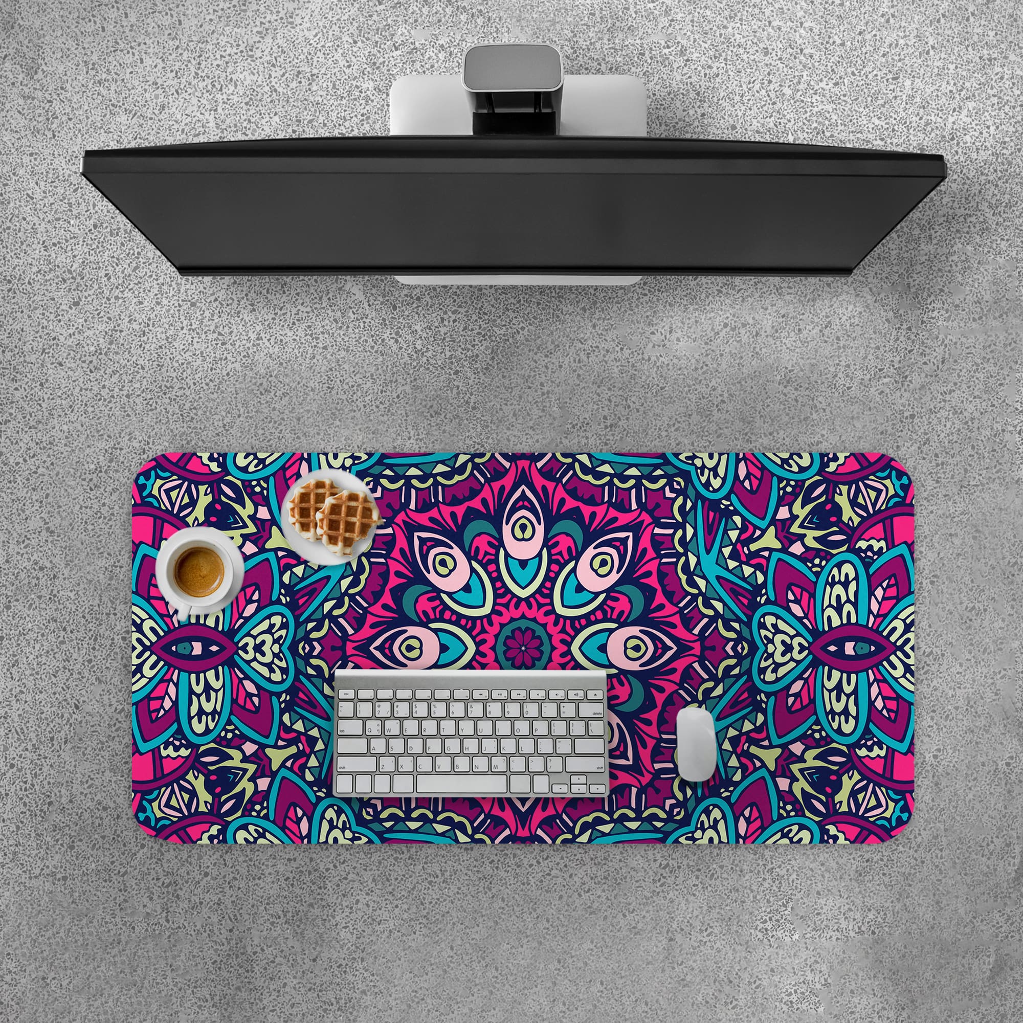 Bring energy and creativity to your workspace with this Vibrant Boho Mandala Desk Mat. The design features a bold and detailed mandala pattern with striking shades of pink, teal, blue, and purple, creating a visually captivating and balanced composition.