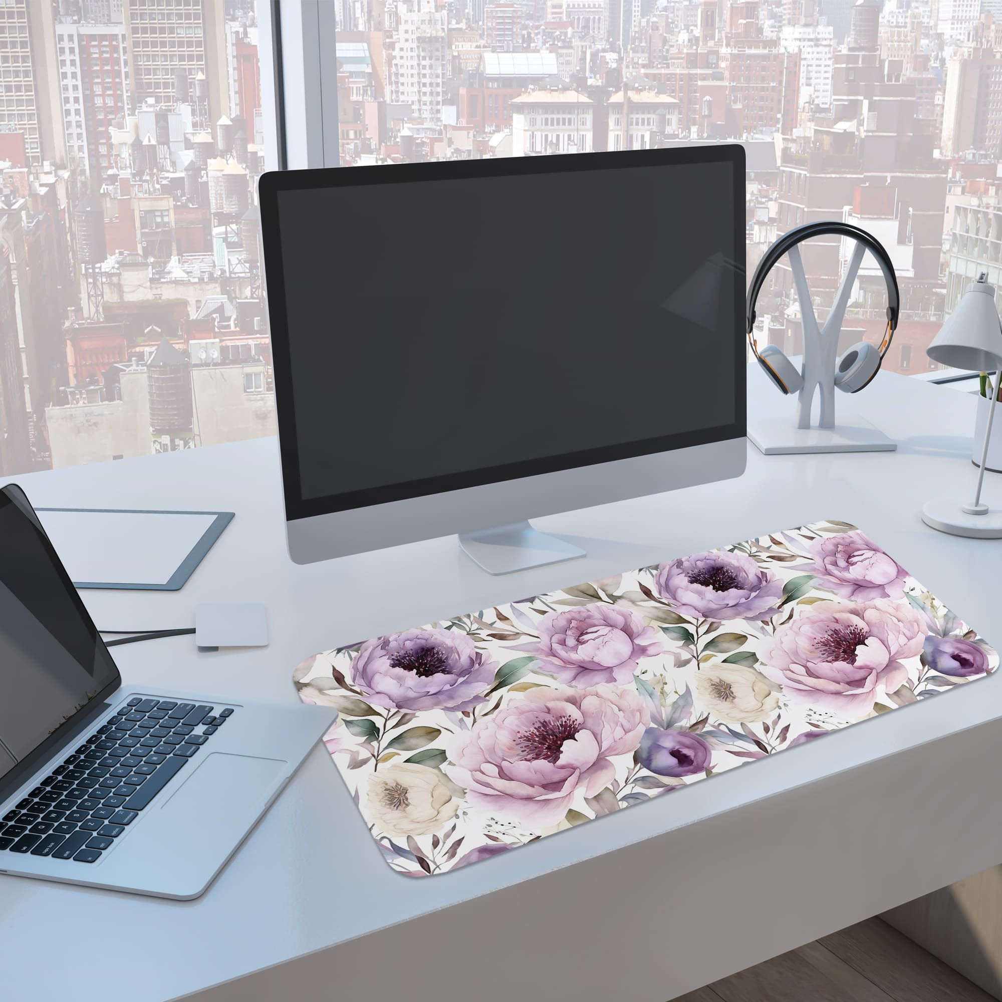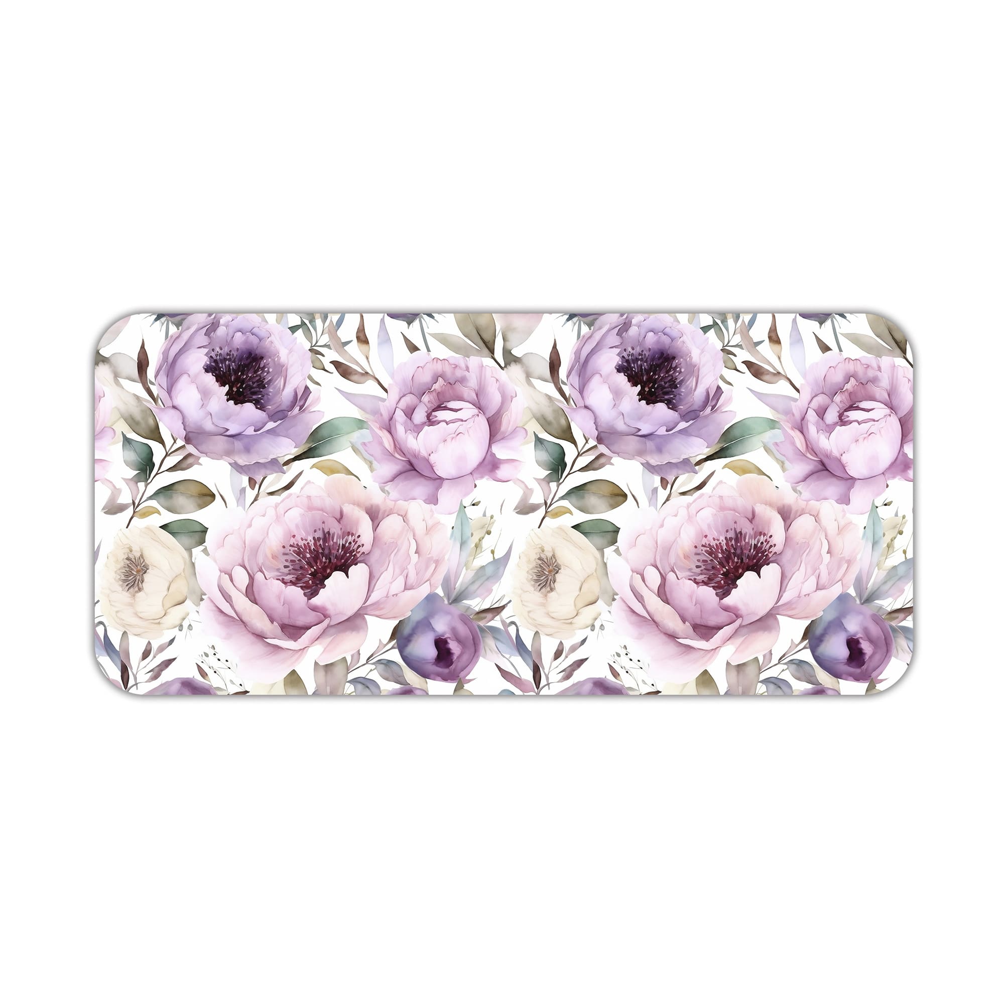 Add timeless charm to your workspace with this Vintage Peony Floral Desk Pad. The design features a blend of soft purple, blush pink, and cream-toned peony flowers, combined with muted green leaves for a classic botanical look. The composition creates a warm and elegant atmosphere on your desk.